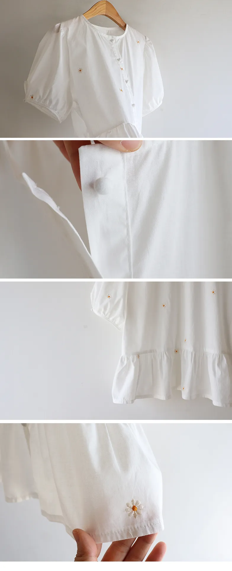 【明亮純淨~雛菊花刺繡排扣上衣♥】【可愛A字輪廓完美遮蓋身形~】【可愛圓泡泡袖】