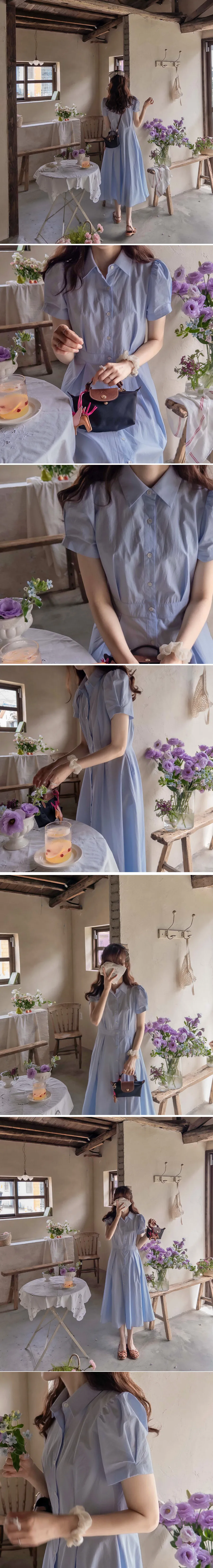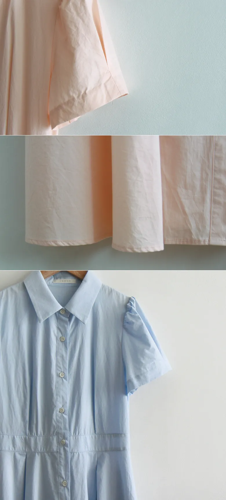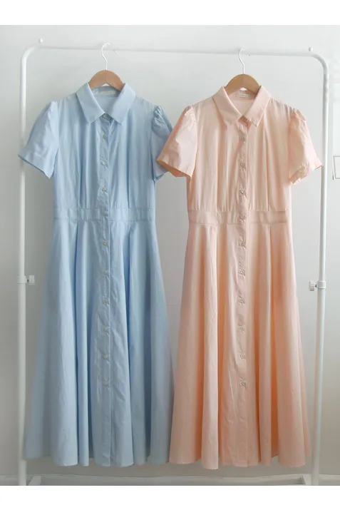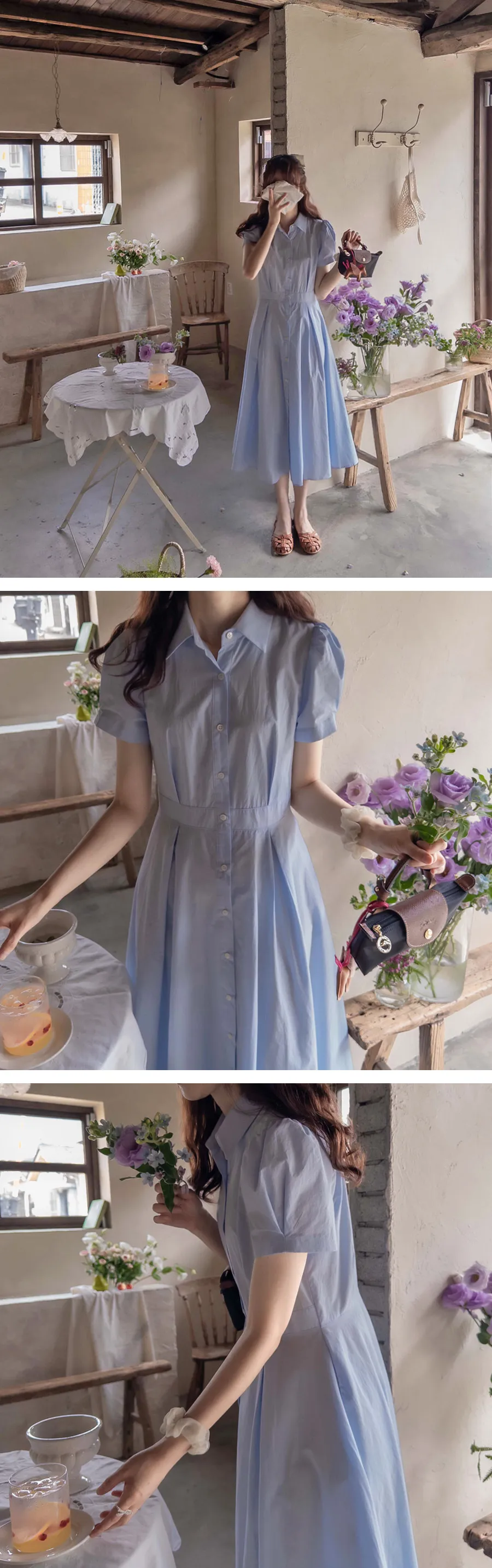 [可開閉排扣][帶有細褶袖和肩部剪裁的泡泡袖][透過腰部開衩剪裁完成邊緣貼合][用明亮的夏日色彩營造出迷人的氛圍][適合夏季的邊緣貼合洋裝][優雅又營造出歡快的合身][強烈推薦作為活潑明亮的連身裙]