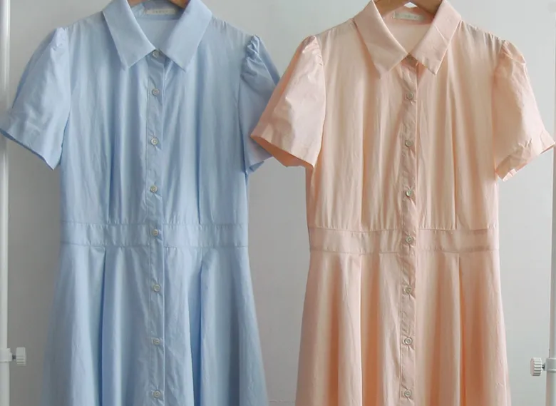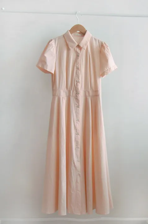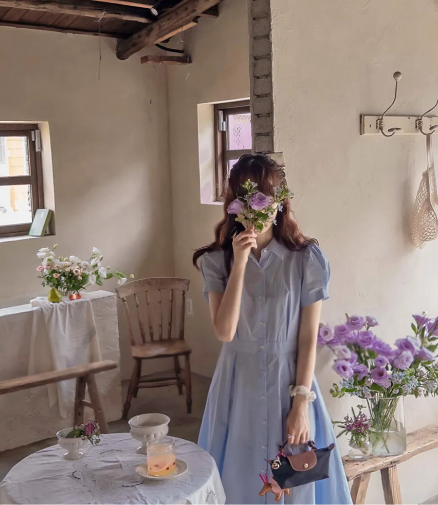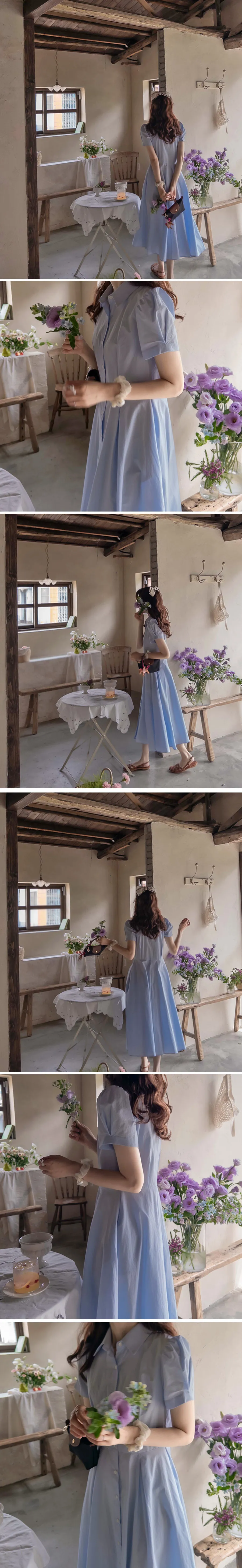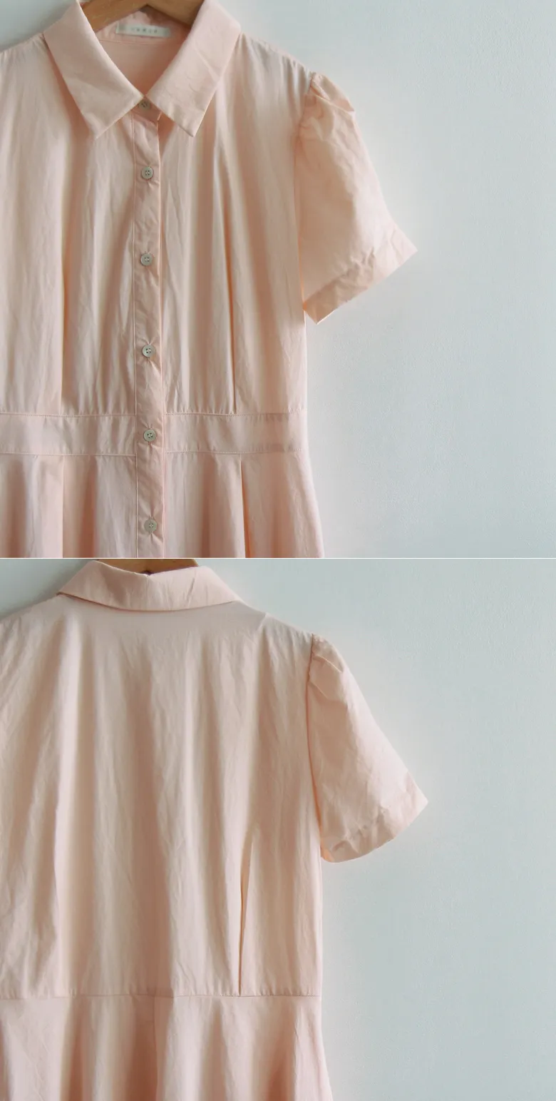[可開閉排扣][帶有細褶袖和肩部剪裁的泡泡袖][透過腰部開衩剪裁完成邊緣貼合][用明亮的夏日色彩營造出迷人的氛圍][適合夏季的邊緣貼合洋裝][優雅又營造出歡快的合身][強烈推薦作為活潑明亮的連身裙]