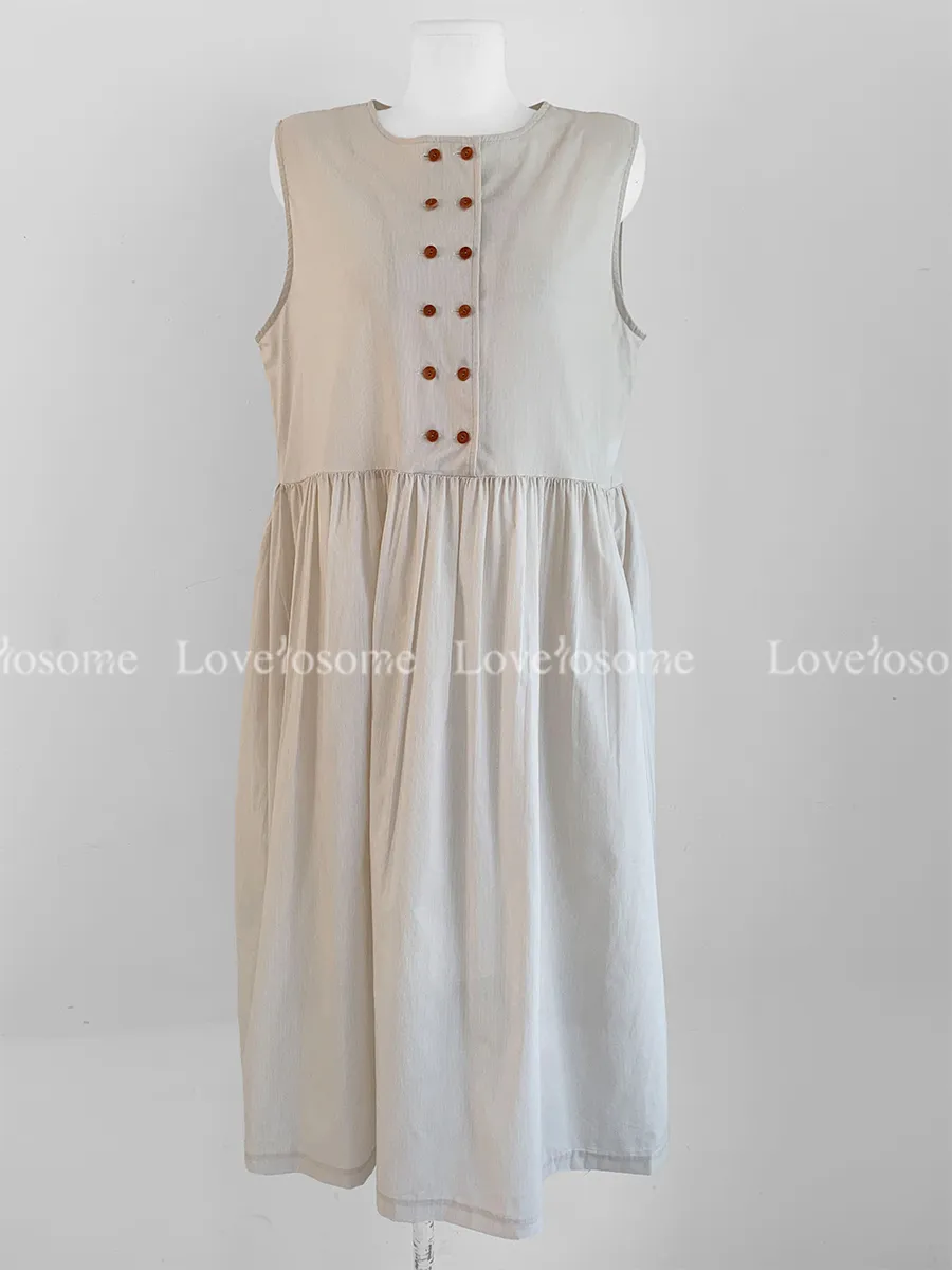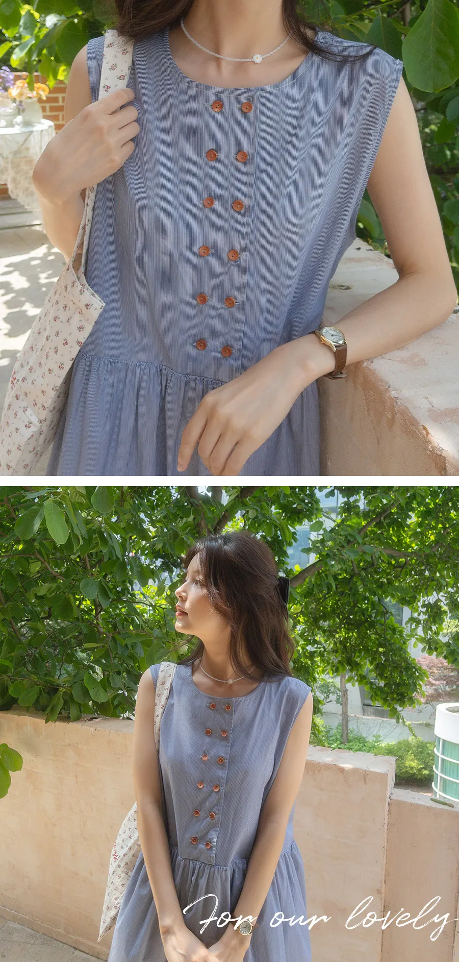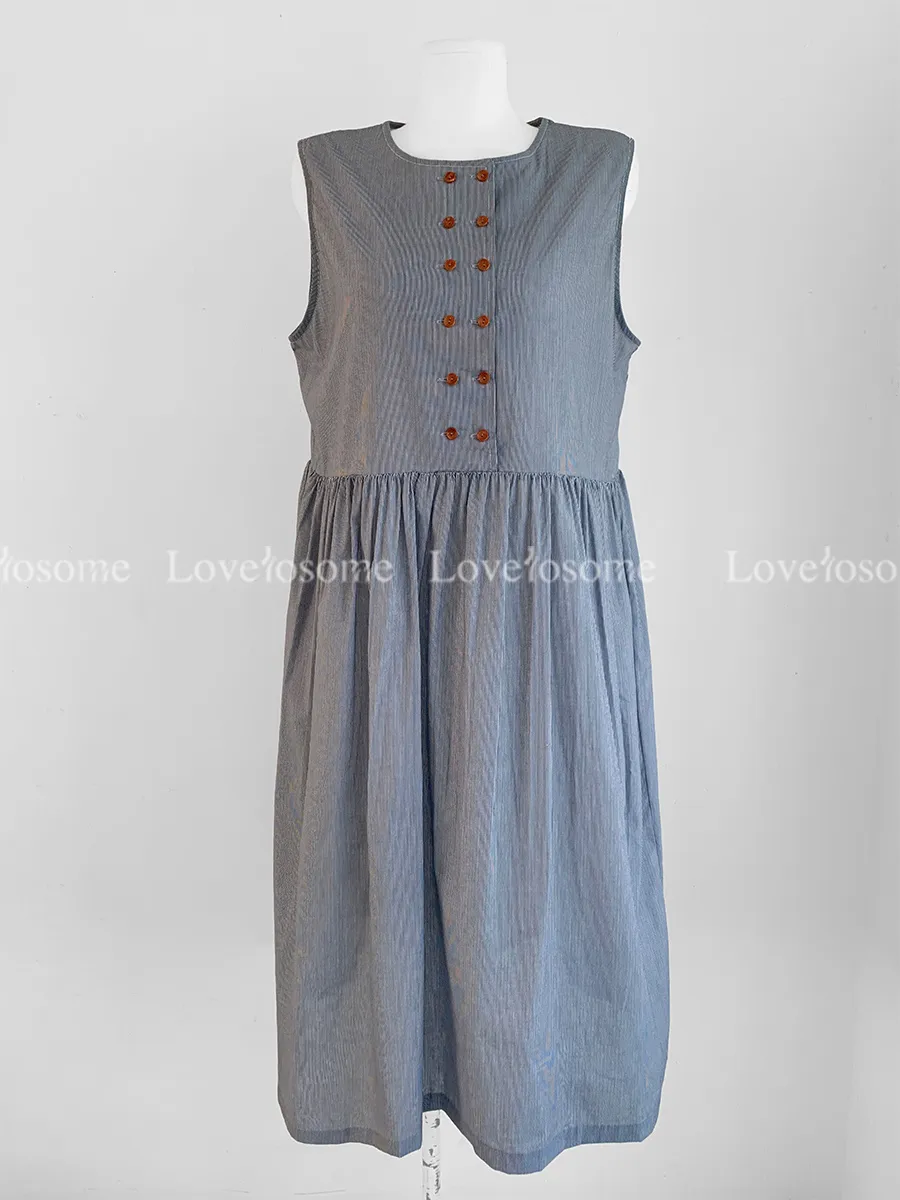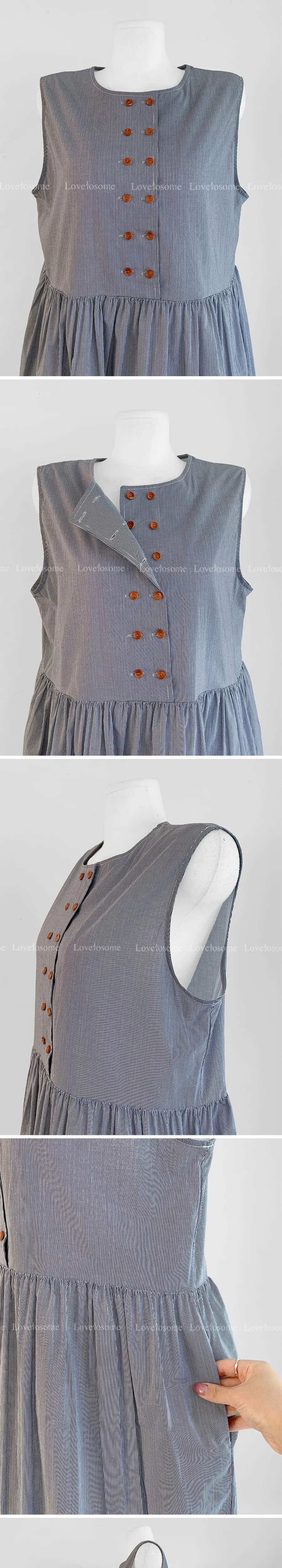 雙排扣無袖長連身裙,有一種復古的魅力。棉質材料使其穿著舒適, 半圓領和長長的衣長打造出修長精緻的廓形,整體寬鬆的版型讓你毫無負擔地享受它。 細條紋圖案打造苗條的輪廓。 前排有一個雙餅乾色的排扣,給人一種更可愛的心情。