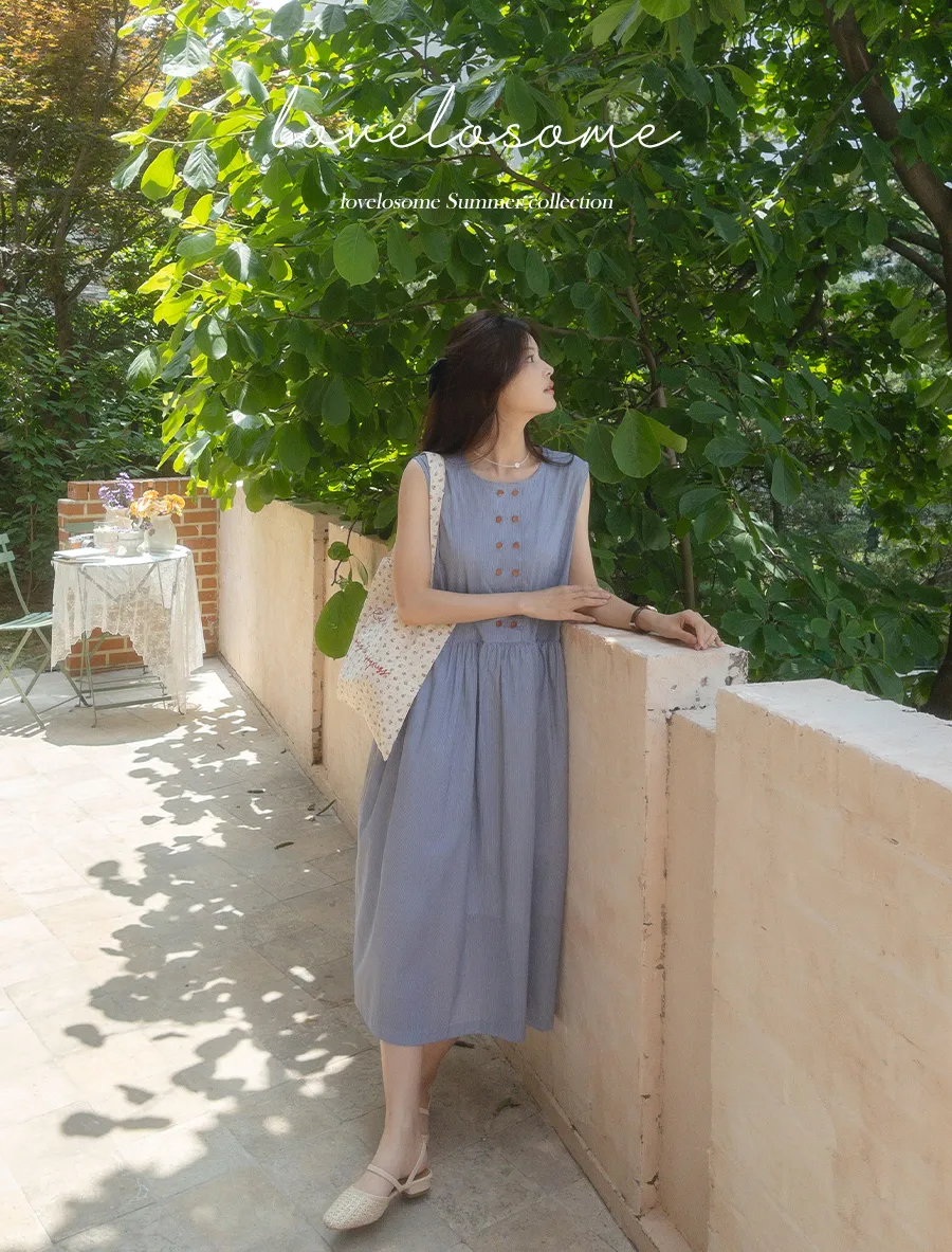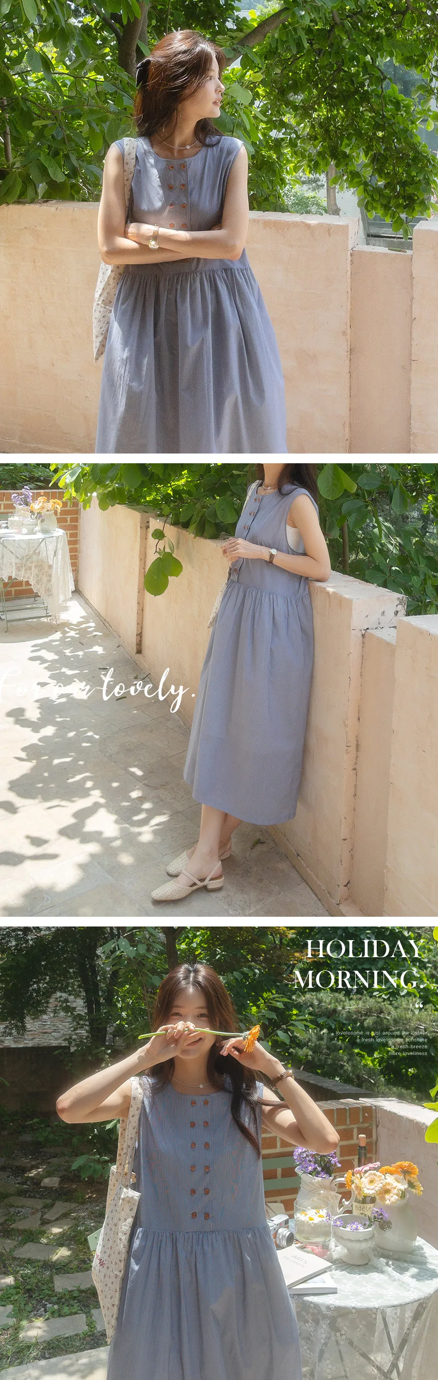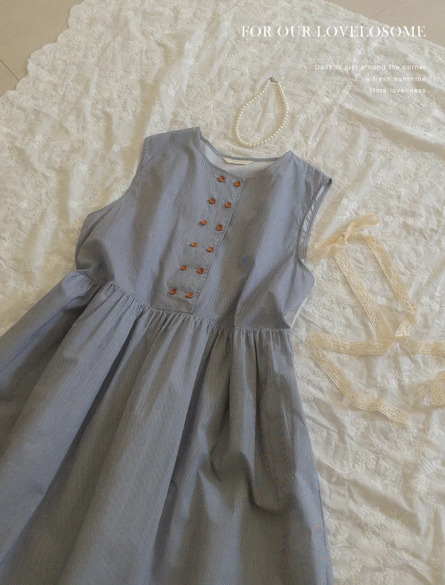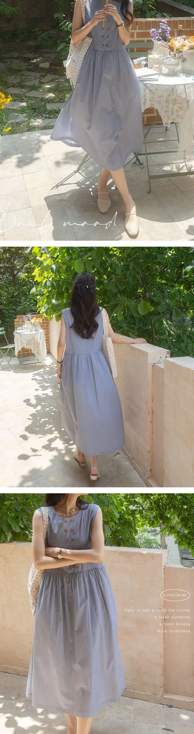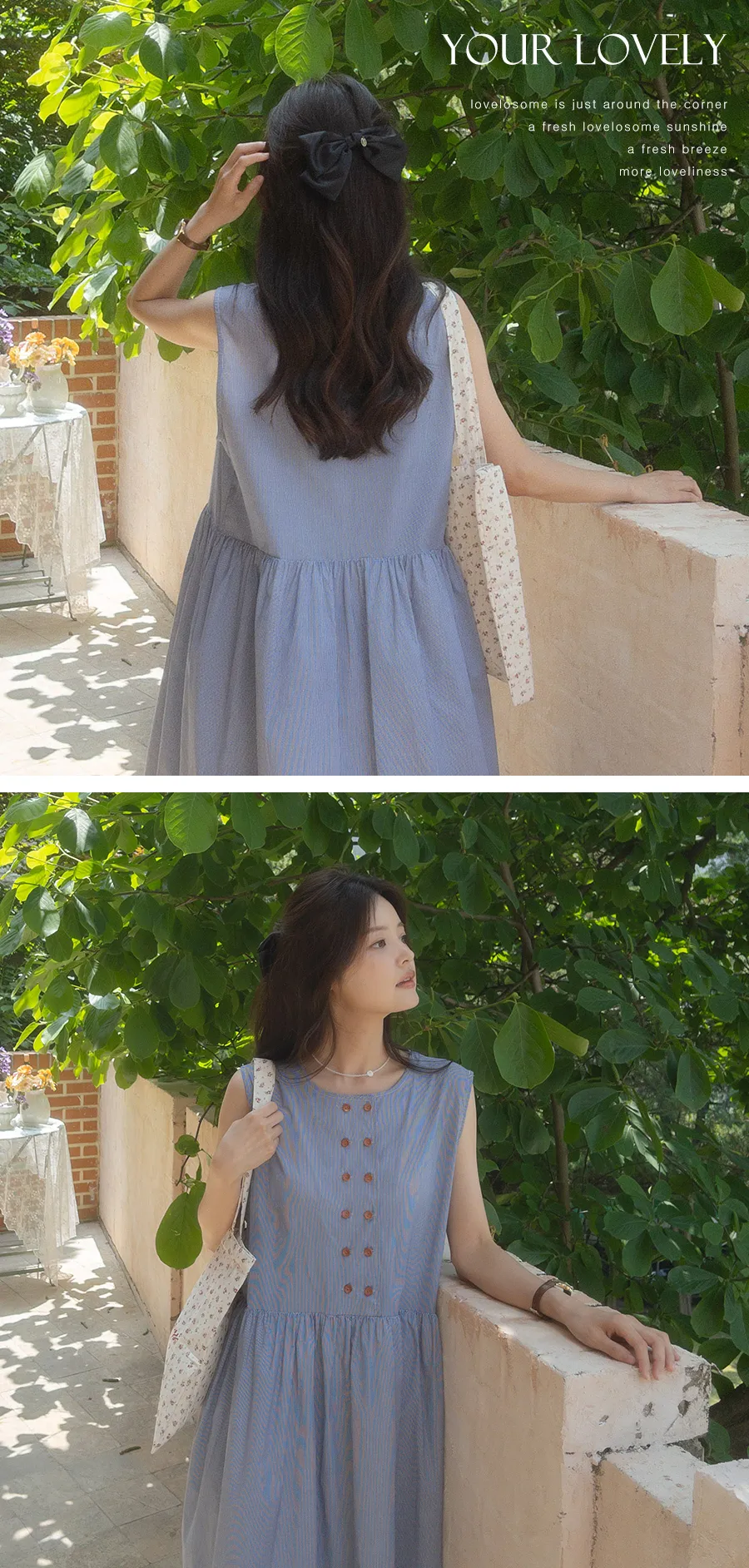 雙排扣無袖長連身裙,有一種復古的魅力。棉質材料使其穿著舒適, 半圓領和長長的衣長打造出修長精緻的廓形,整體寬鬆的版型讓你毫無負擔地享受它。 細條紋圖案打造苗條的輪廓。 前排有一個雙餅乾色的排扣,給人一種更可愛的心情。