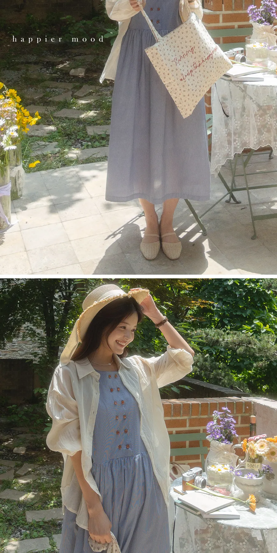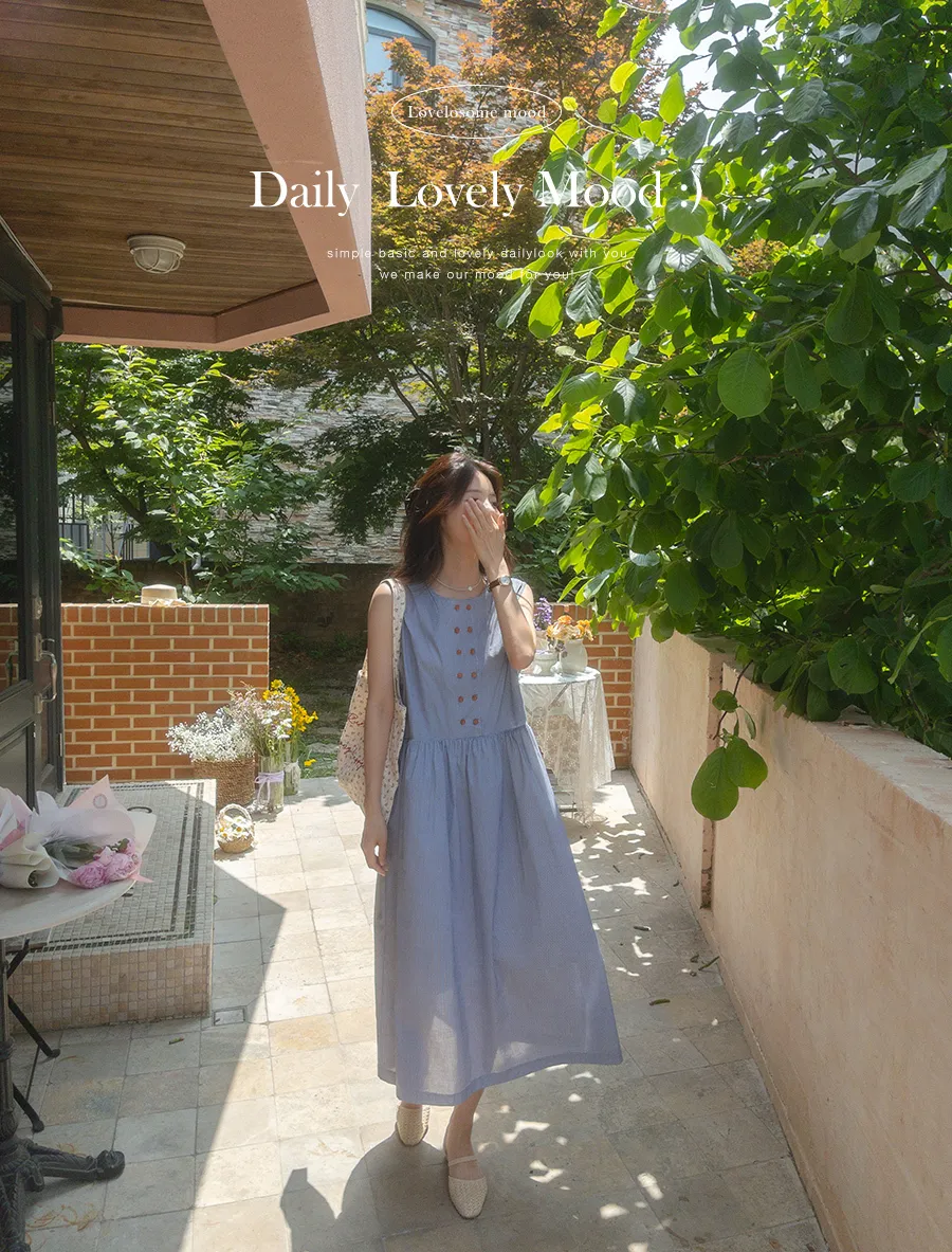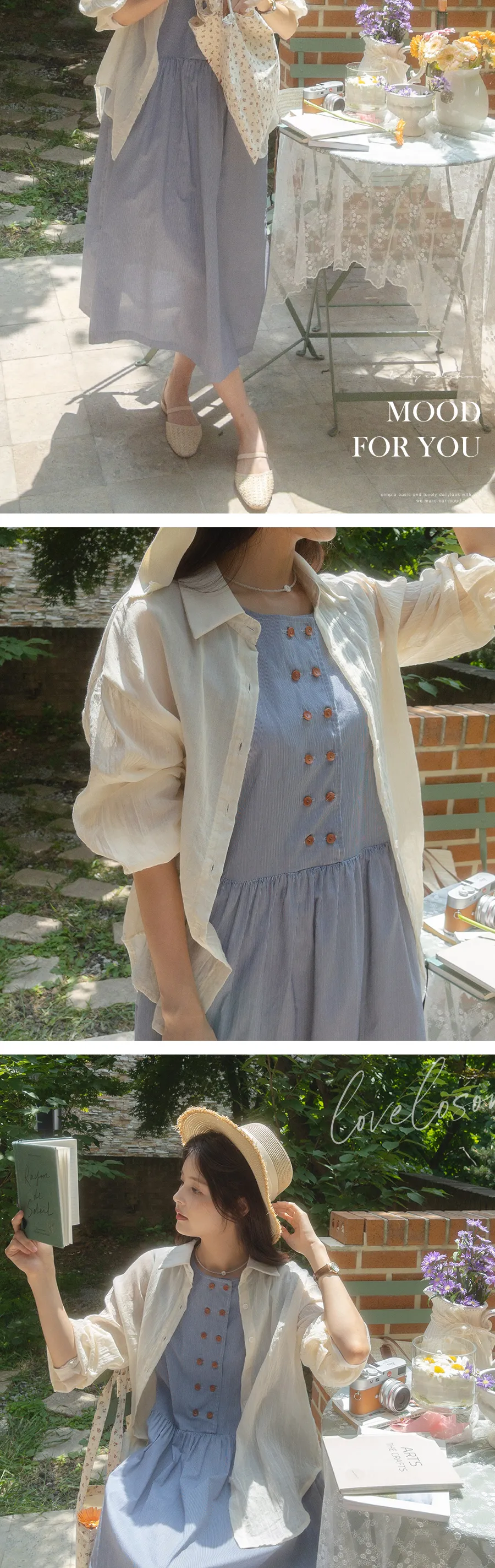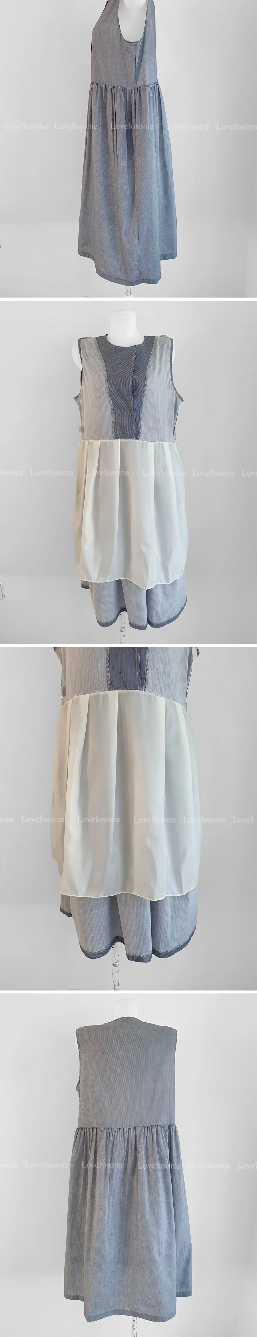 雙排扣無袖長連身裙,有一種復古的魅力。棉質材料使其穿著舒適, 半圓領和長長的衣長打造出修長精緻的廓形,整體寬鬆的版型讓你毫無負擔地享受它。 細條紋圖案打造苗條的輪廓。 前排有一個雙餅乾色的排扣,給人一種更可愛的心情。