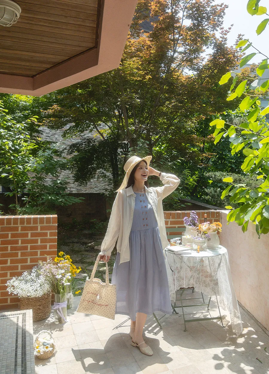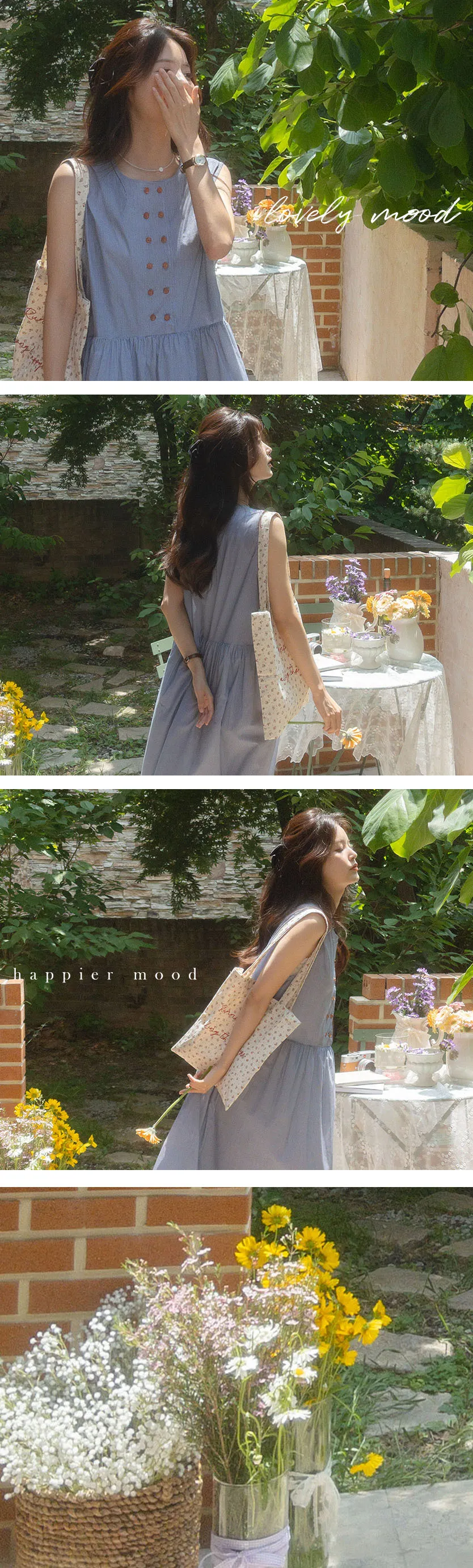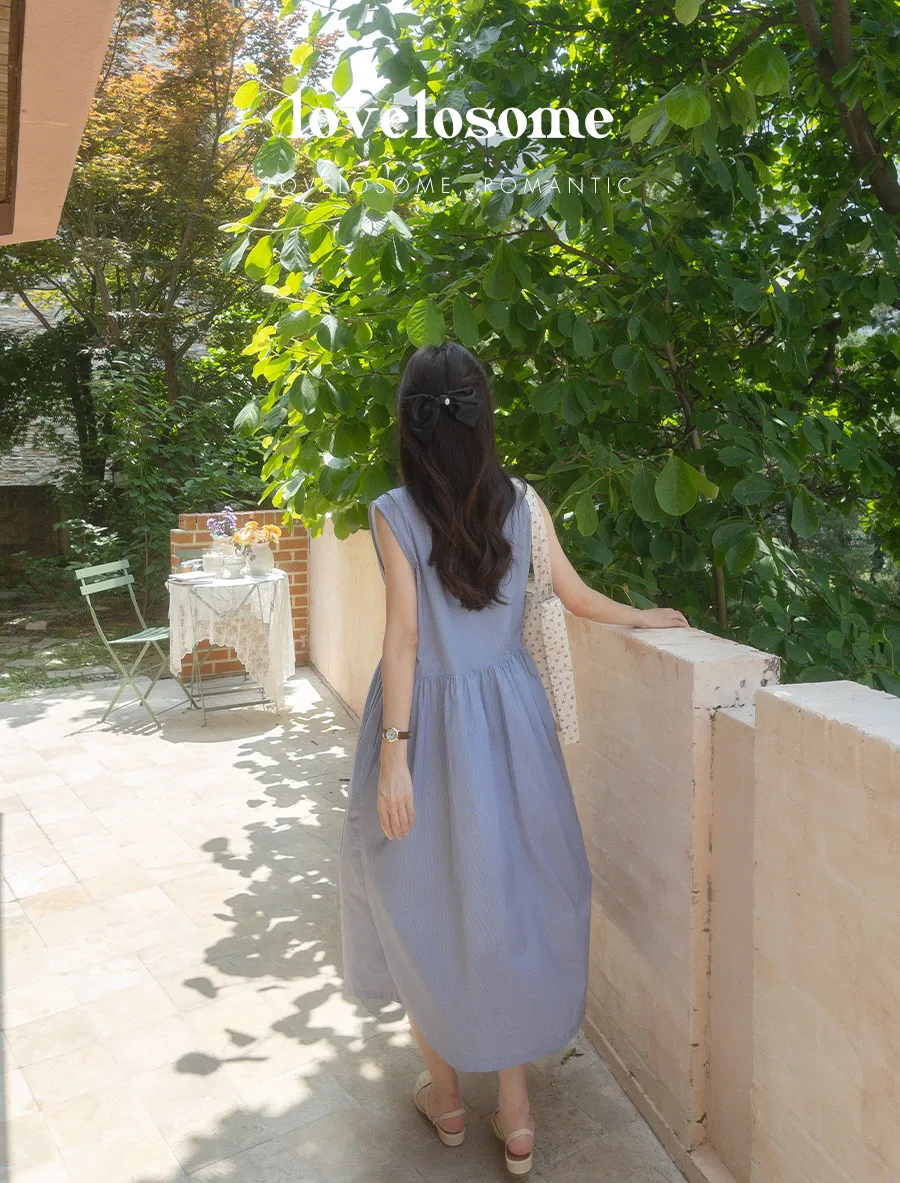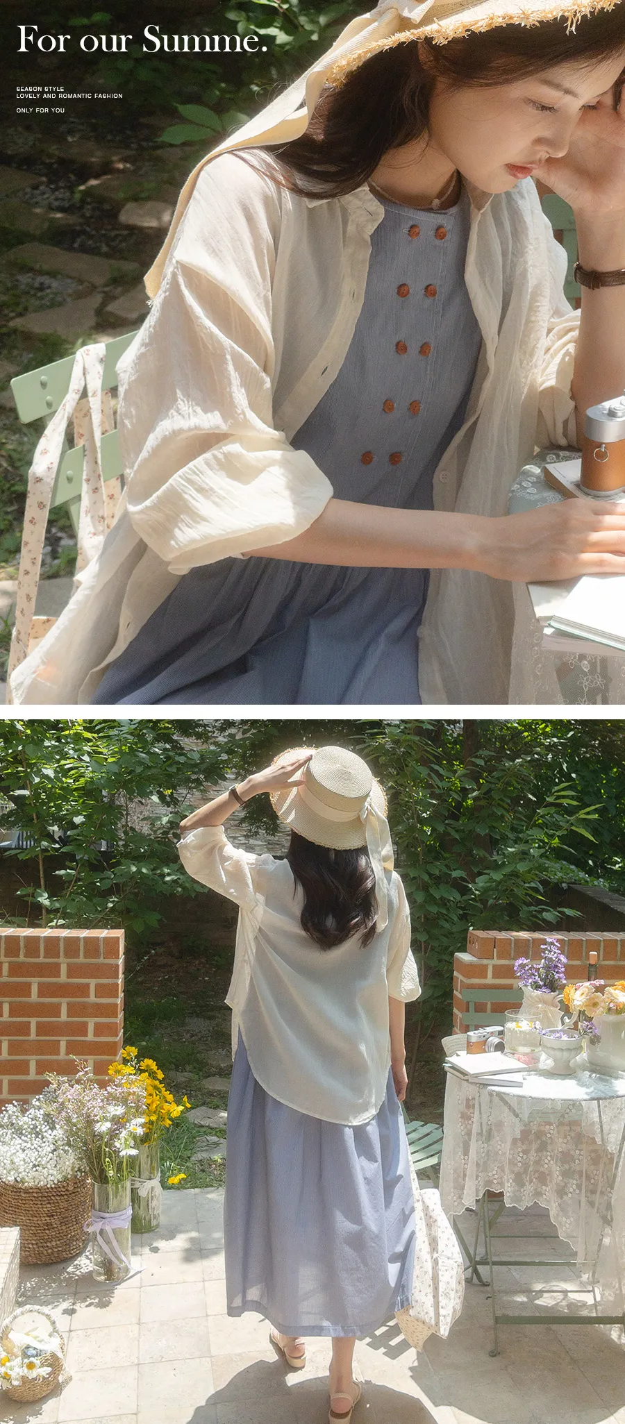 雙排扣無袖長連身裙,有一種復古的魅力。棉質材料使其穿著舒適, 半圓領和長長的衣長打造出修長精緻的廓形,整體寬鬆的版型讓你毫無負擔地享受它。 細條紋圖案打造苗條的輪廓。 前排有一個雙餅乾色的排扣,給人一種更可愛的心情。