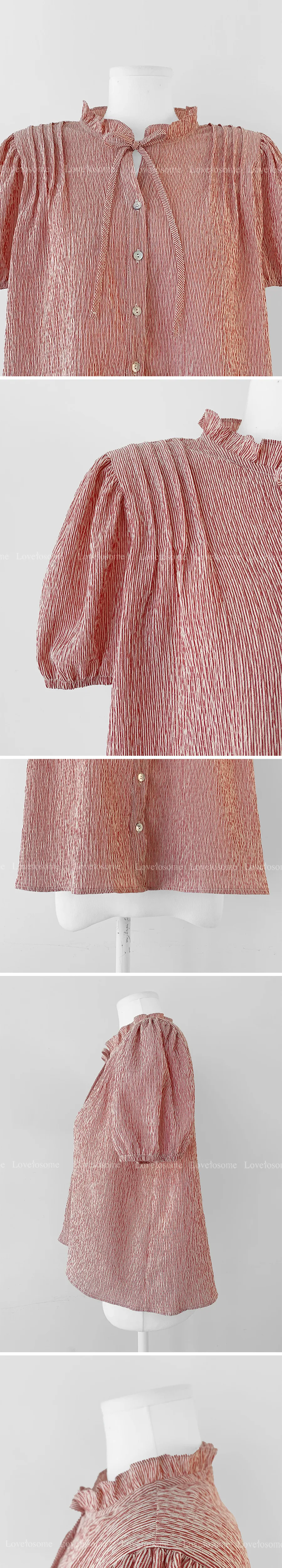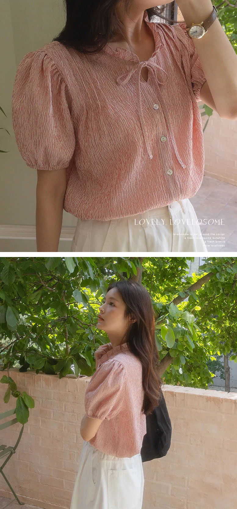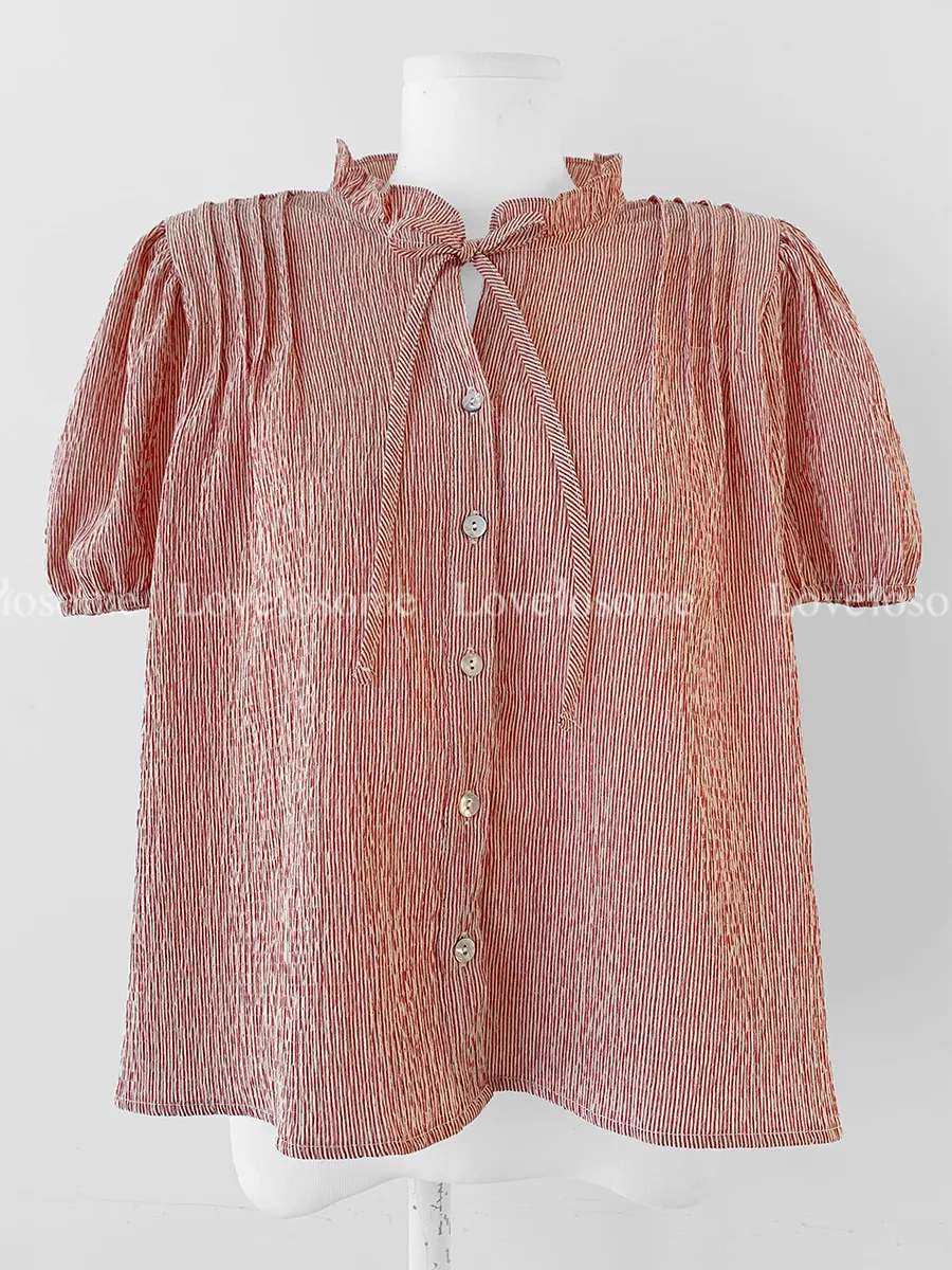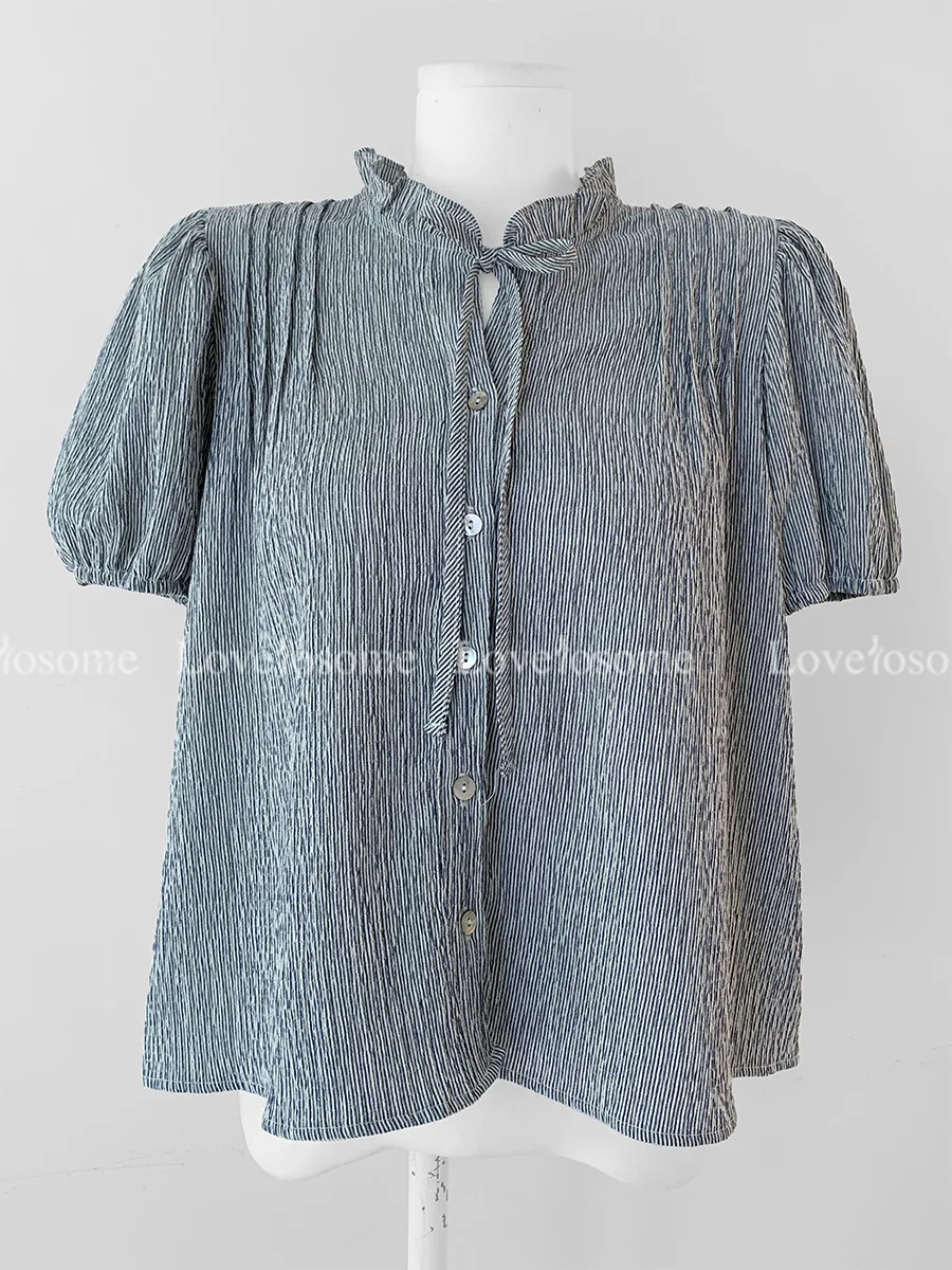 褶邊領口泡泡細褶排扣上衣,材質柔軟,採用褶邊領口設計和緞帶細節,賦予其精緻的氛圍。 正面的針摺細節和修飾肩部設計讓上身修身:) 袖帶線提供舒適貼合感,非常適合日常穿搭。線條紋圖案增添了引人注目的細節。
