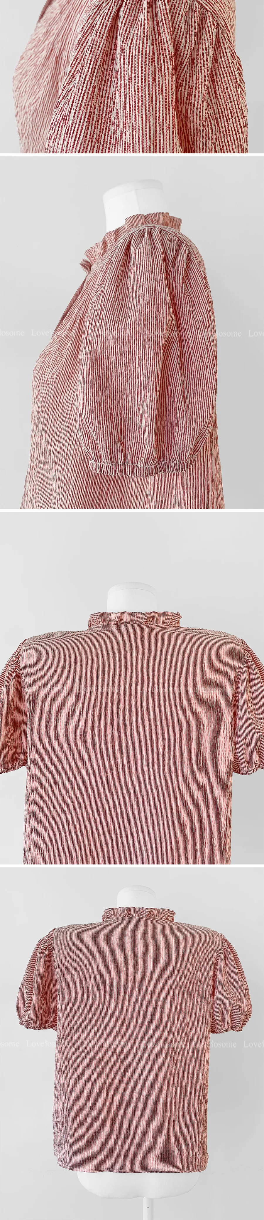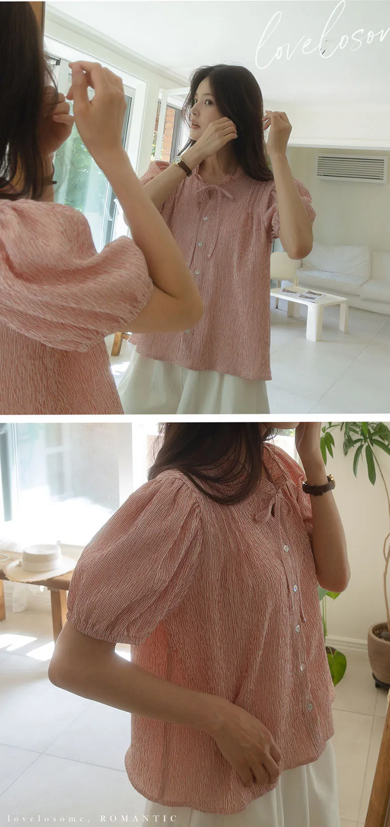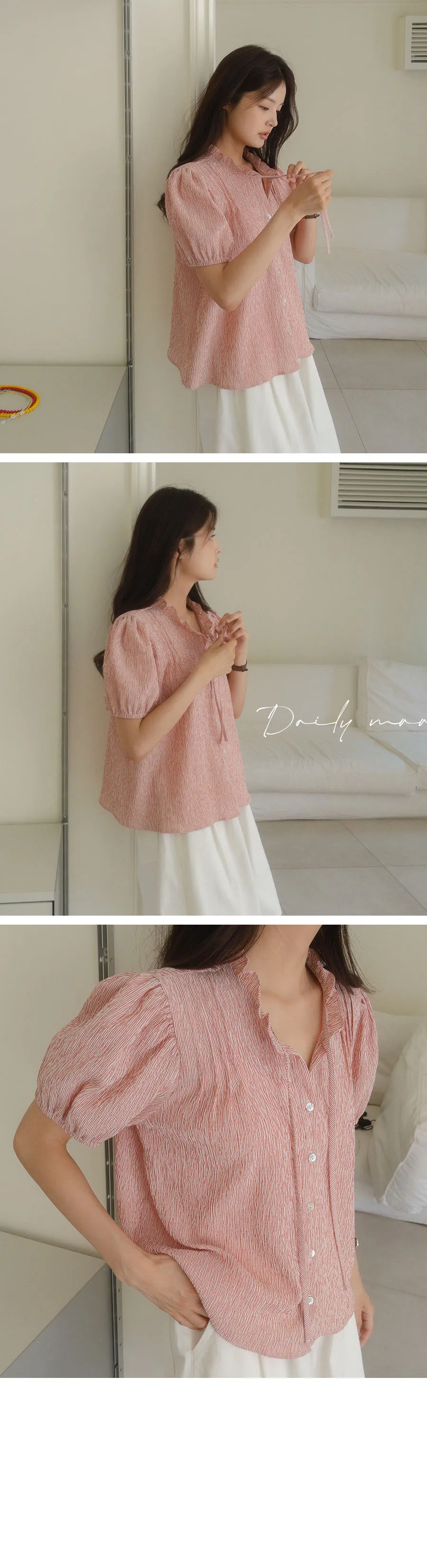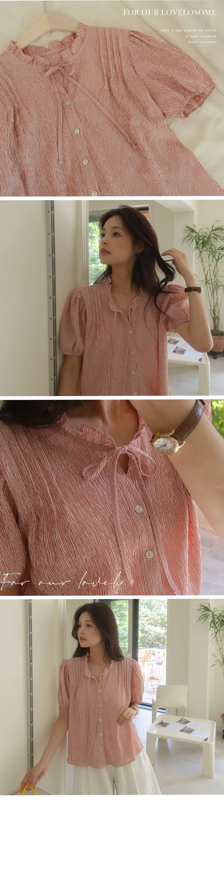 褶邊領口泡泡細褶排扣上衣,材質柔軟,採用褶邊領口設計和緞帶細節,賦予其精緻的氛圍。 正面的針摺細節和修飾肩部設計讓上身修身:) 袖帶線提供舒適貼合感,非常適合日常穿搭。線條紋圖案增添了引人注目的細節。