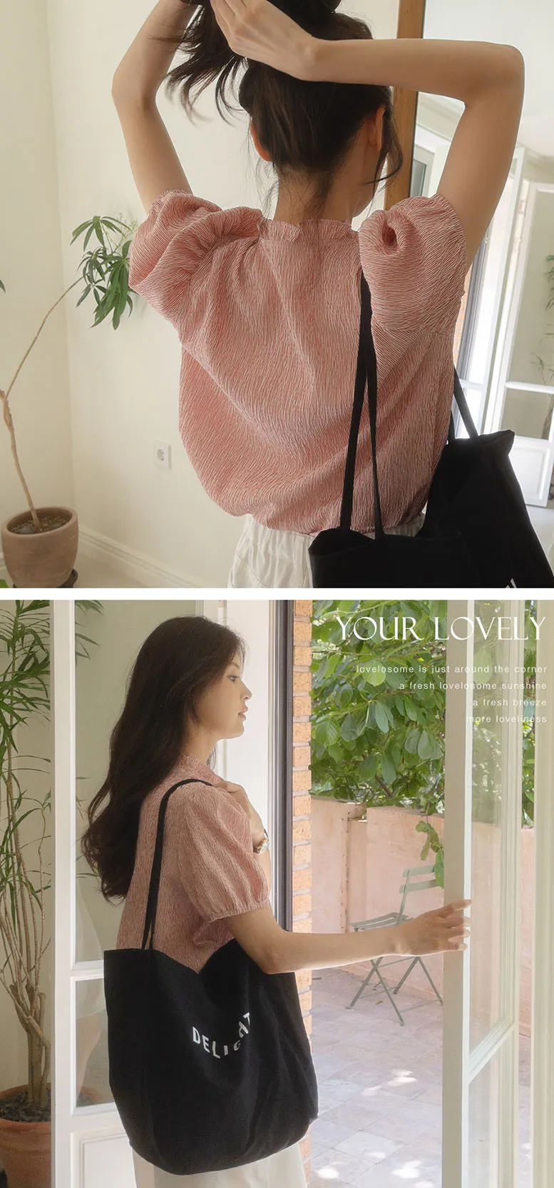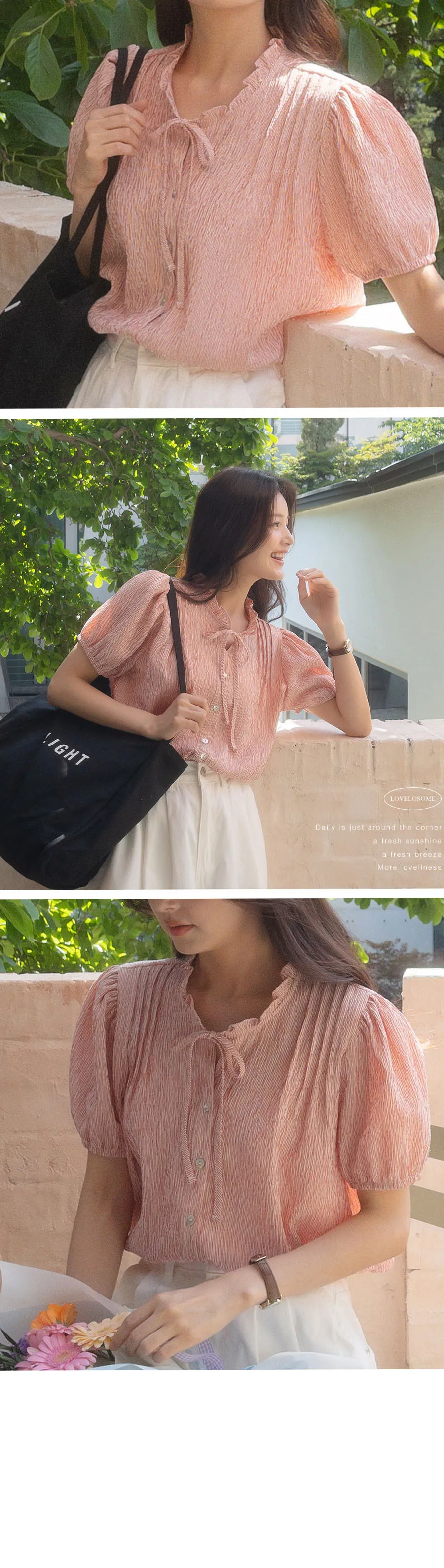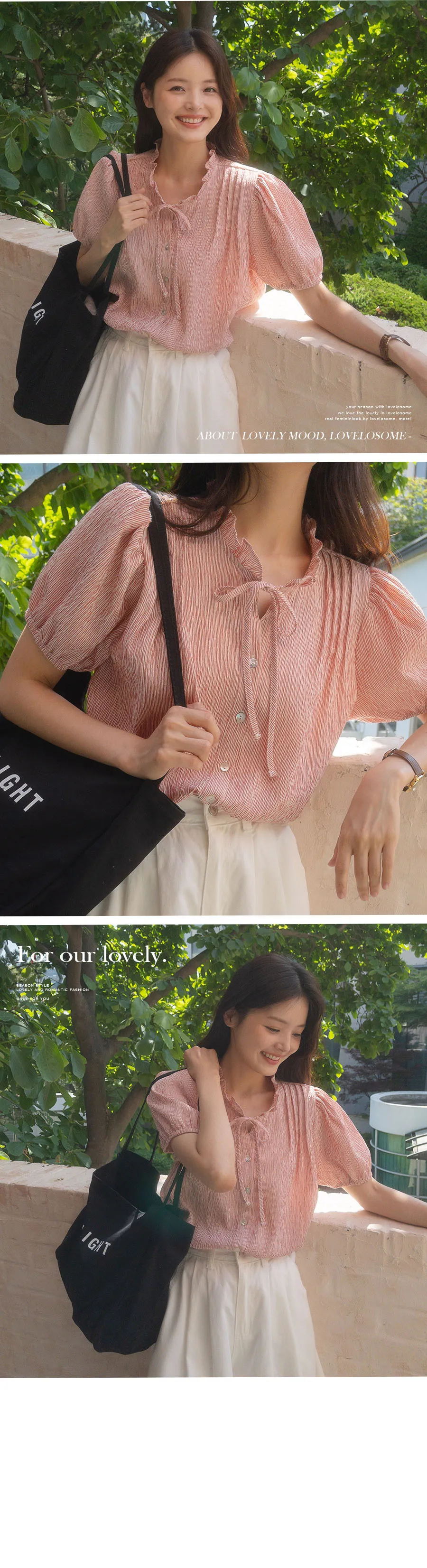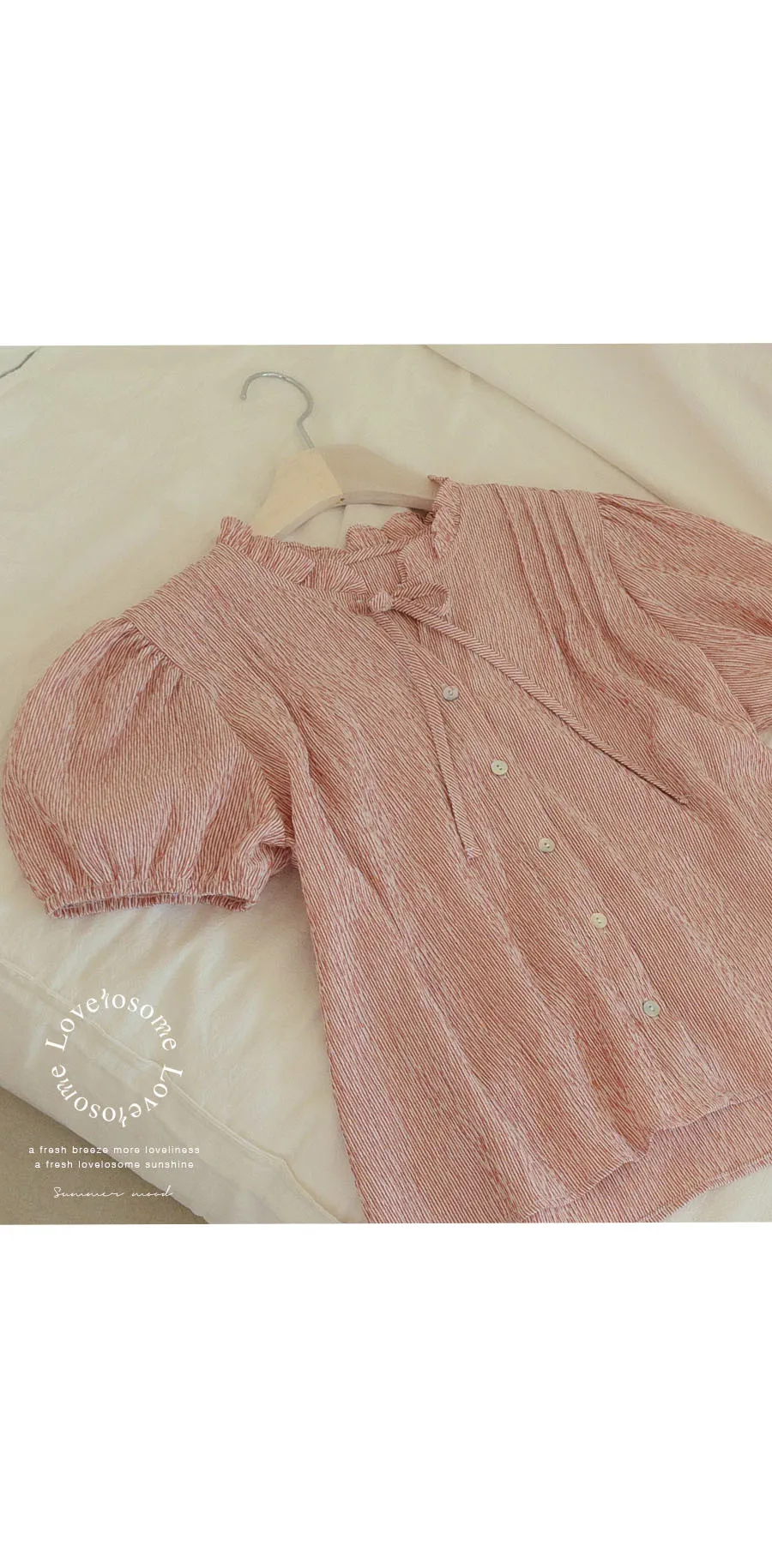 褶邊領口泡泡細褶排扣上衣,材質柔軟,採用褶邊領口設計和緞帶細節,賦予其精緻的氛圍。 正面的針摺細節和修飾肩部設計讓上身修身:) 袖帶線提供舒適貼合感,非常適合日常穿搭。線條紋圖案增添了引人注目的細節。