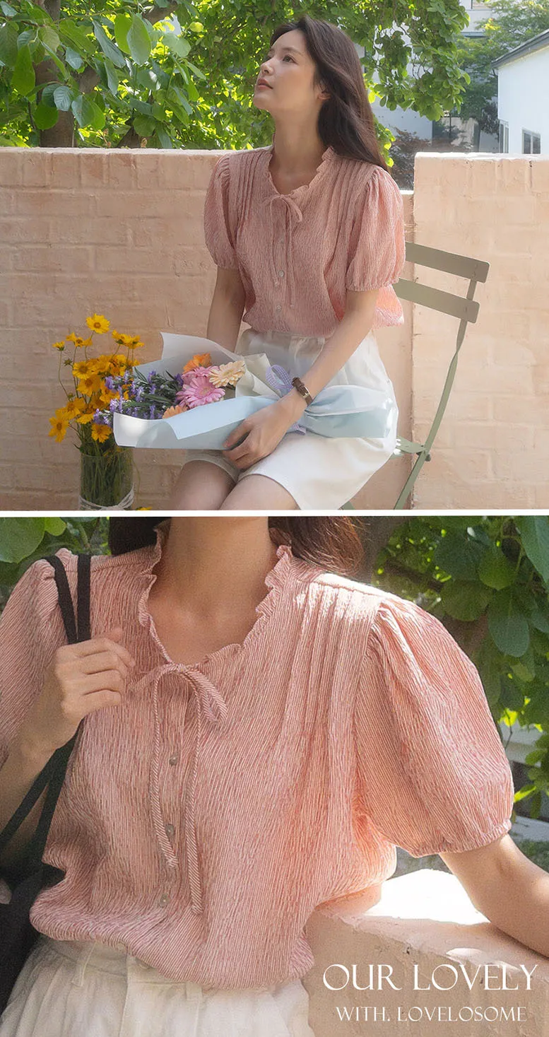 精緻氛圍摺邊綁帶領口針摺肩線線條排扣上衣