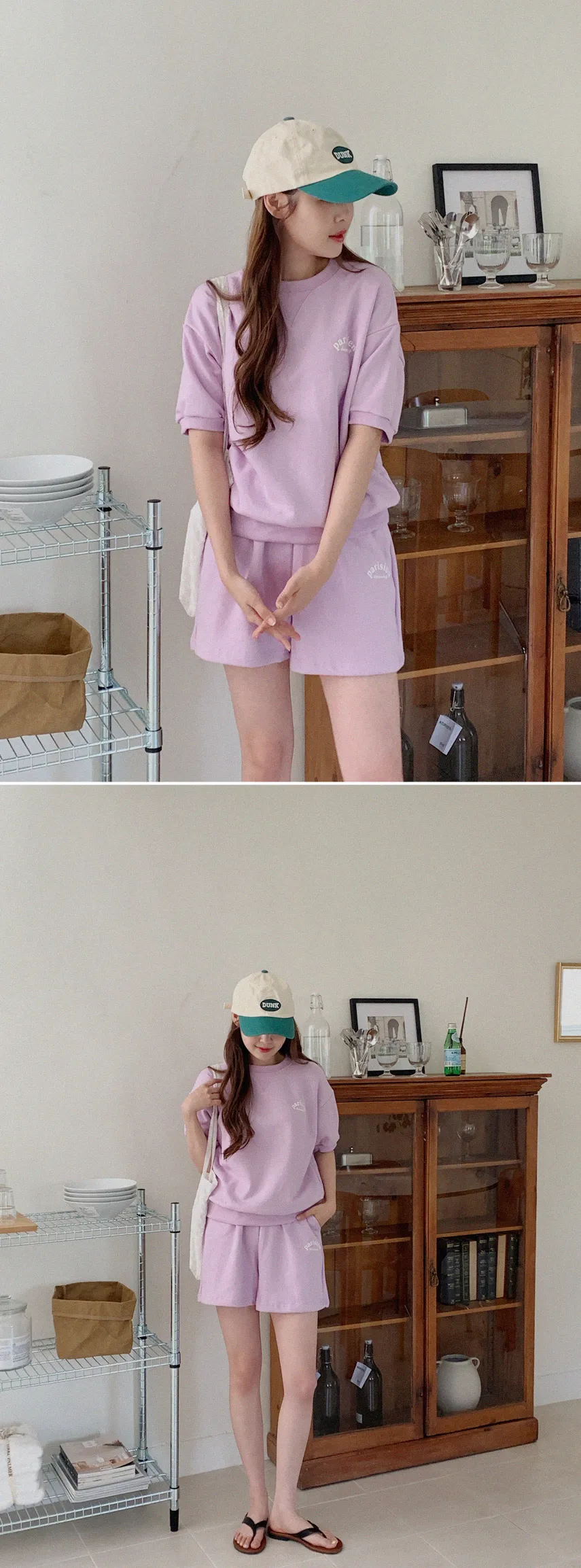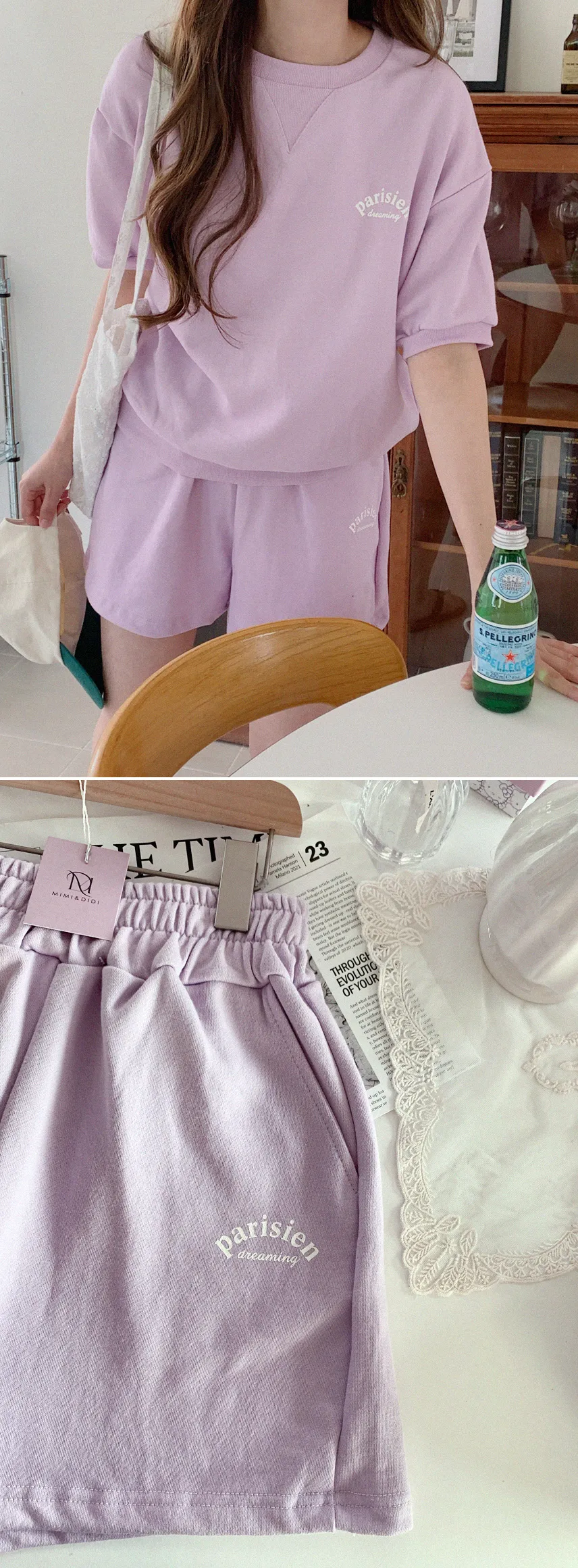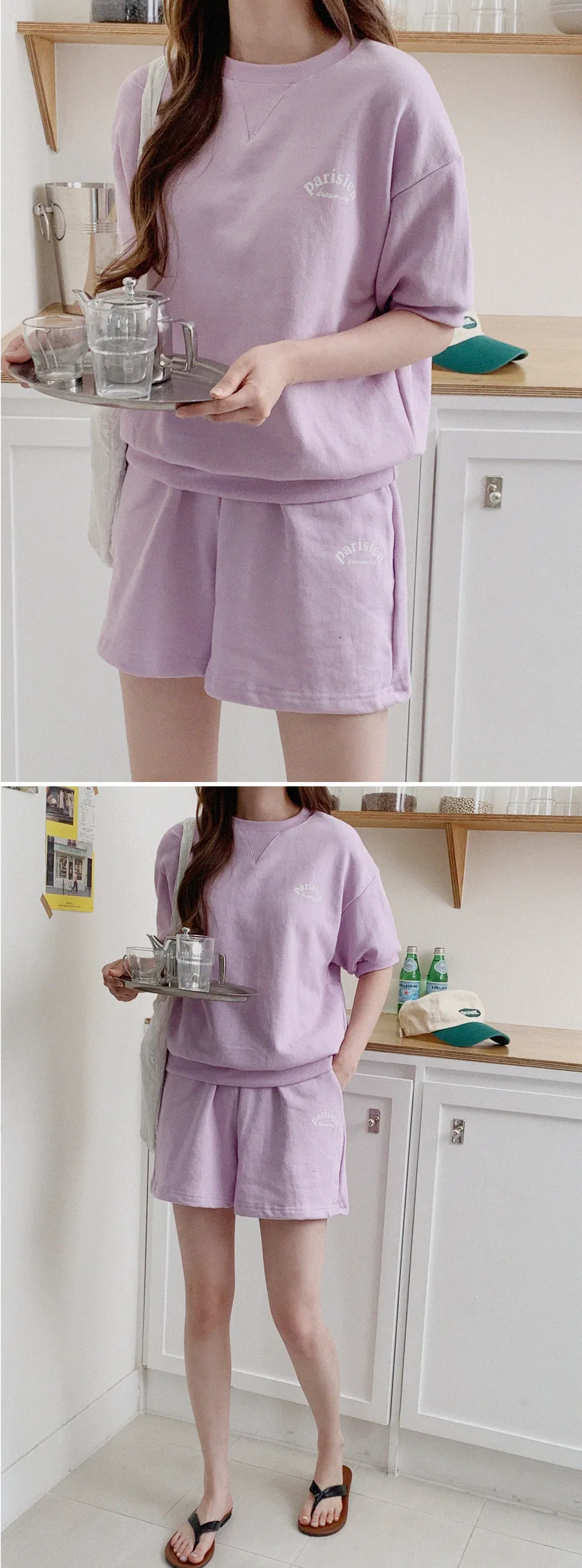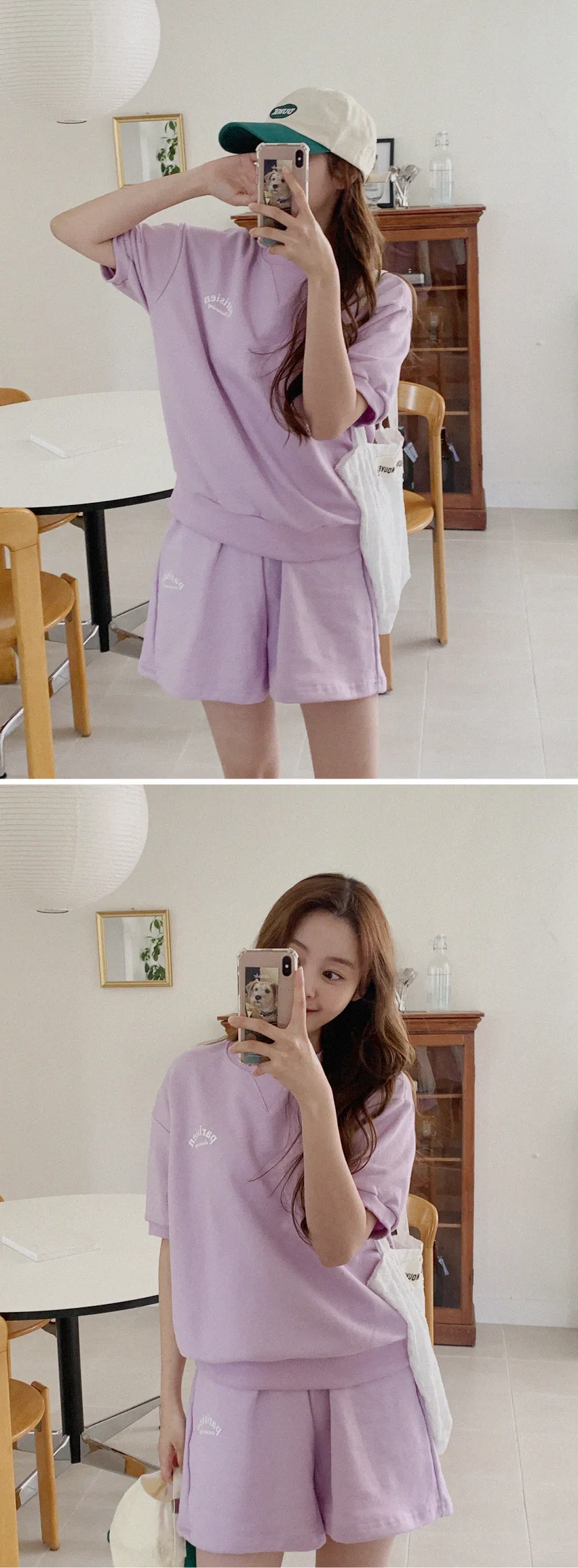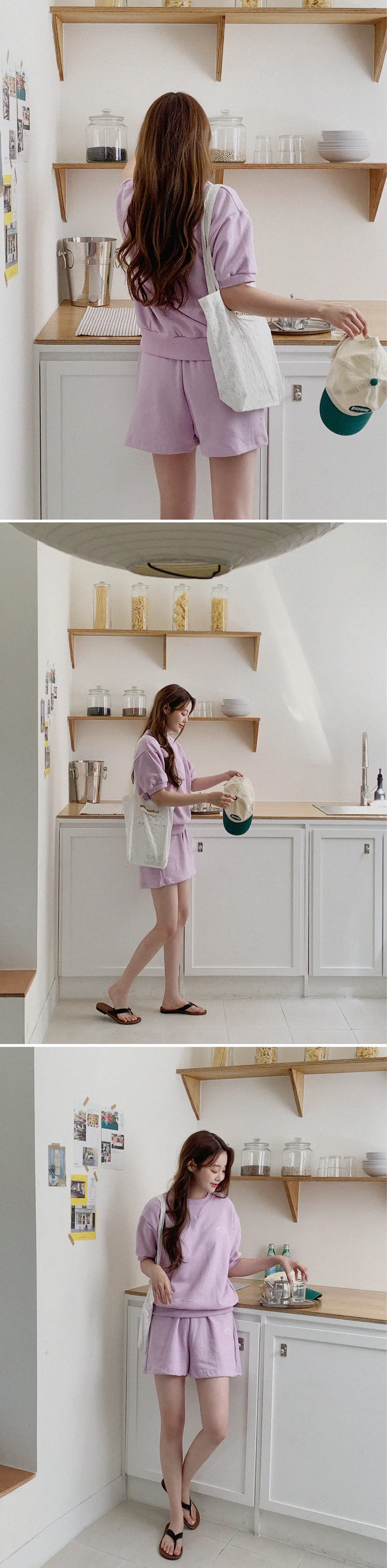 由薄而可愛的棉布製成的休閒套裝,穿著舒適又可愛♡特別是模特兒穿的紫色非常可愛和柔和。一套領口有三角形細節的休閒上衣,並飾有可愛的字母和長度合適的短褲。短褲有柔軟的腰帶,穿起來舒適。