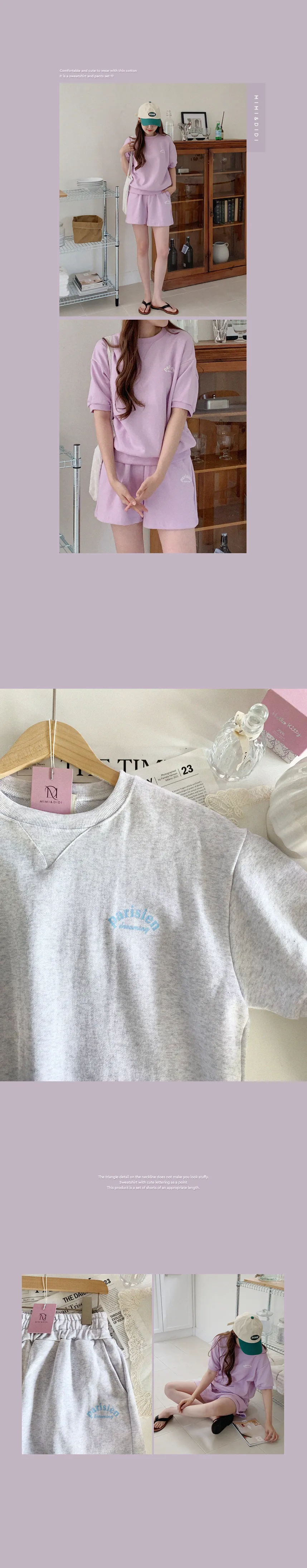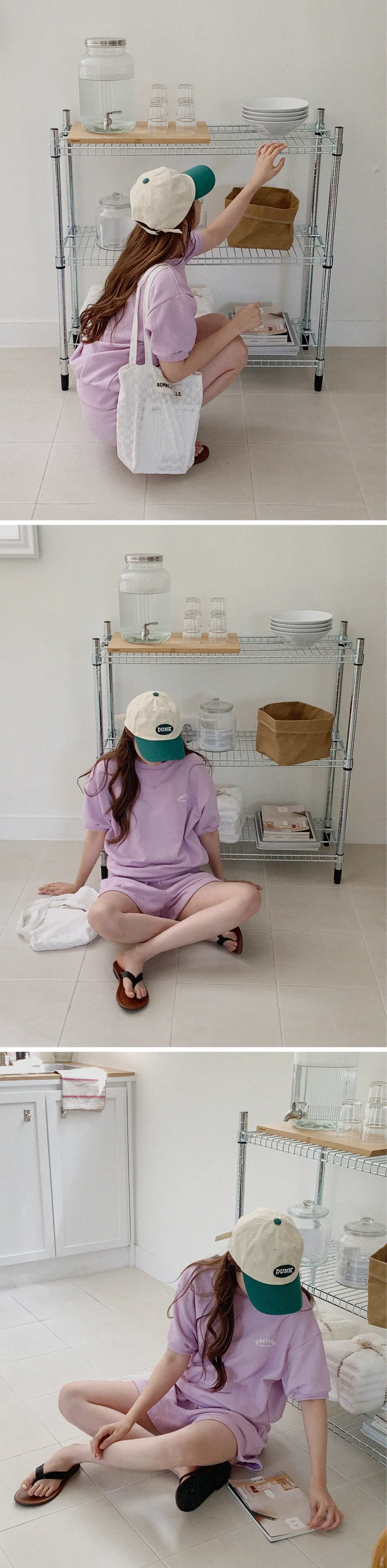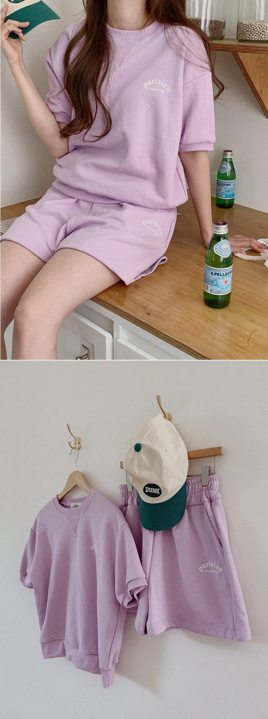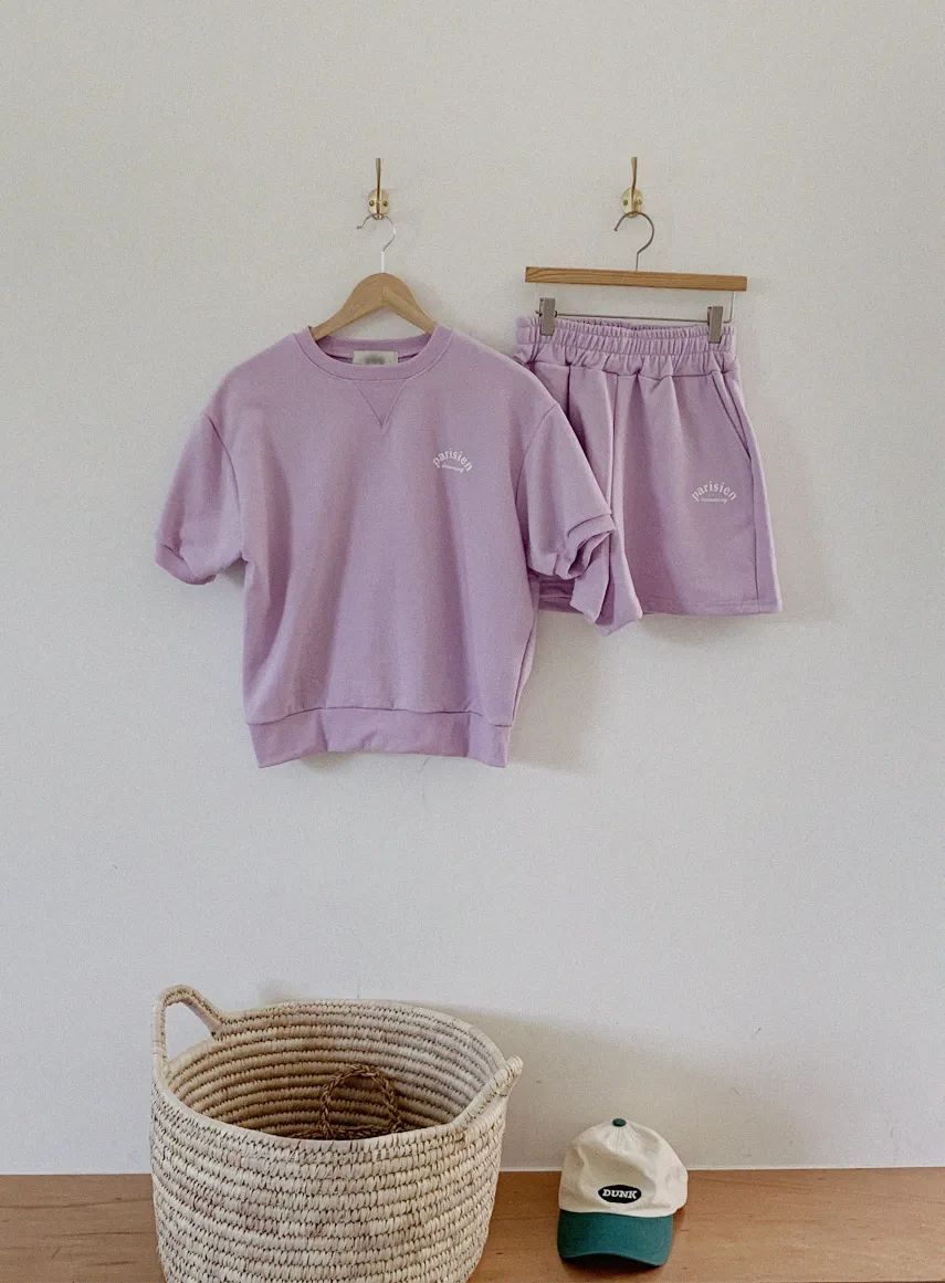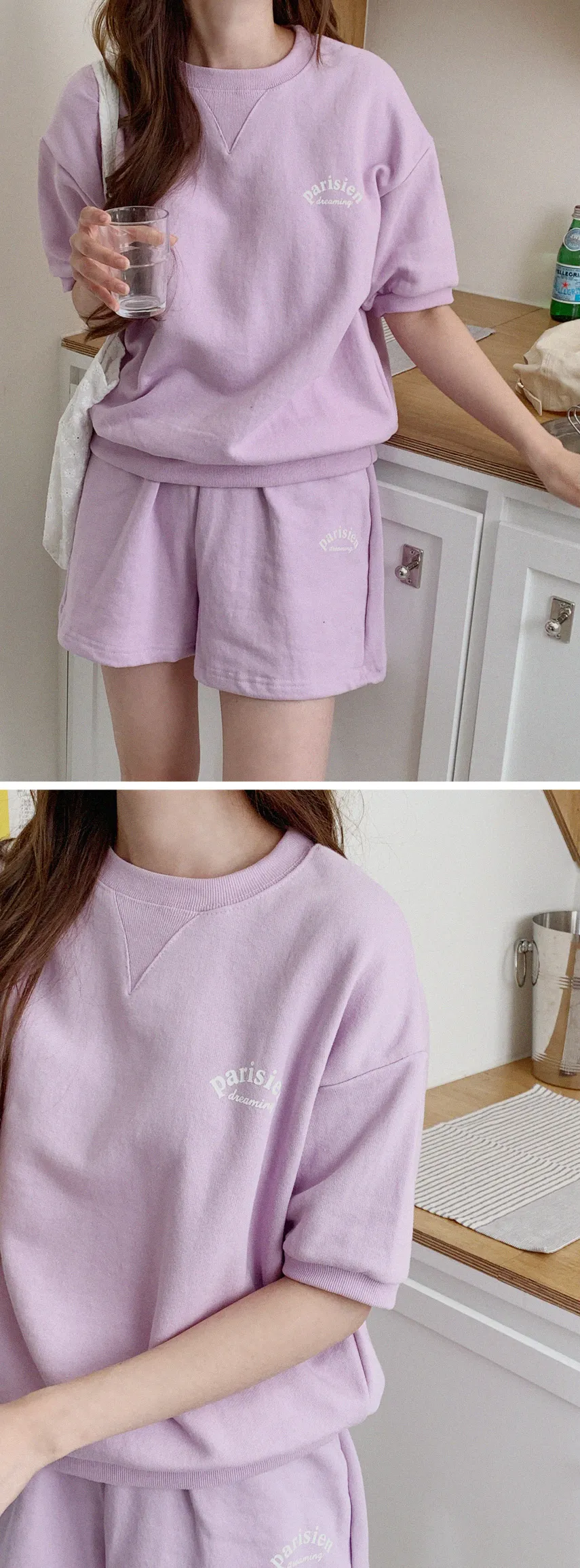 由薄而可愛的棉布製成的休閒套裝,穿著舒適又可愛♡特別是模特兒穿的紫色非常可愛和柔和。一套領口有三角形細節的休閒上衣,並飾有可愛的字母和長度合適的短褲。短褲有柔軟的腰帶,穿起來舒適。