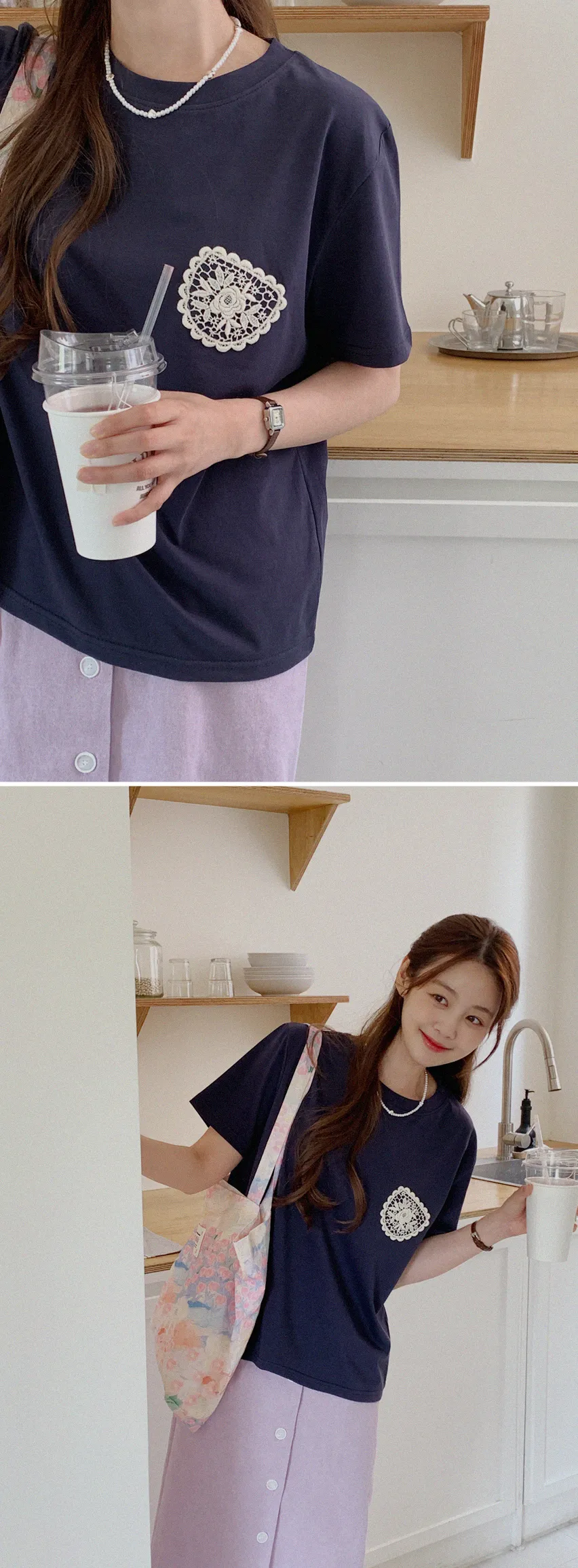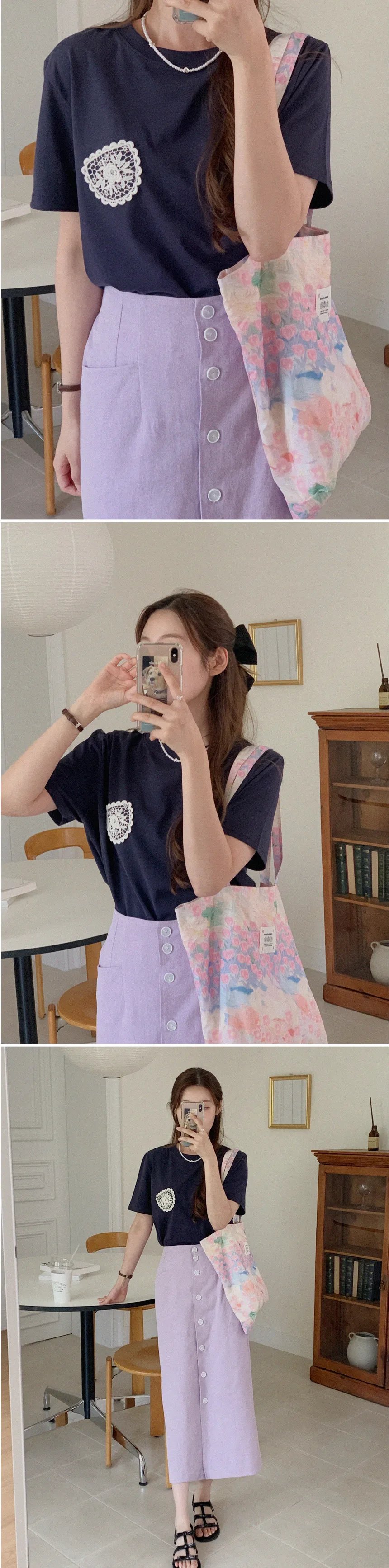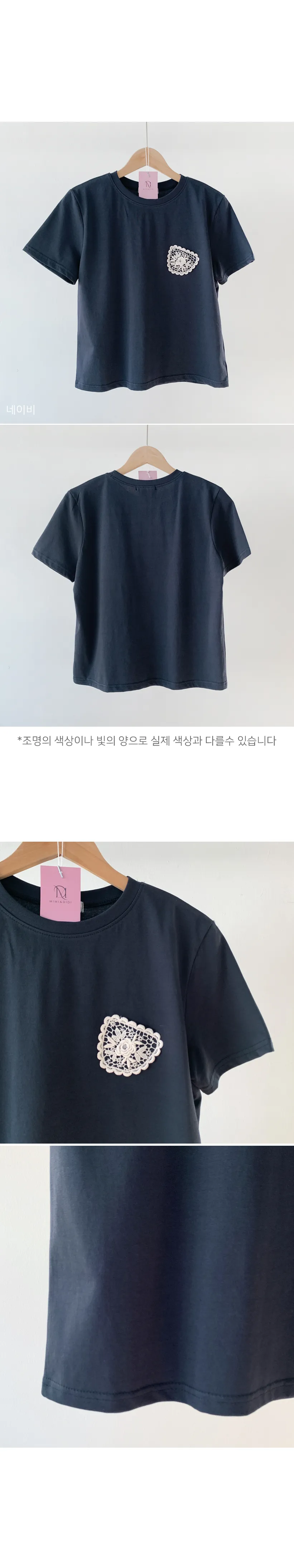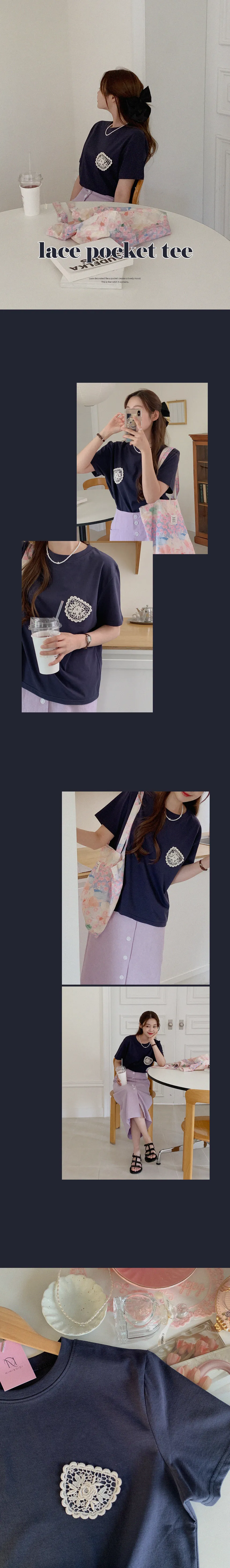 一種可愛的情調,蕾絲裝飾得像一個口袋。這是一款基本版型的棉質 T 卹,穿著舒適,適合日常穿著。只要在簡單的基本款T恤上加上一點蕾絲,就可以輕鬆搭配各種下裝,如牛仔褲、傘擺裙、休閒褲等。