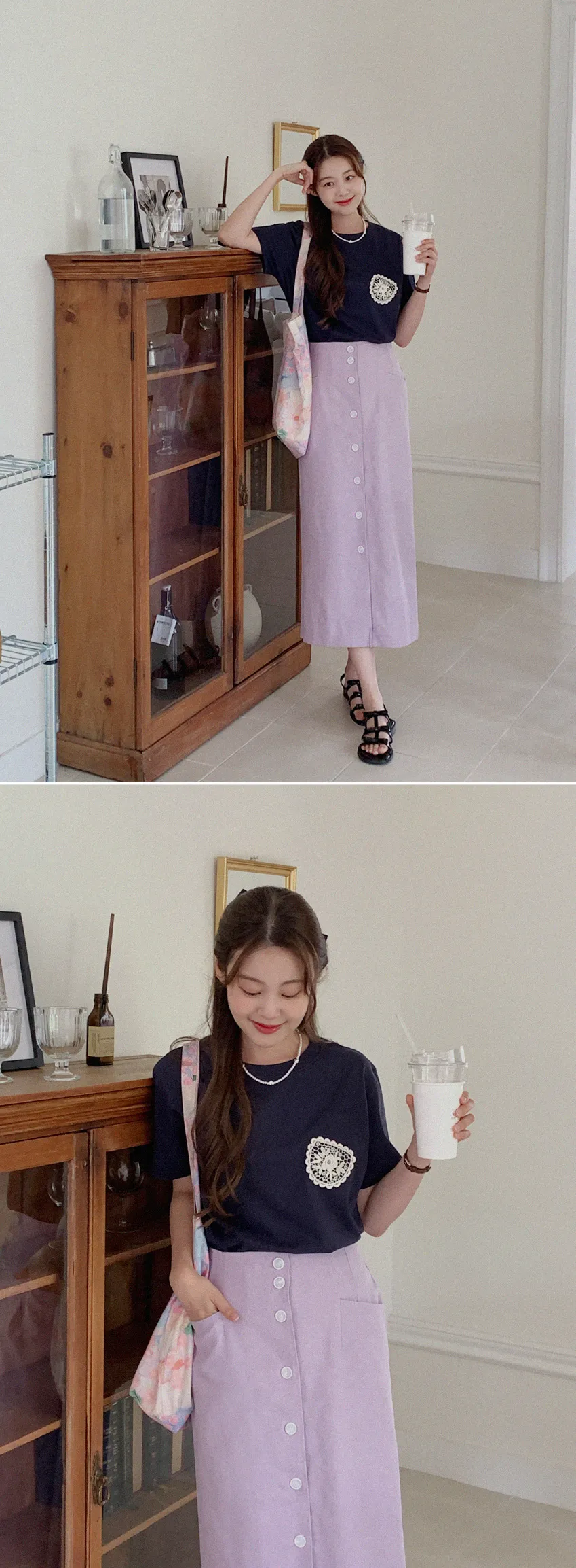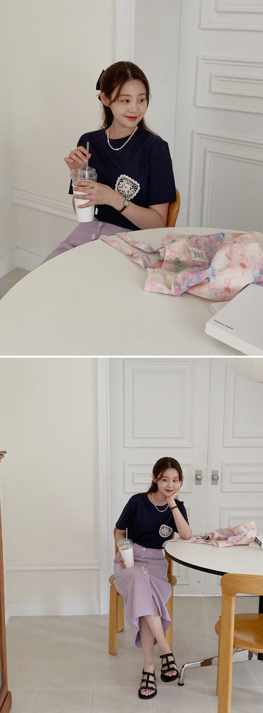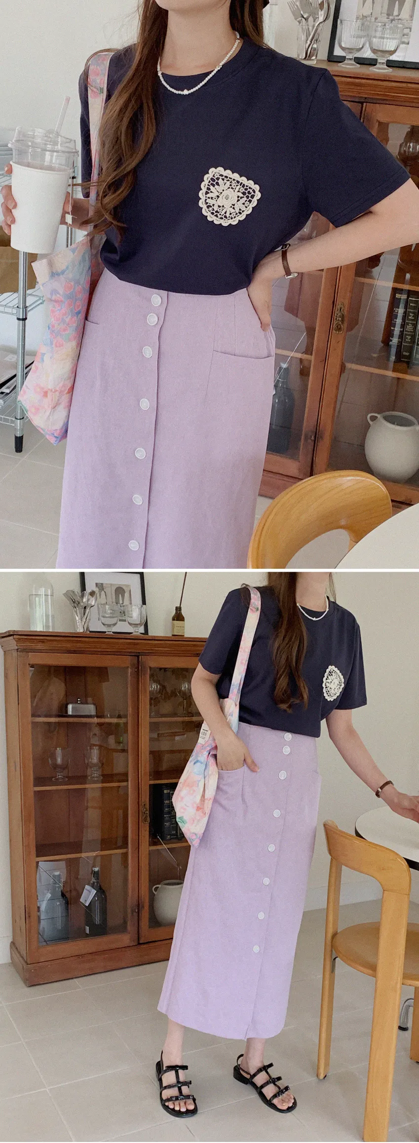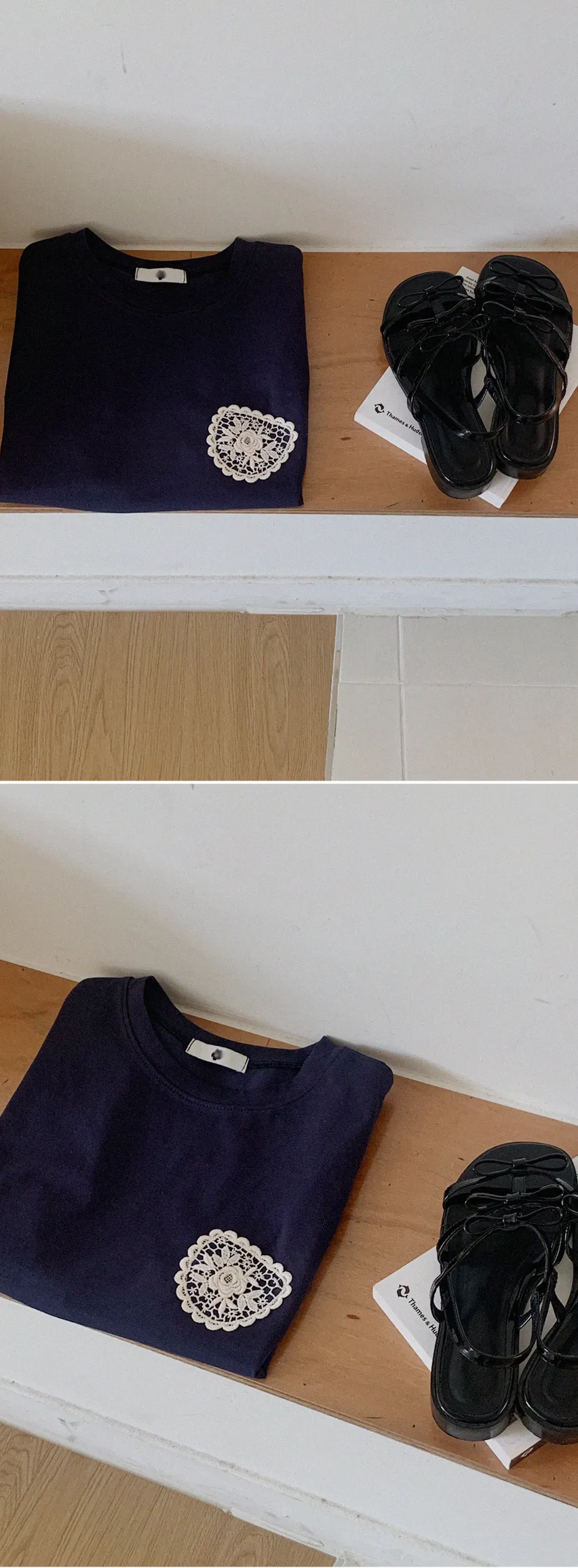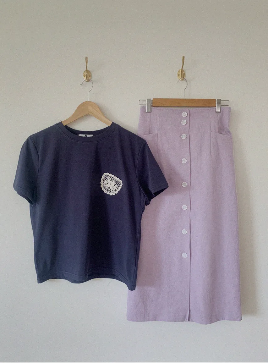 一種可愛的情調,蕾絲裝飾得像一個口袋。這是一款基本版型的棉質 T 卹,穿著舒適,適合日常穿著。只要在簡單的基本款T恤上加上一點蕾絲,就可以輕鬆搭配各種下裝,如牛仔褲、傘擺裙、休閒褲等。