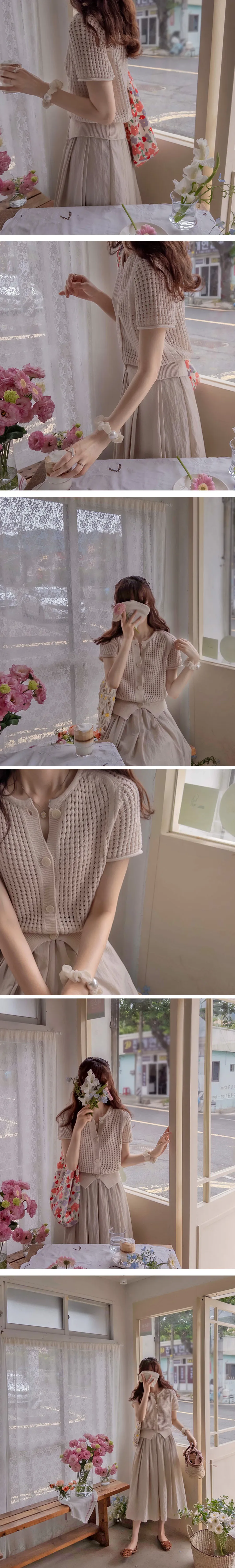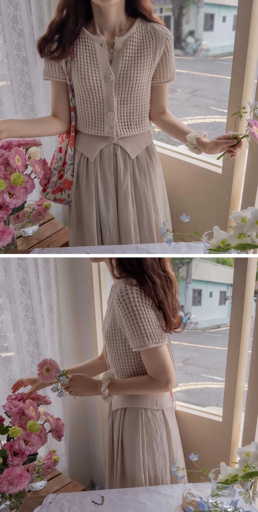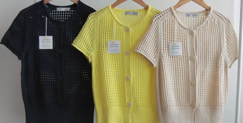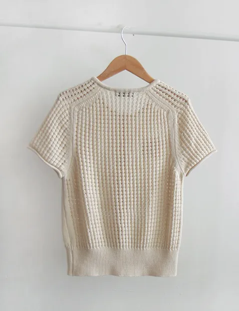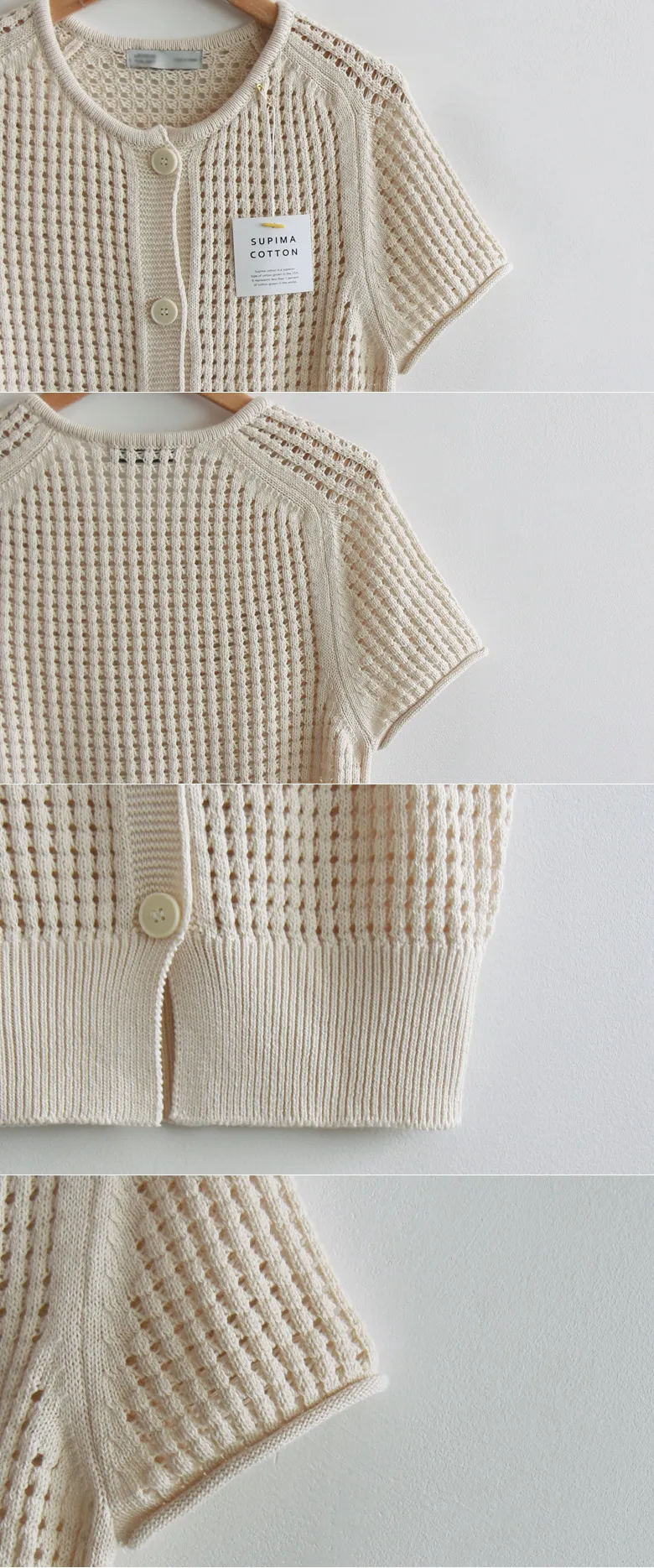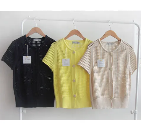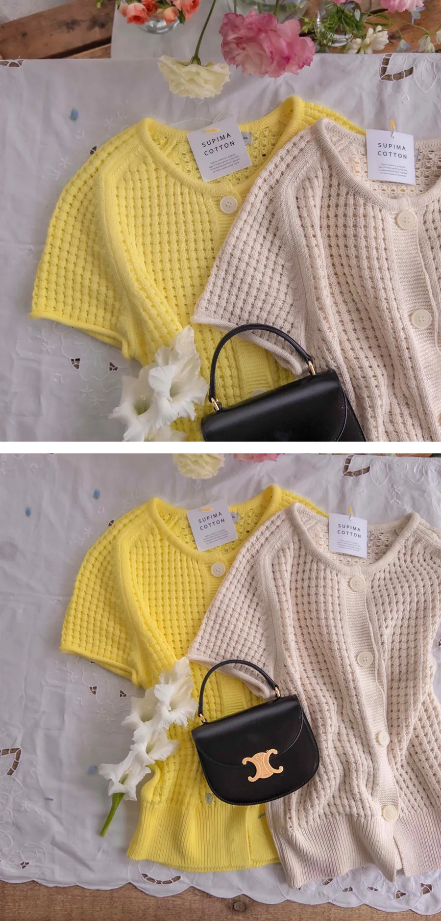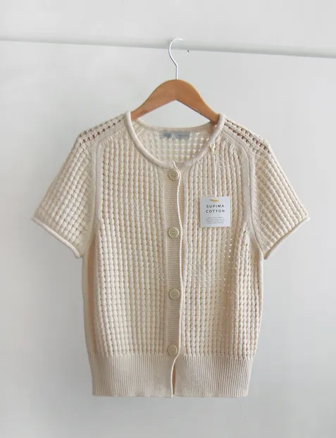 【棉材質:耐用且表面光滑,具有磨損少、不易起毛的優點】【半方鏤空孔洞,穿著涼爽】【舒適彈力針織,寬鬆合身】【袖子有圓潤的設計,營造出精緻的意境][推薦作為夏天穿的開衫]