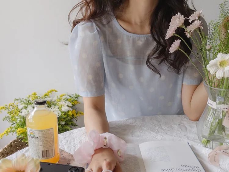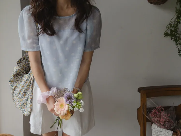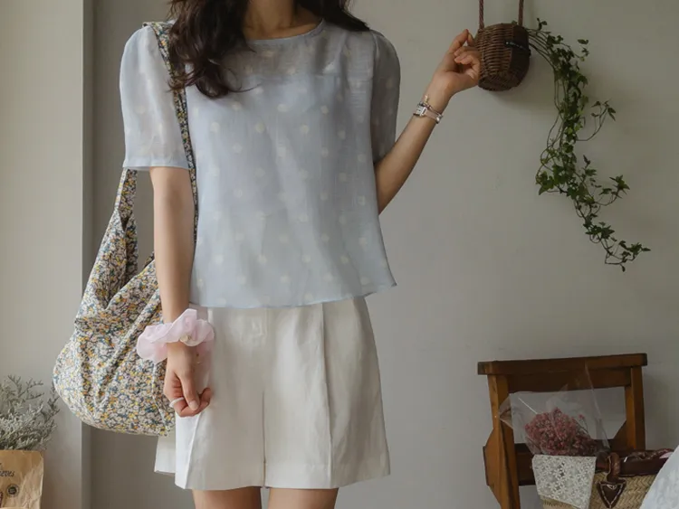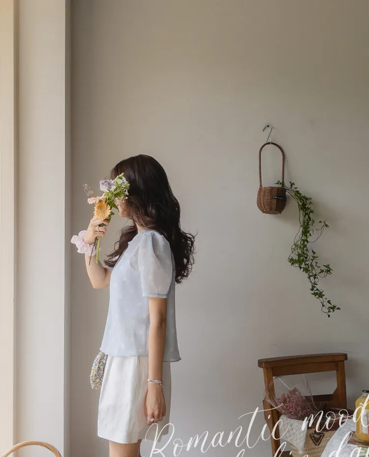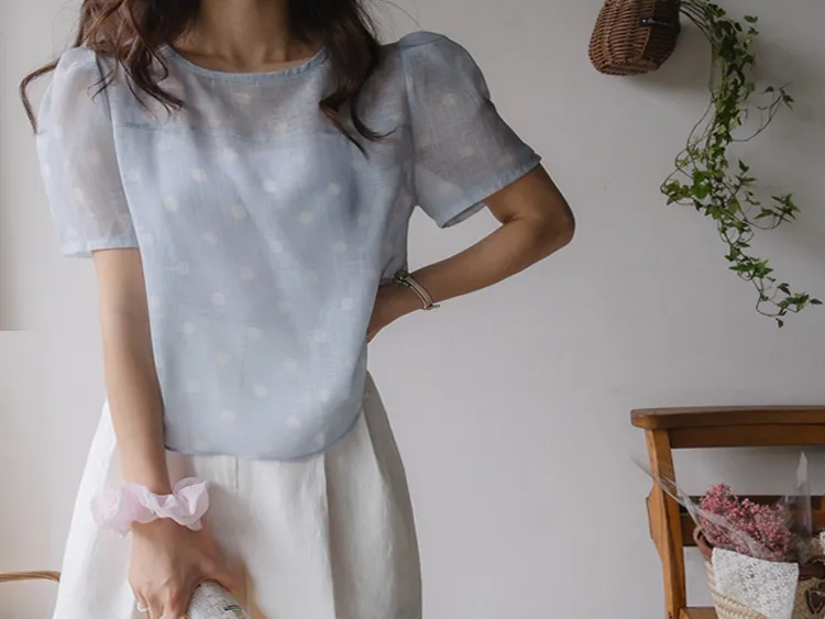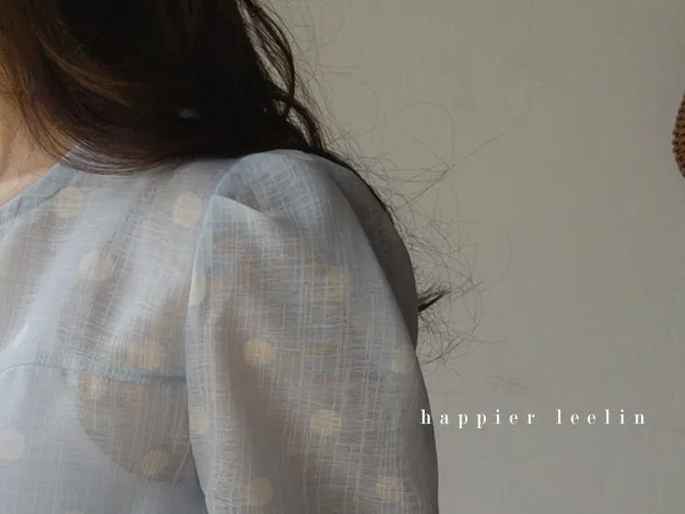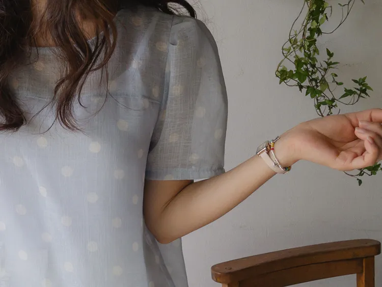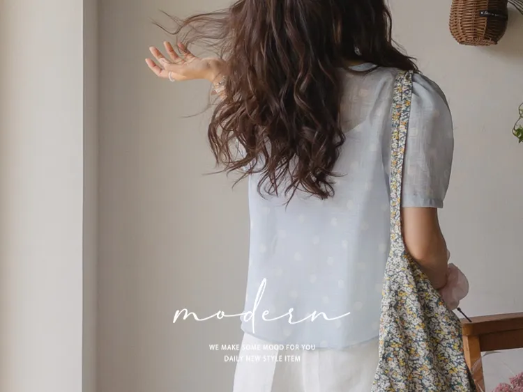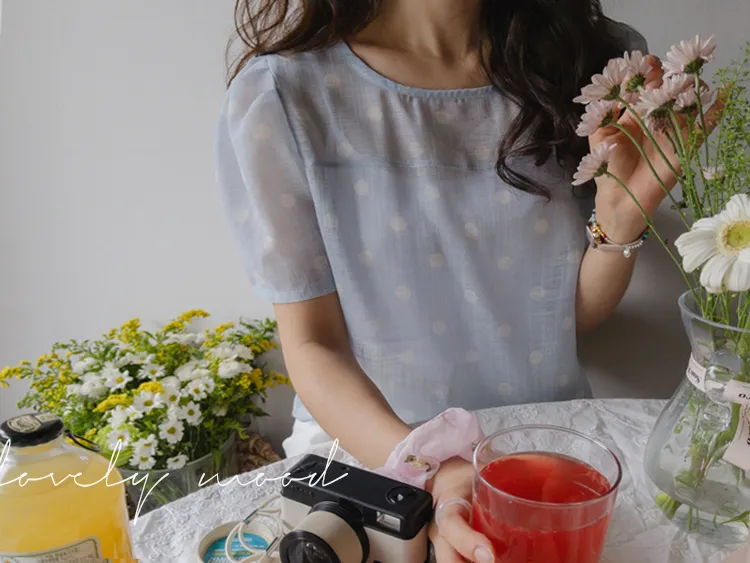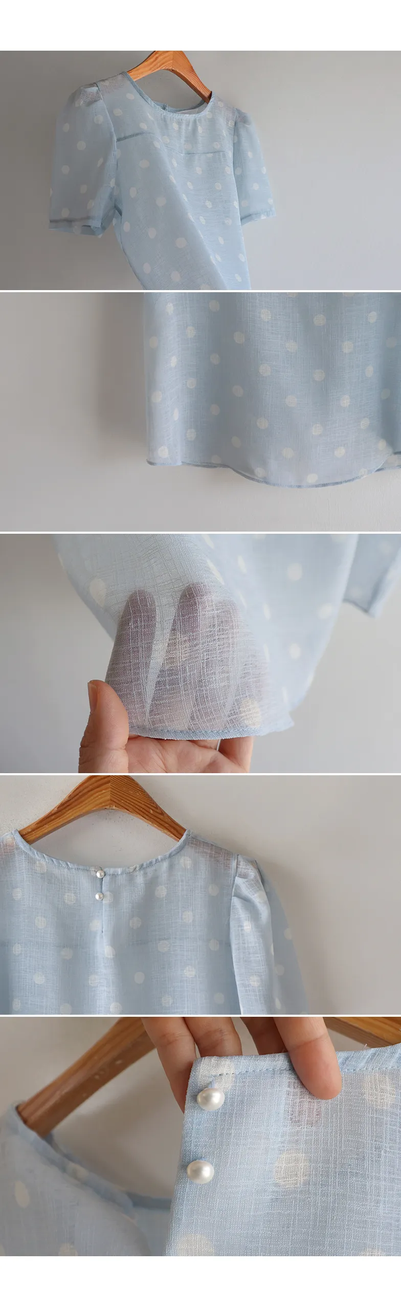 【薄款涼爽舒服! 圓點點上衣♥] [柔和色彩~] [水嫩肩線&後領口珍珠扣點] [工作造型、約會造型、婚禮嘉賓造型等多種造型~]