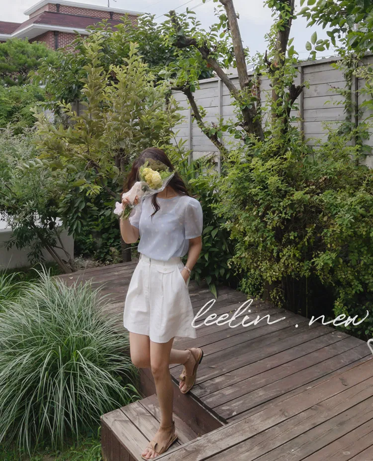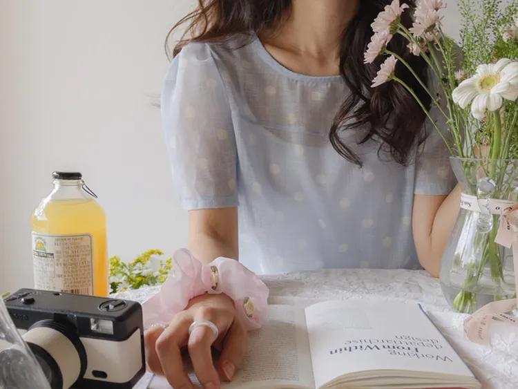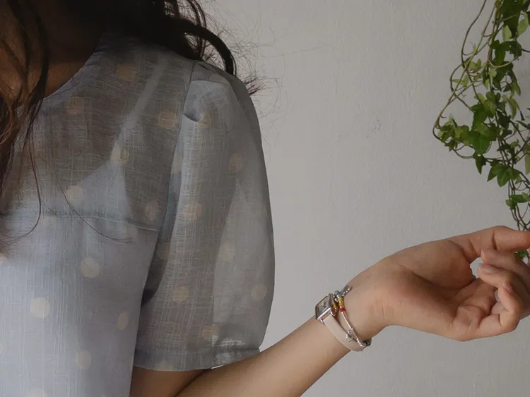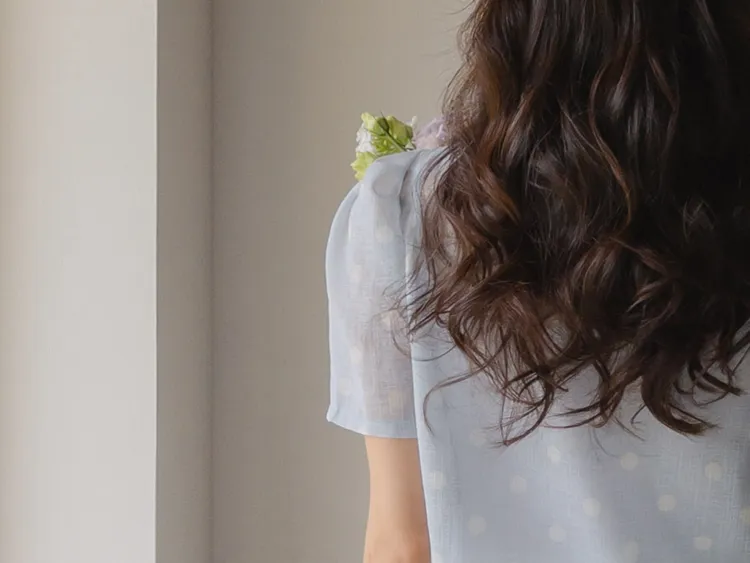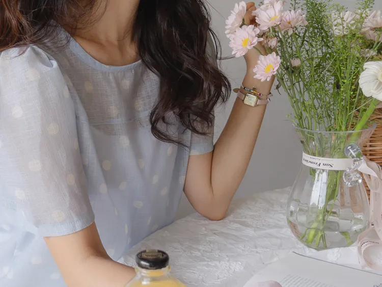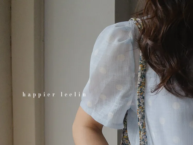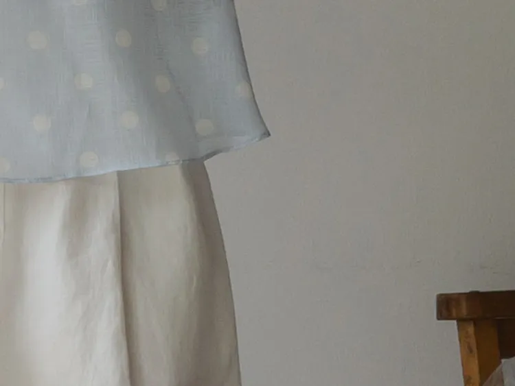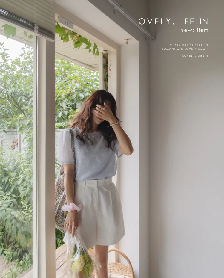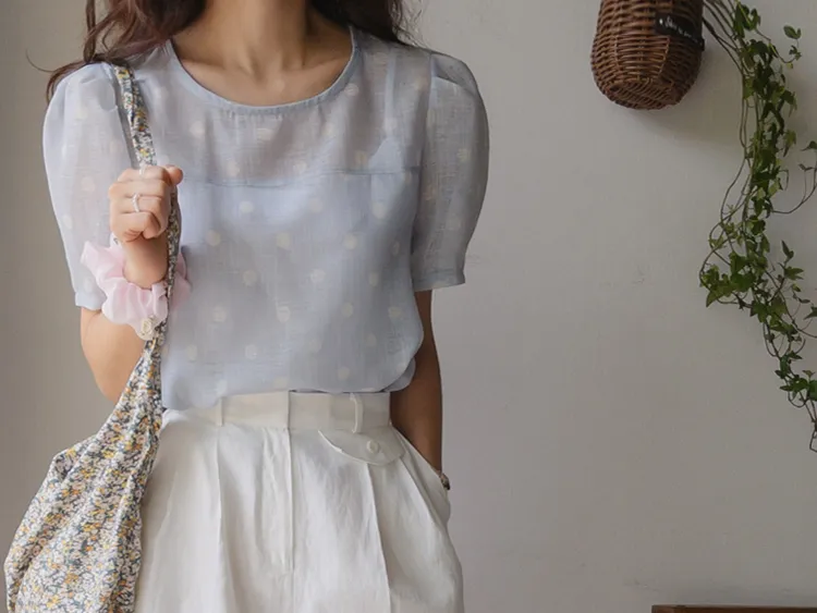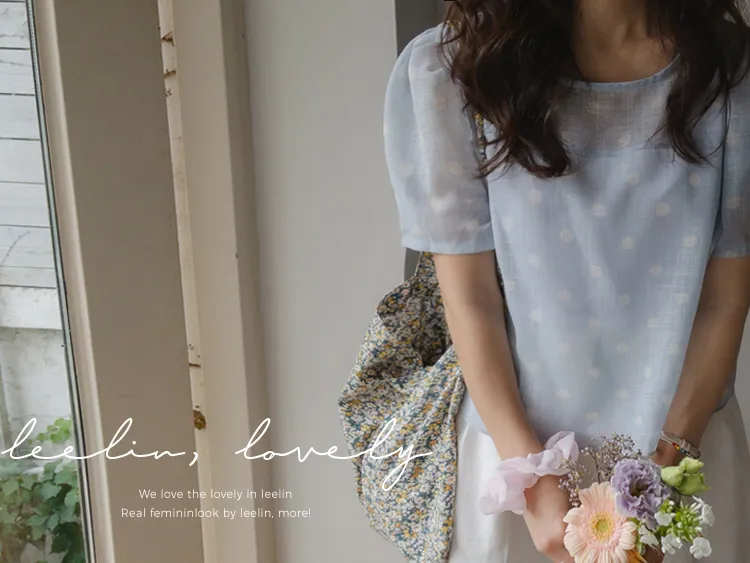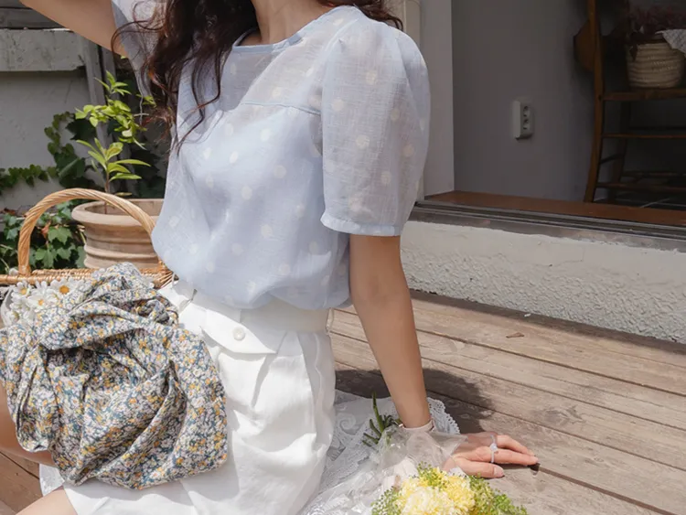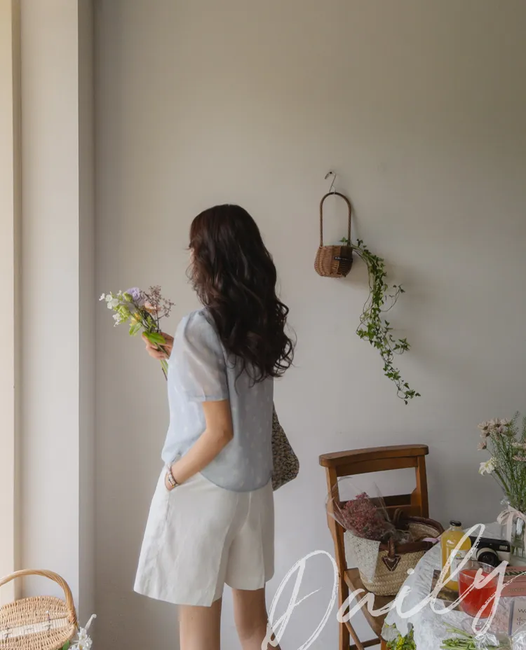 【薄款涼爽舒服! 圓點點上衣♥] [柔和色彩~] [水嫩肩線&後領口珍珠扣點] [工作造型、約會造型、婚禮嘉賓造型等多種造型~]