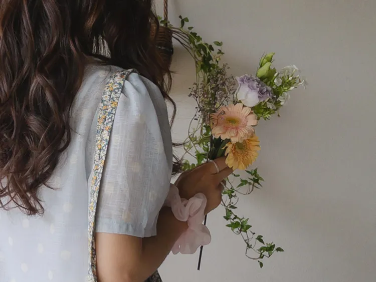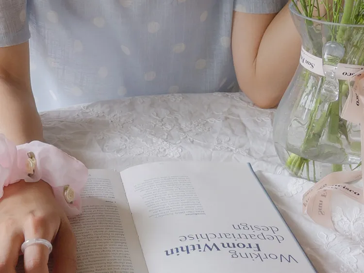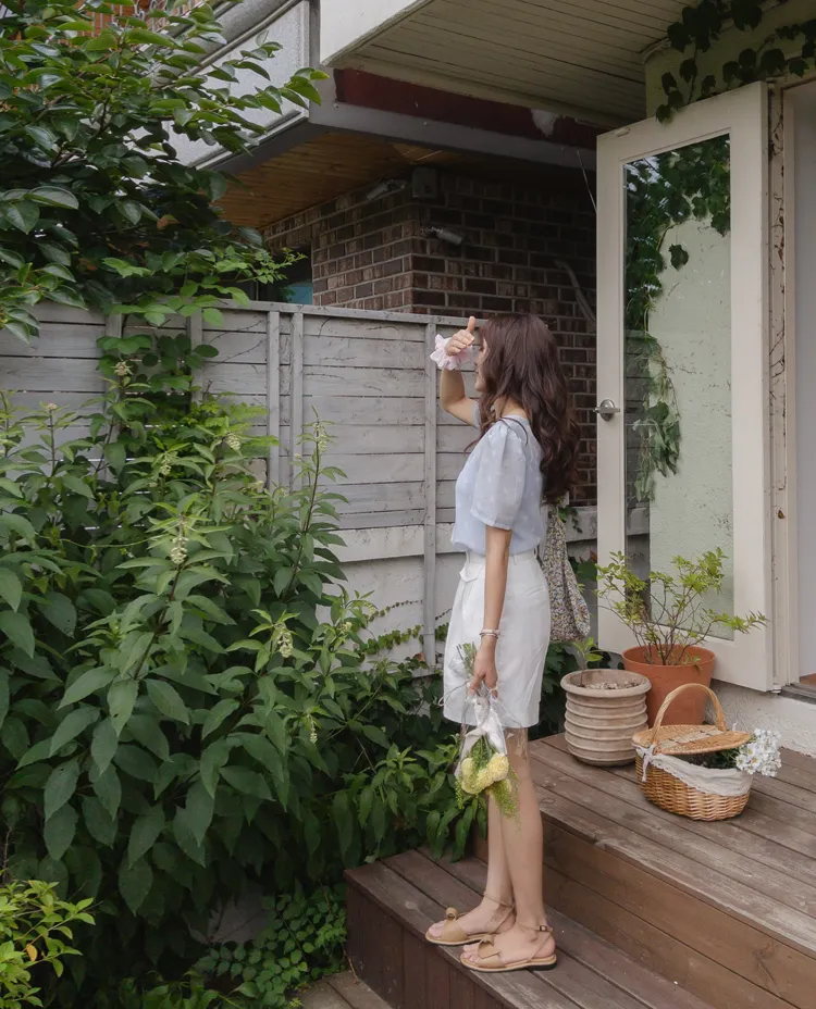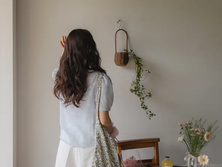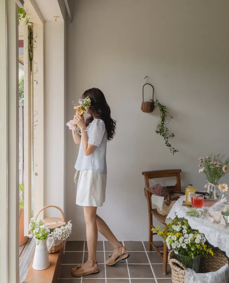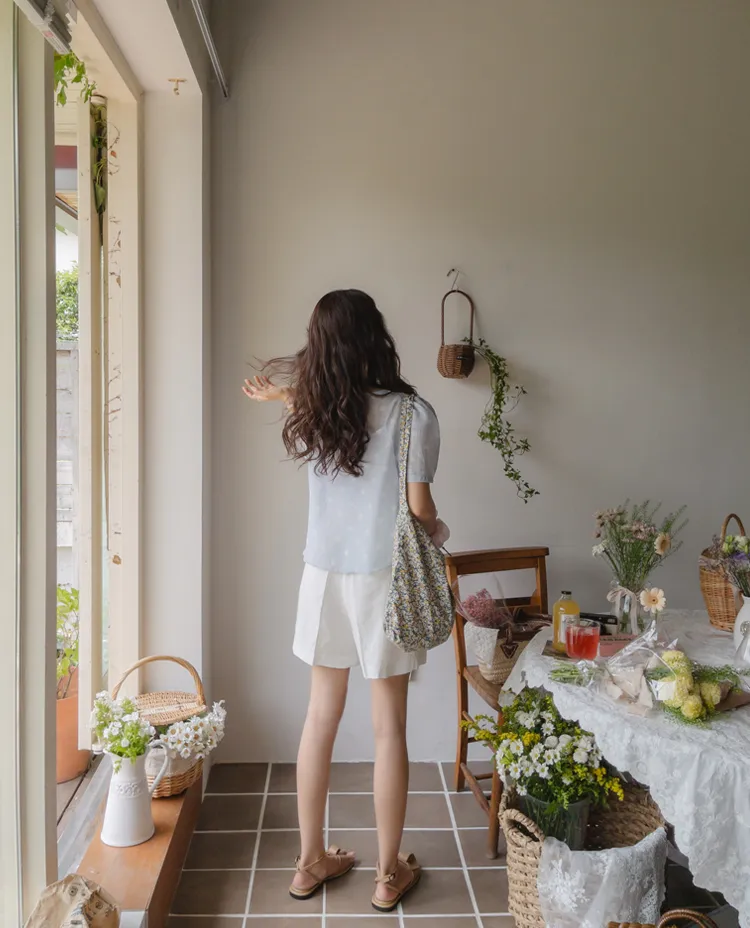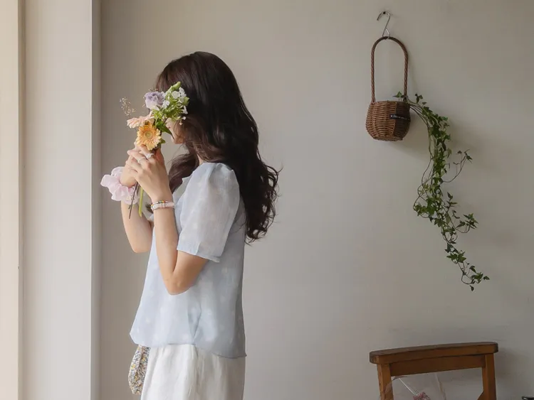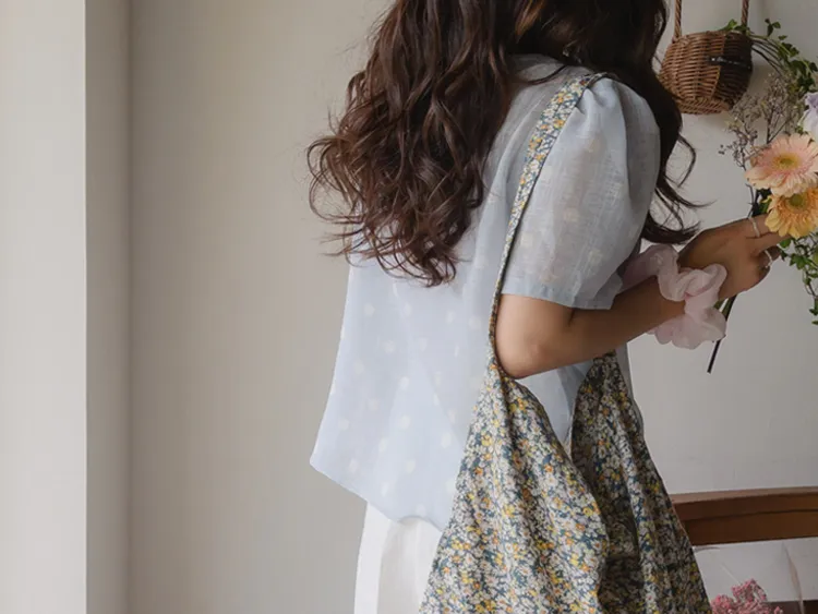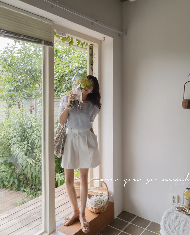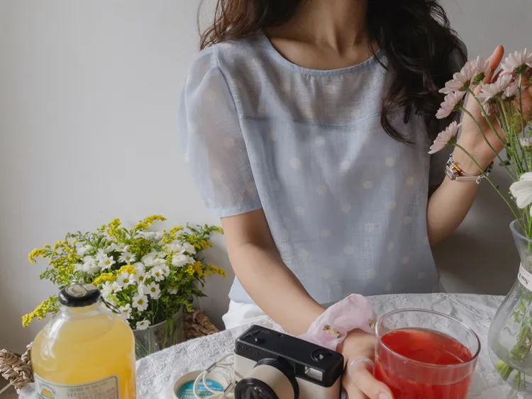 【薄款涼爽舒服! 圓點點上衣♥] [柔和色彩~] [水嫩肩線&後領口珍珠扣點] [工作造型、約會造型、婚禮嘉賓造型等多種造型~]