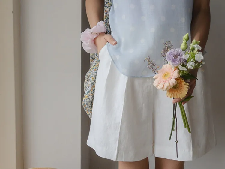 獨特前口袋裝飾針褶修身舒適短褲
