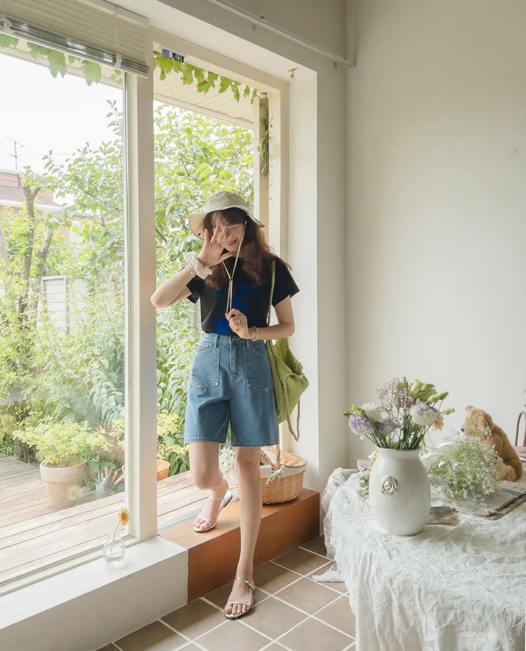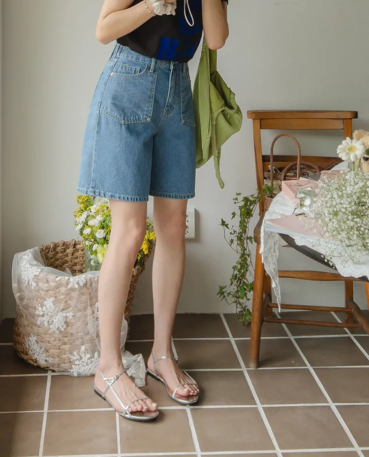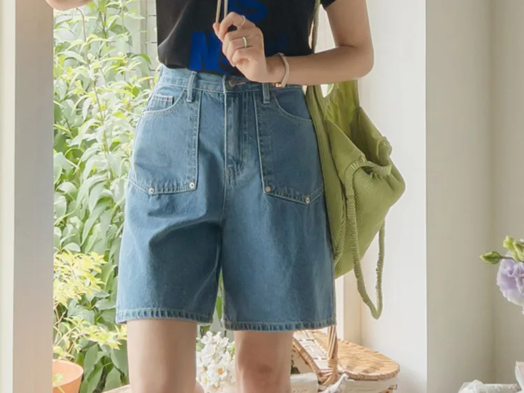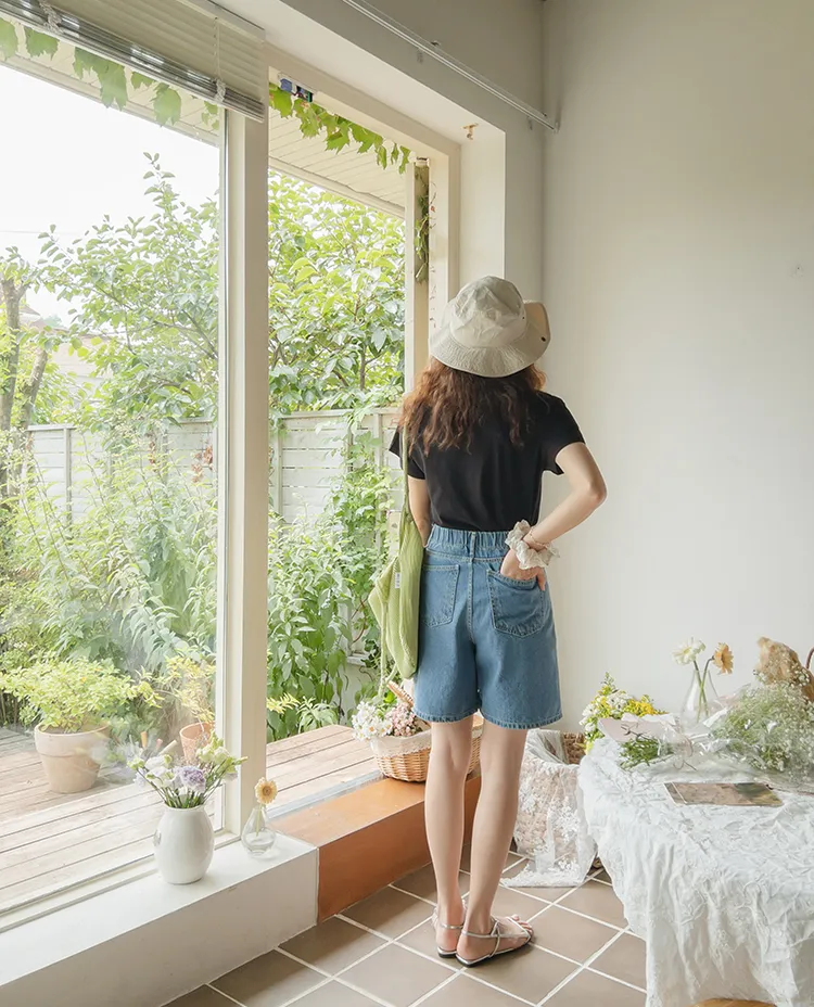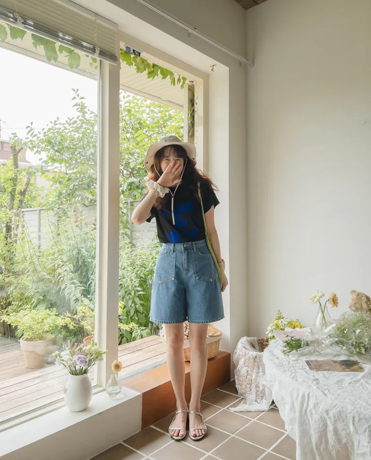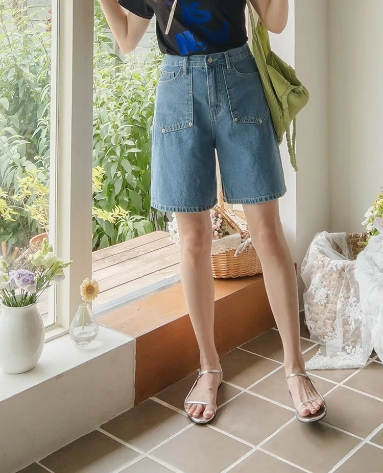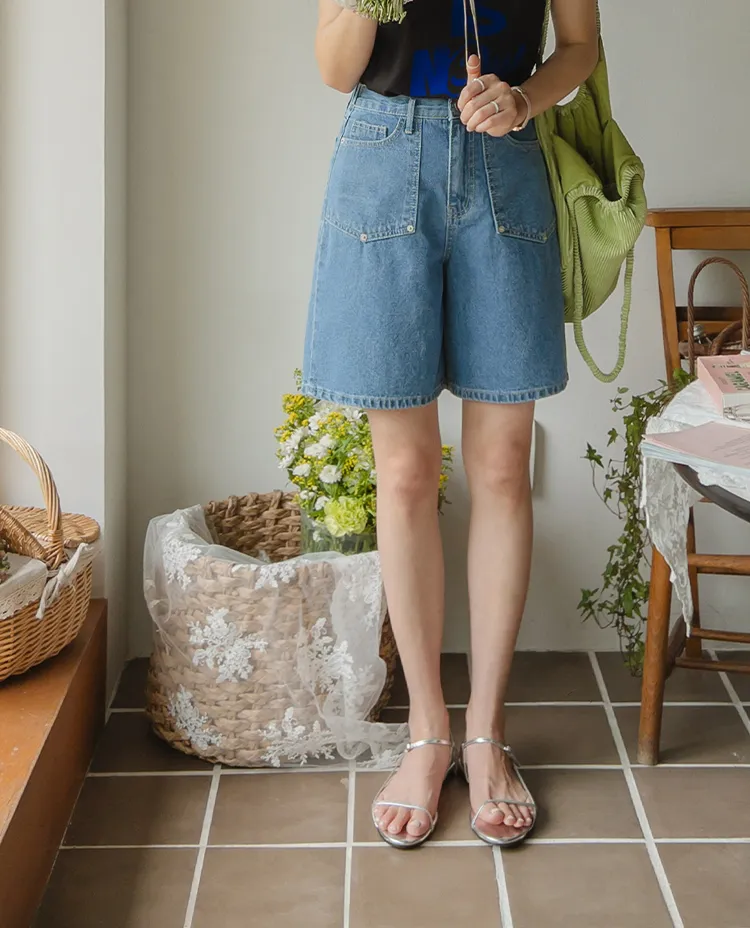 【有吸引力且獨特的口袋點! 牛仔短褲♥] [能打造感性造型] [半 A 字輪廓可修飾腿部線條] [緊身彈性背帶帶來舒適貼合感]
