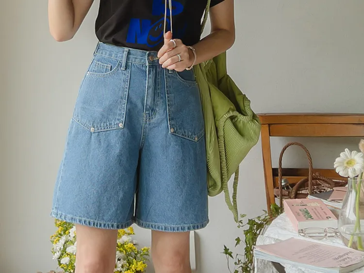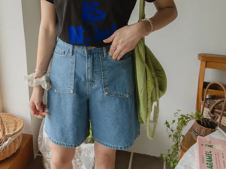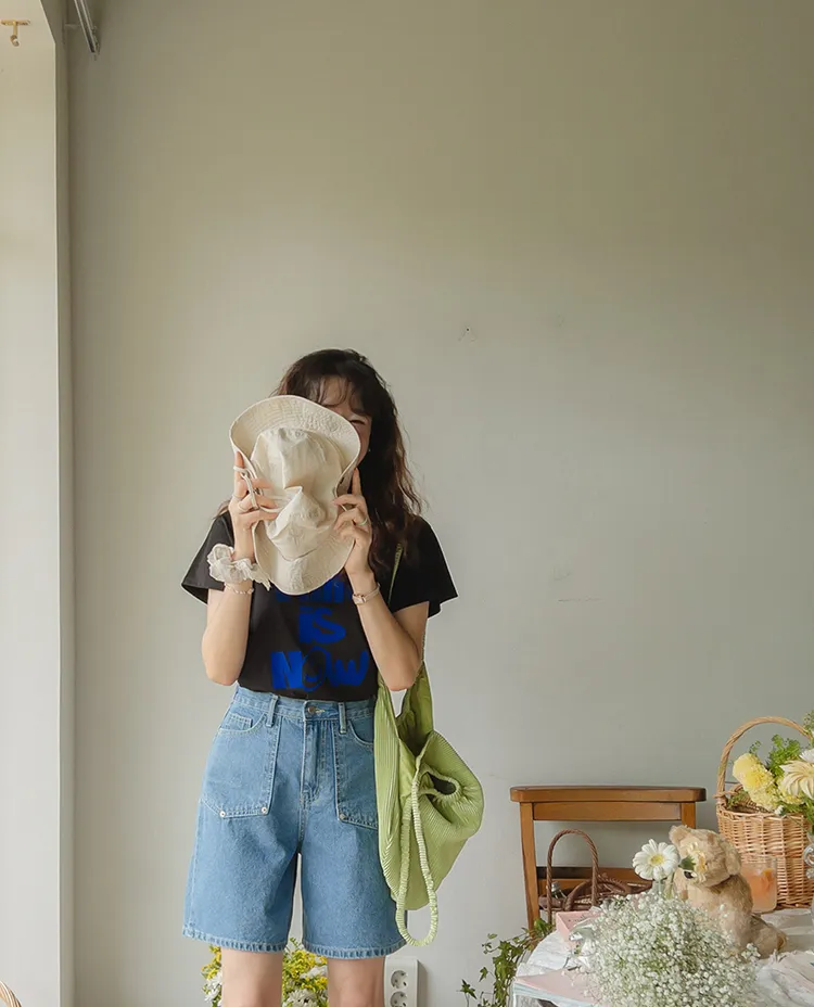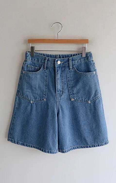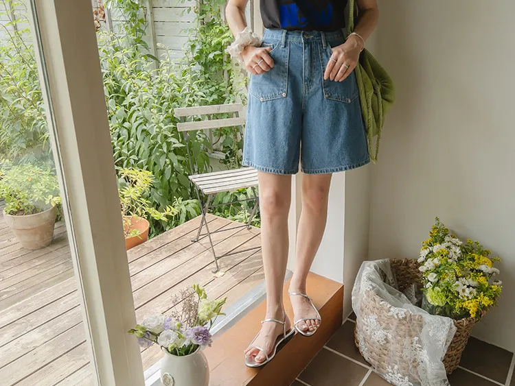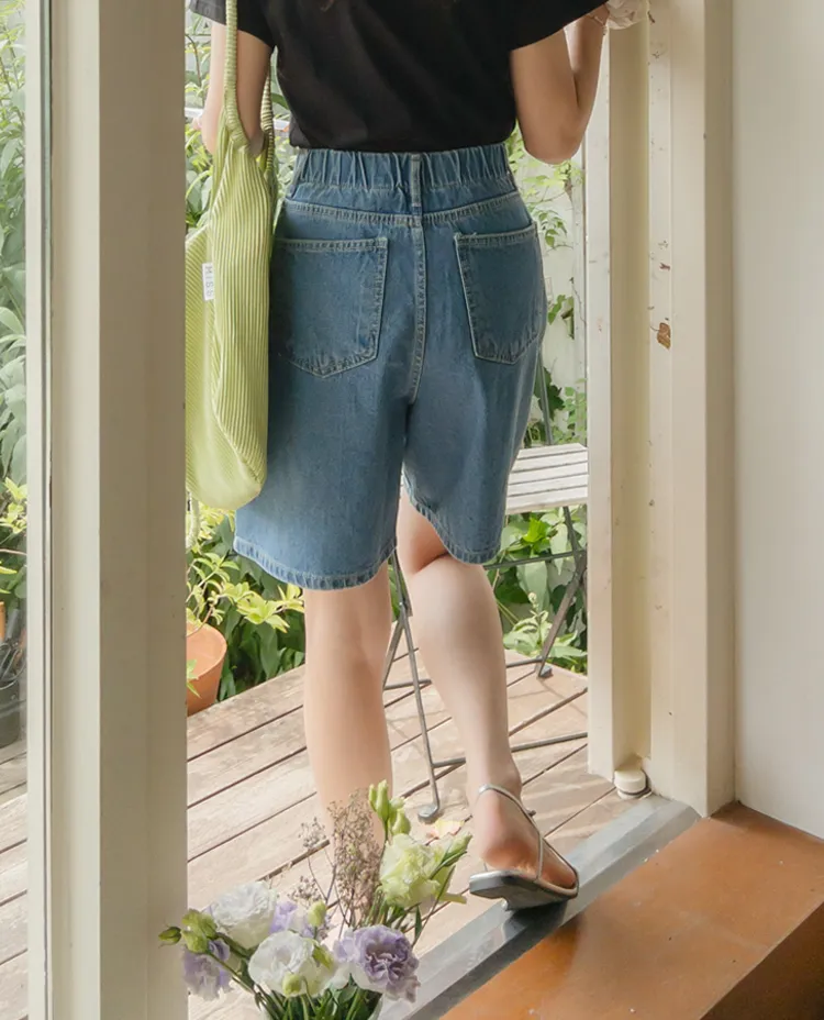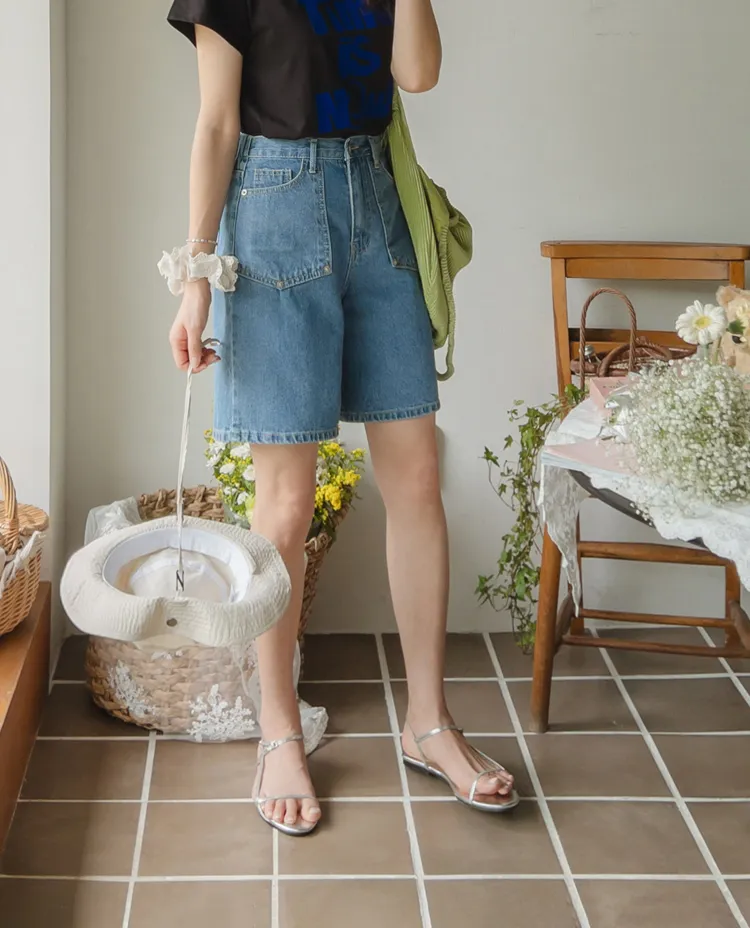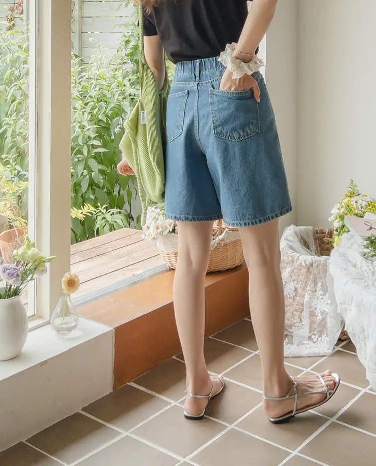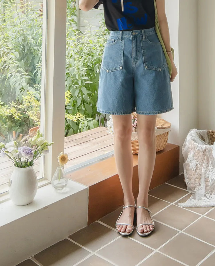 【有吸引力且獨特的口袋點! 牛仔短褲♥] [能打造感性造型] [半 A 字輪廓可修飾腿部線條] [緊身彈性背帶帶來舒適貼合感]