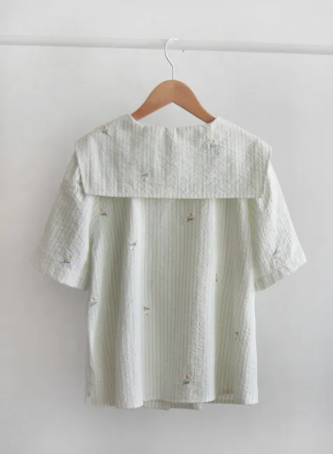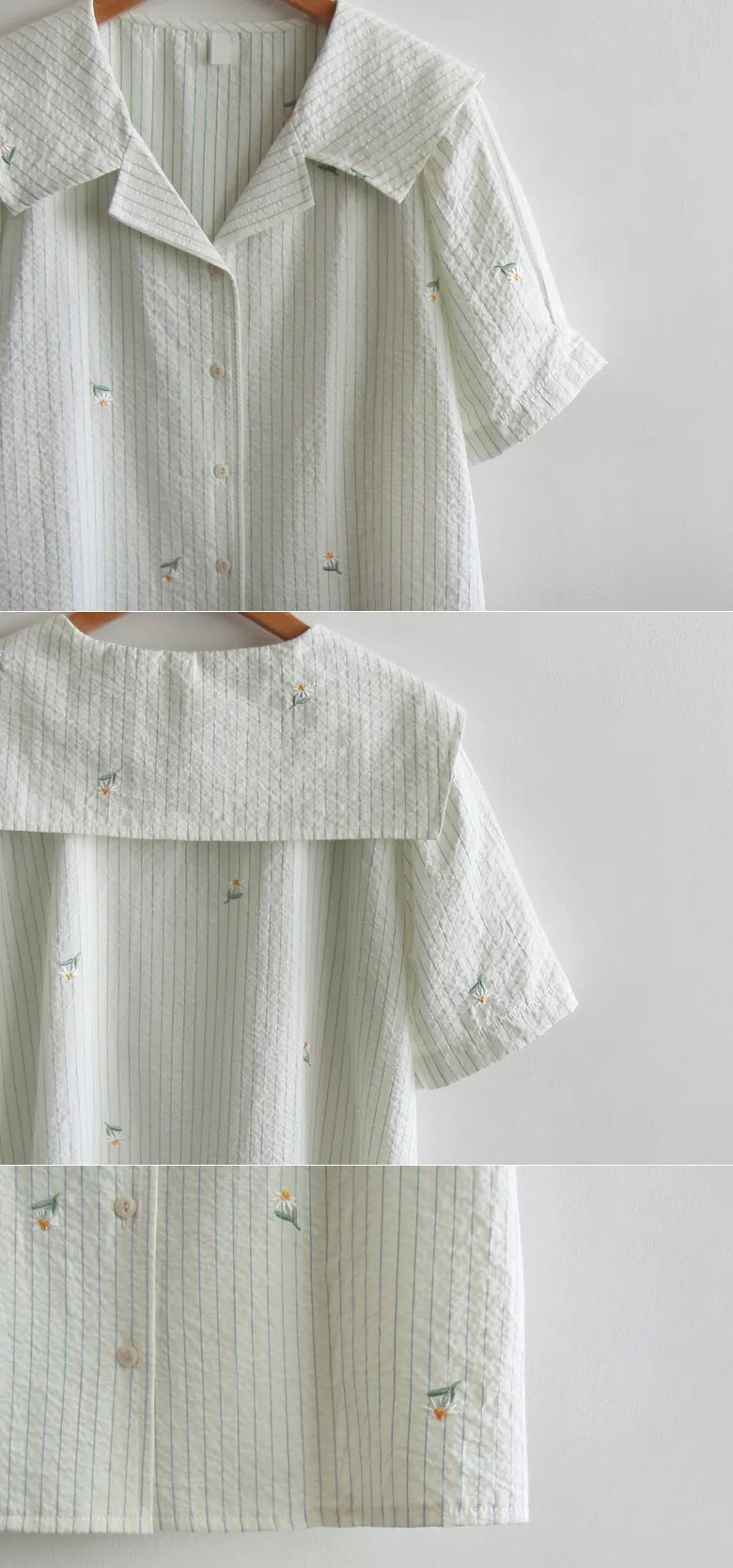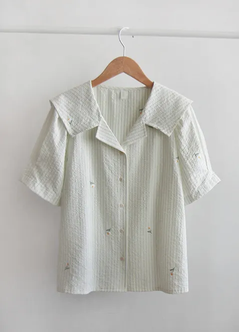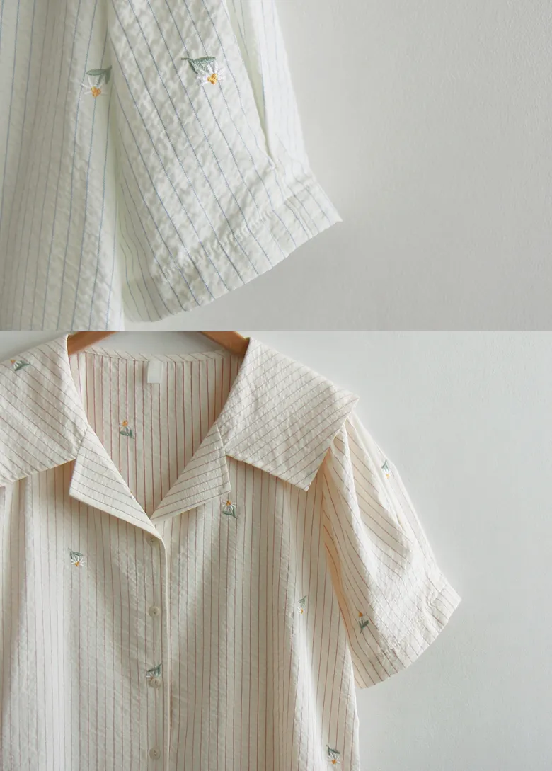 優雅領子剪裁花朵刺繡條紋泡泡紗排扣上衣