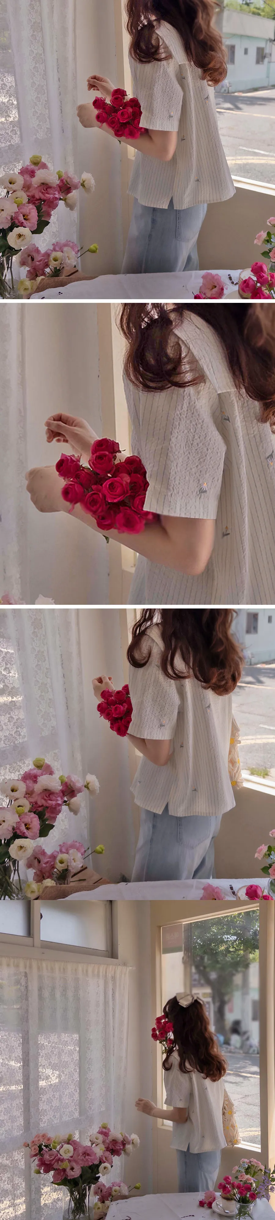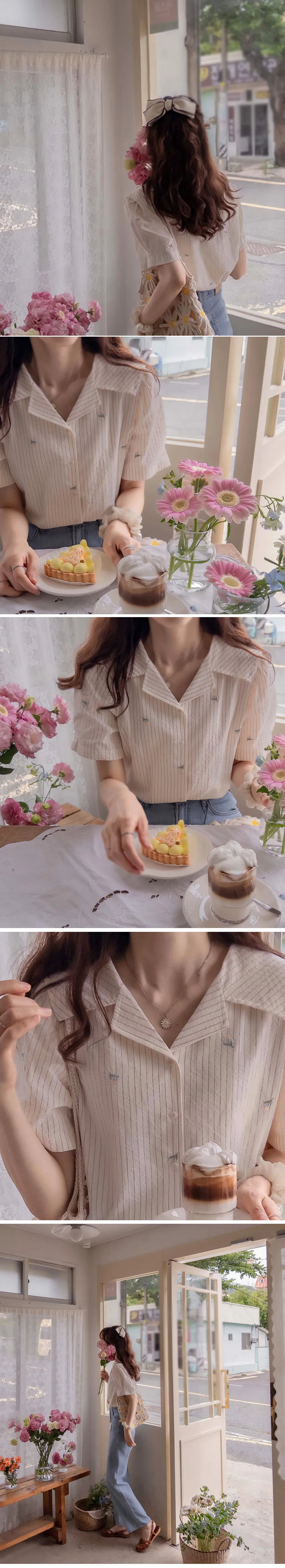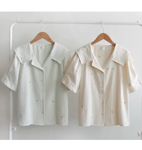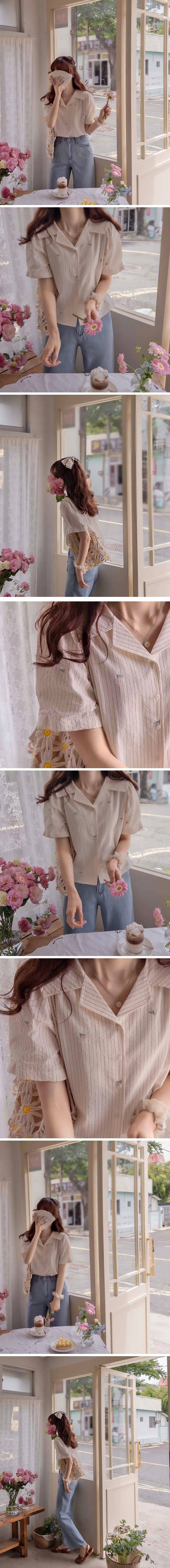 【可愛的彩色花卉刺繡設計】【泡泡紗布料夏季上衣,帶有微妙的皺紋】【泡泡袖,針狀袖子】【優雅合身,非常適合精緻的穿著】【微妙的條紋圖案也很漂亮。 】[推薦作為帶有優雅領子的夏季排扣上衣]