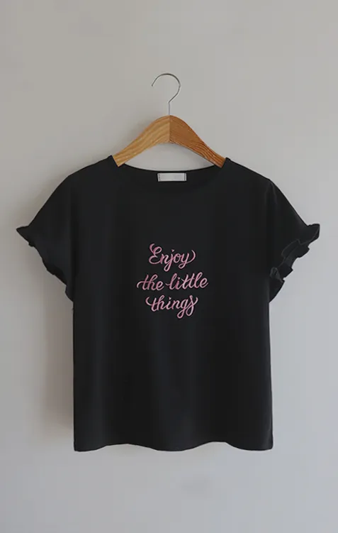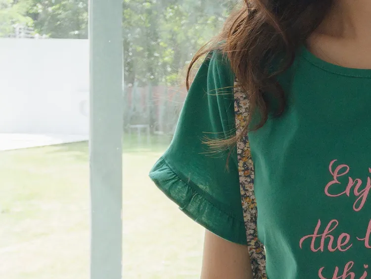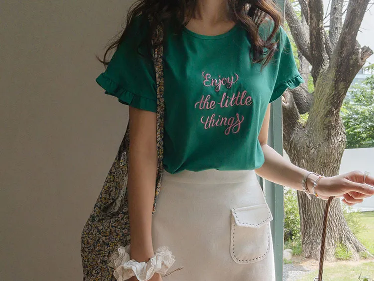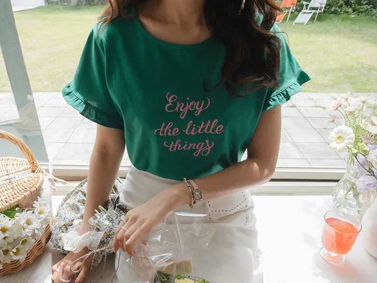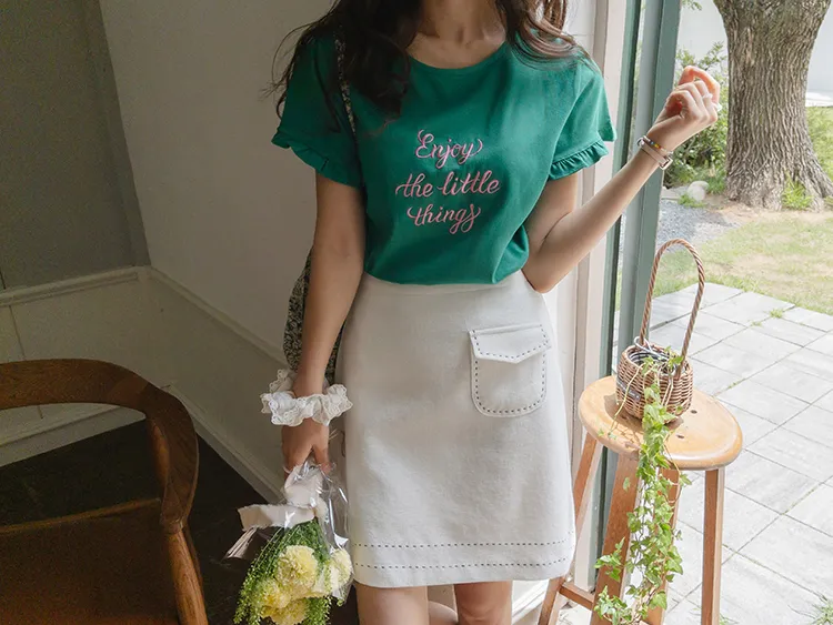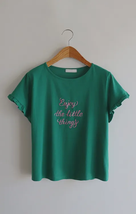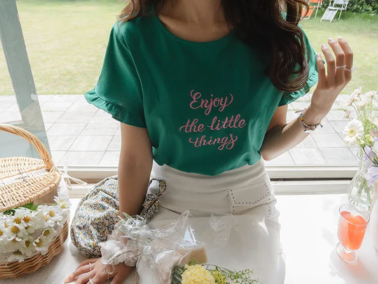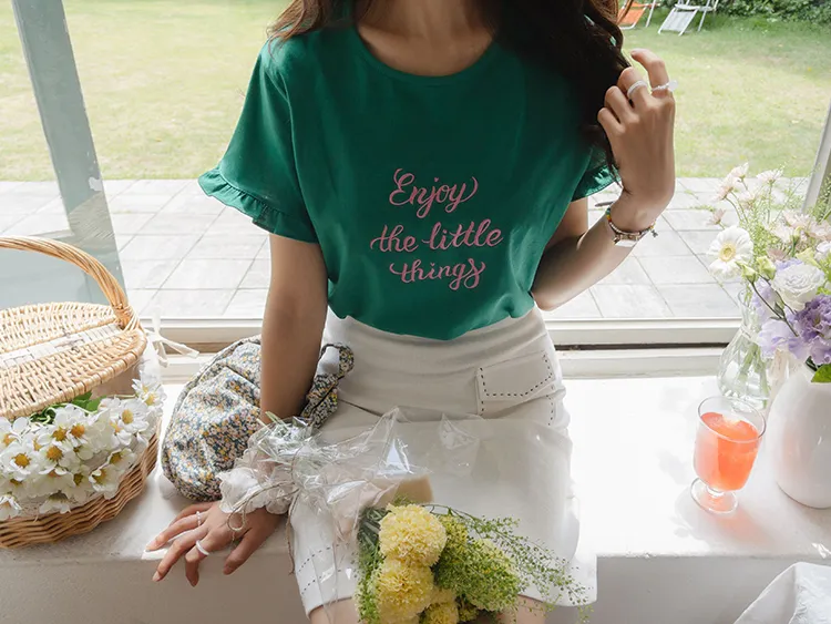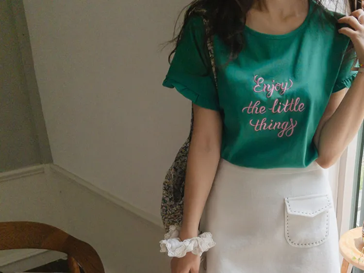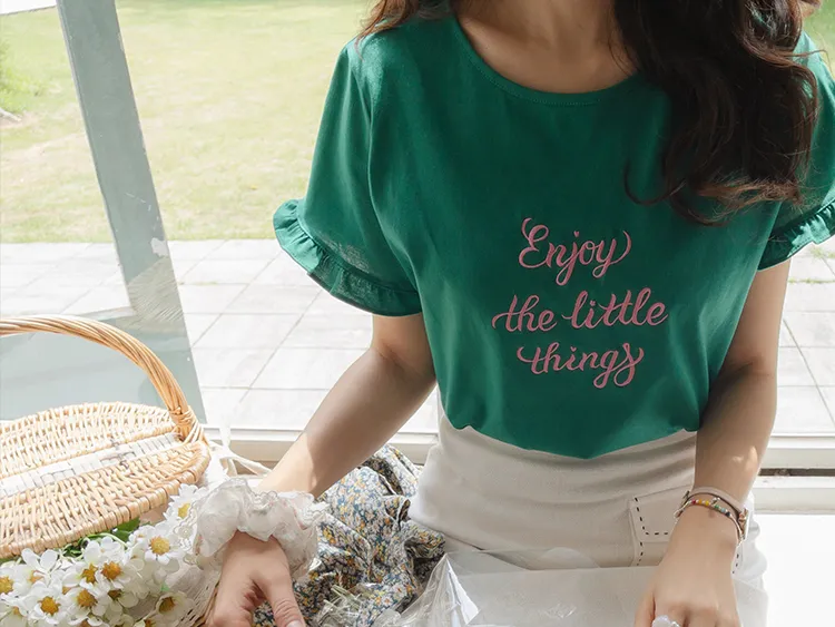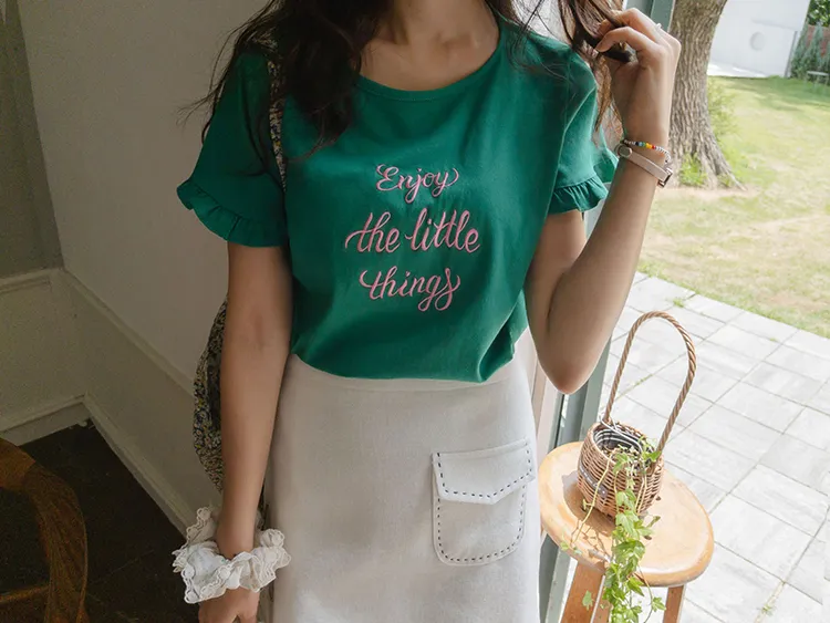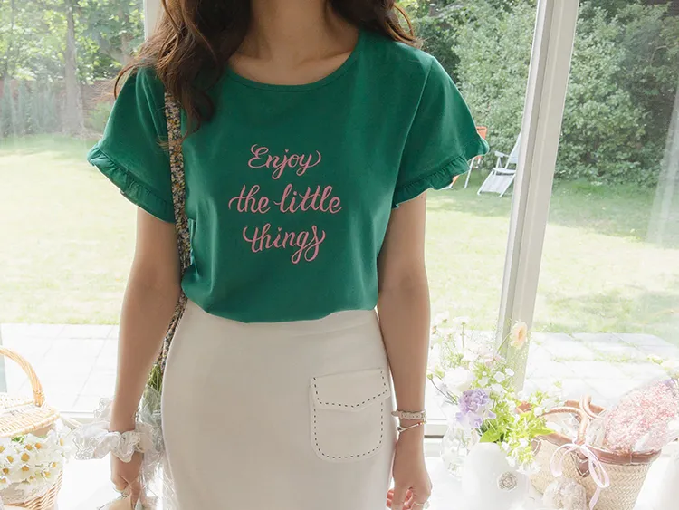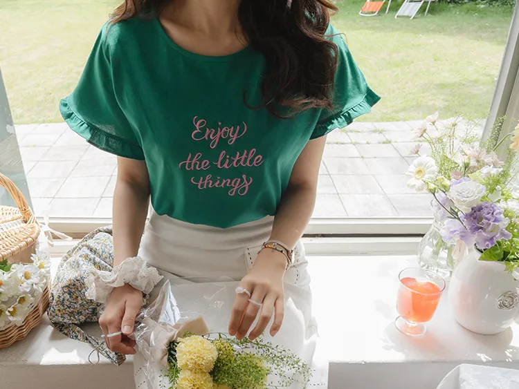 清新浪漫配色刺繡字母袖末荷葉摺邊短袖上衣