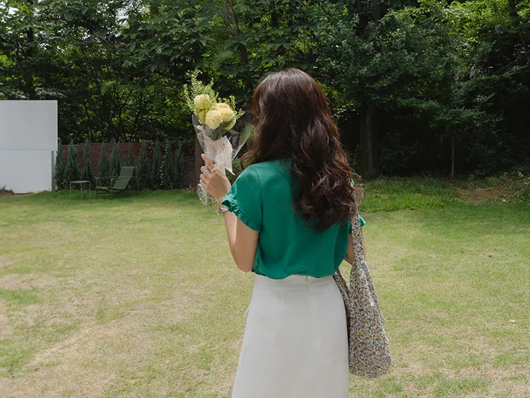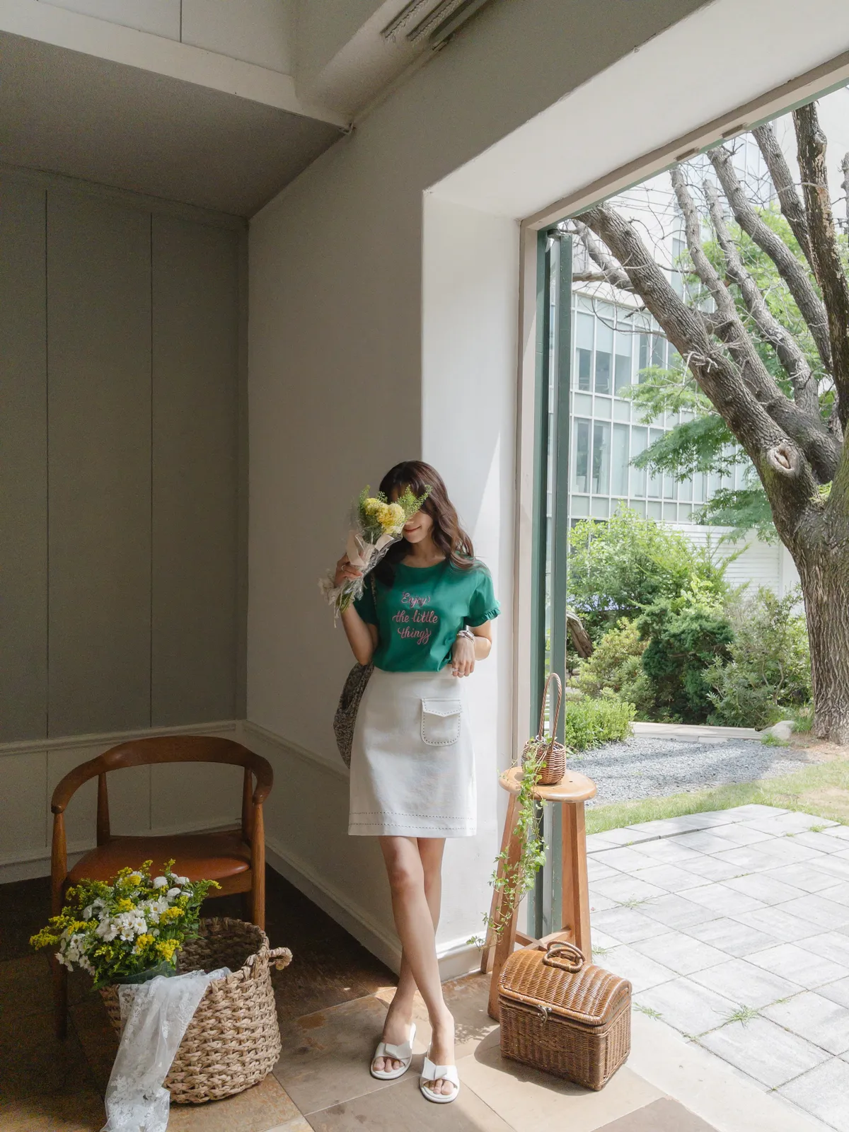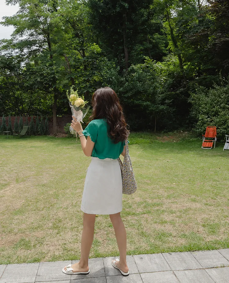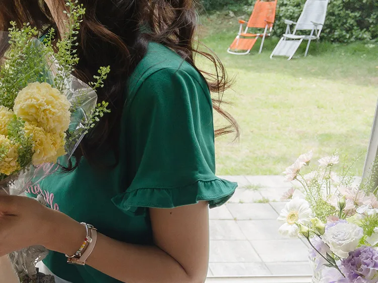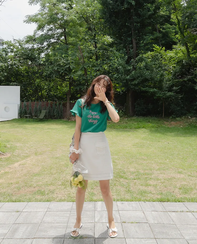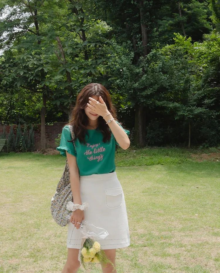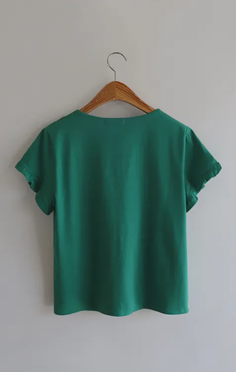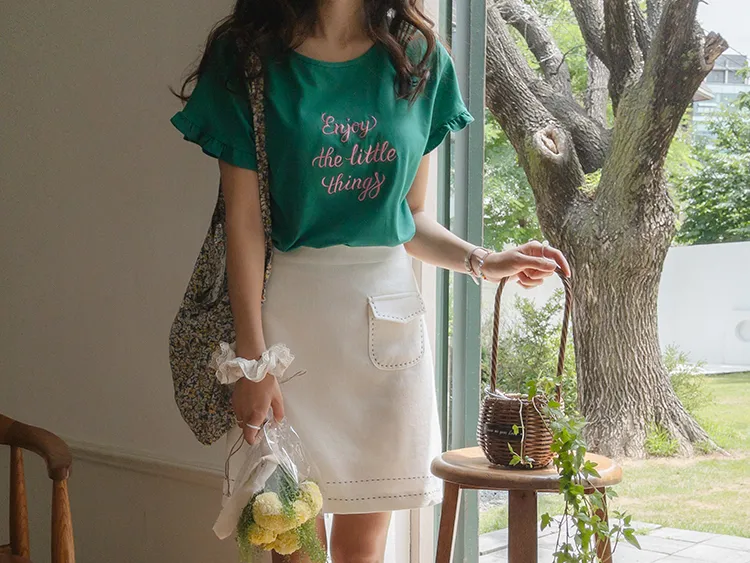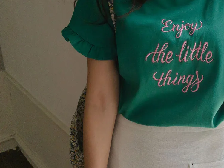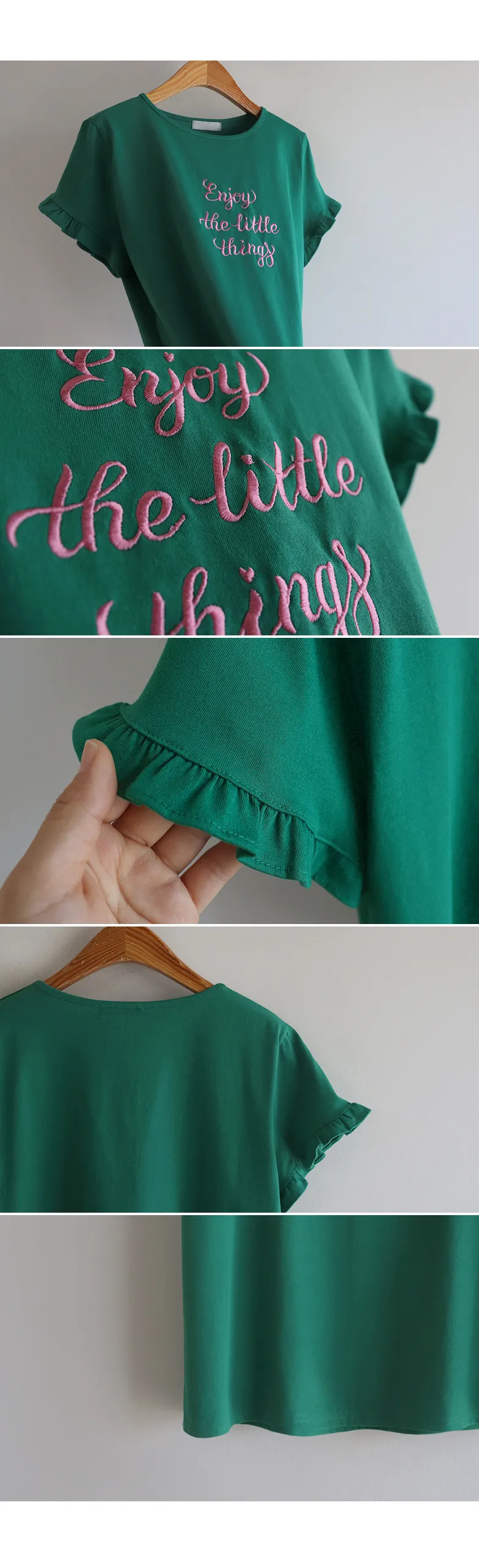 清新浪漫配色刺繡字母袖末荷葉摺邊短袖上衣
