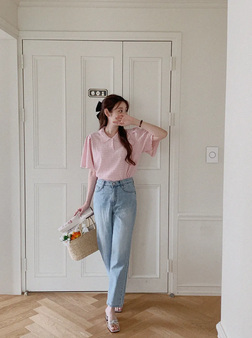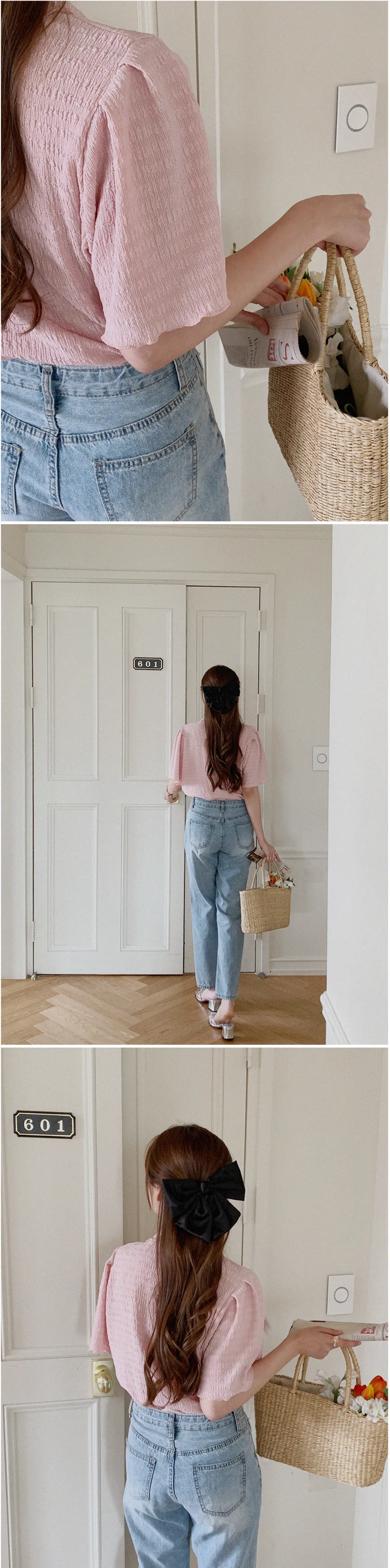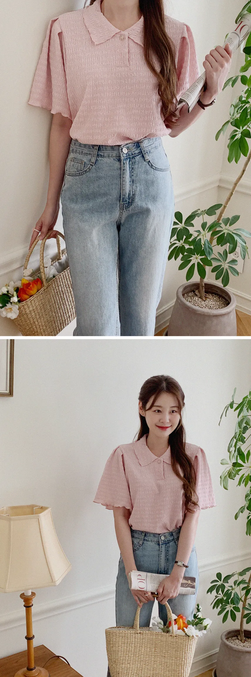 可愛復古蝴蝶結鈕扣有領皺摺彈性上衣