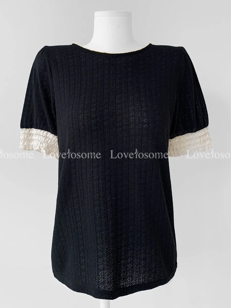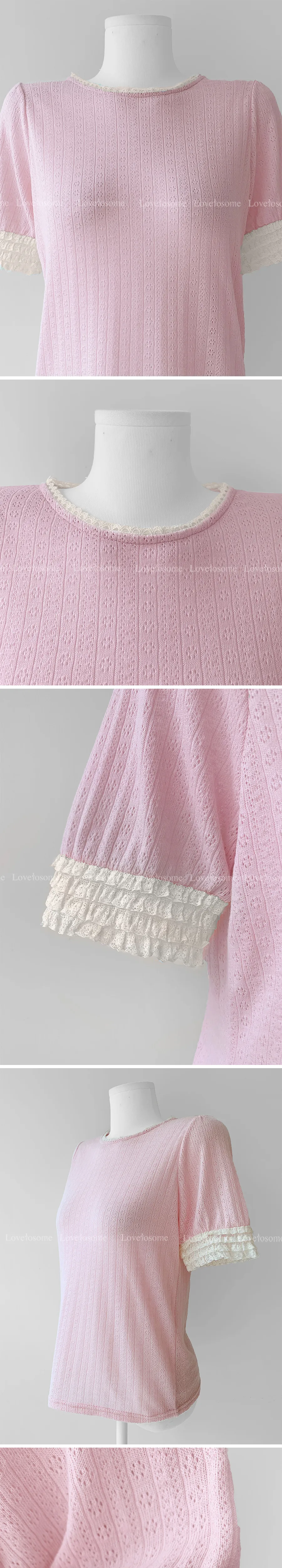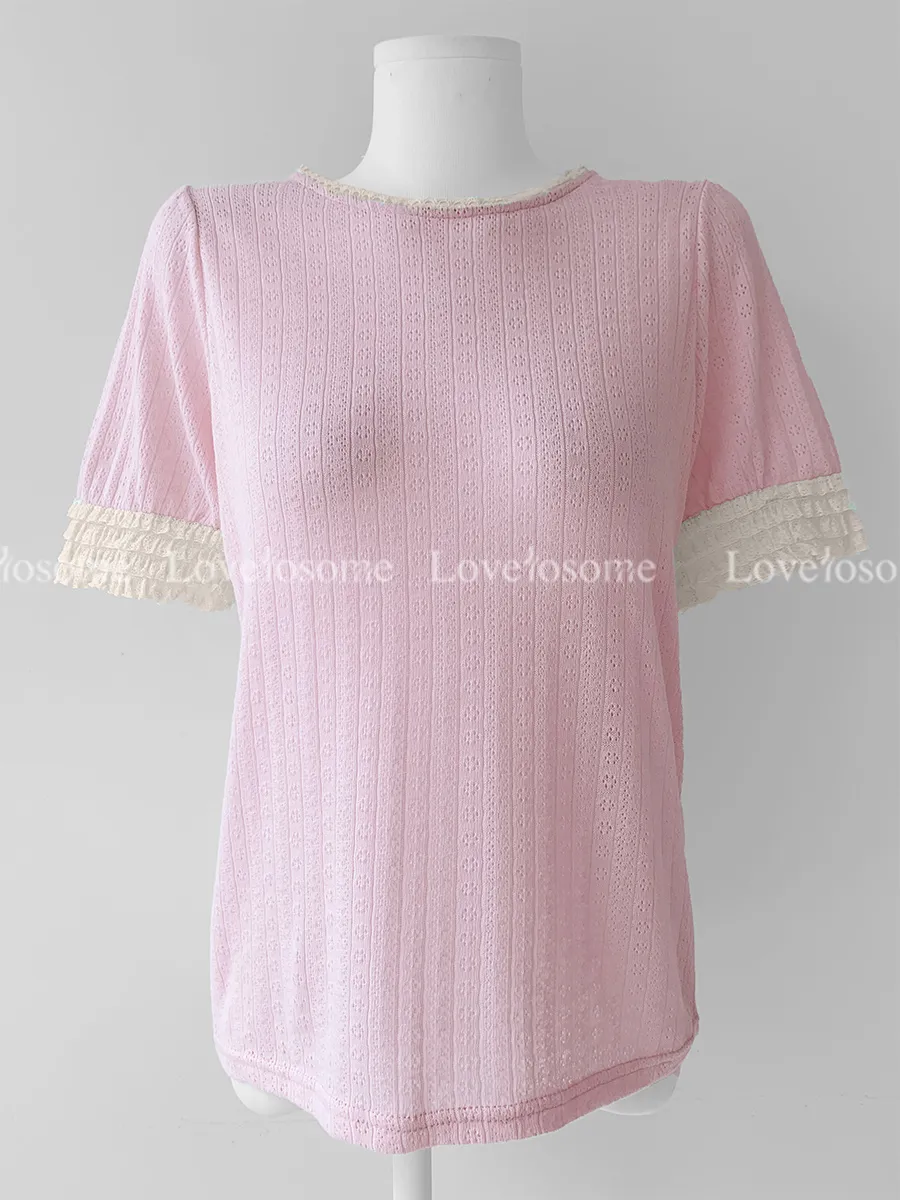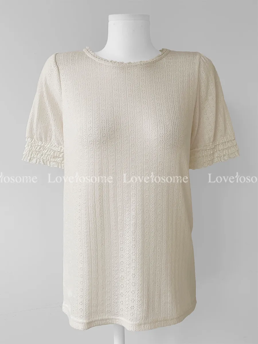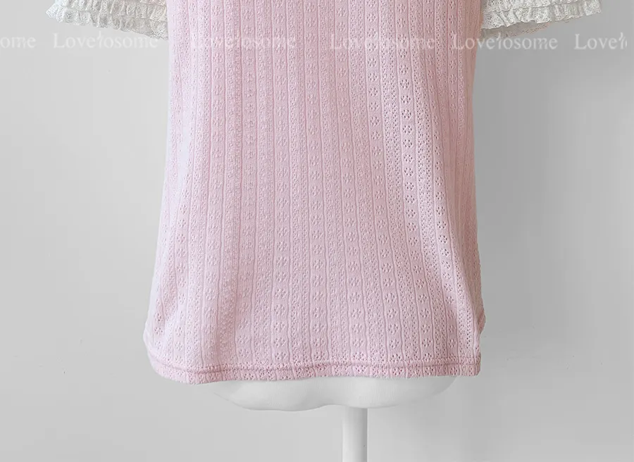 蕾絲領口袖邊鏤空孔洞短袖上衣