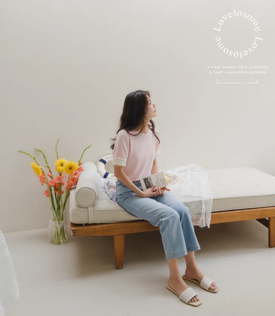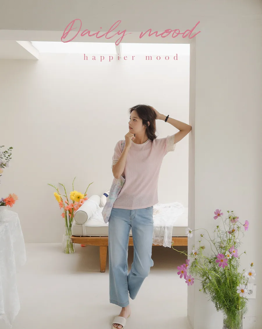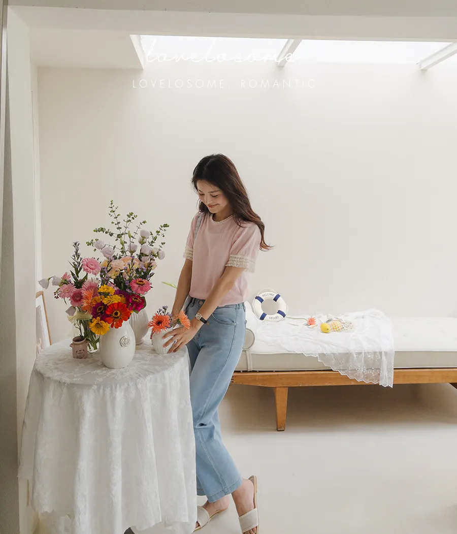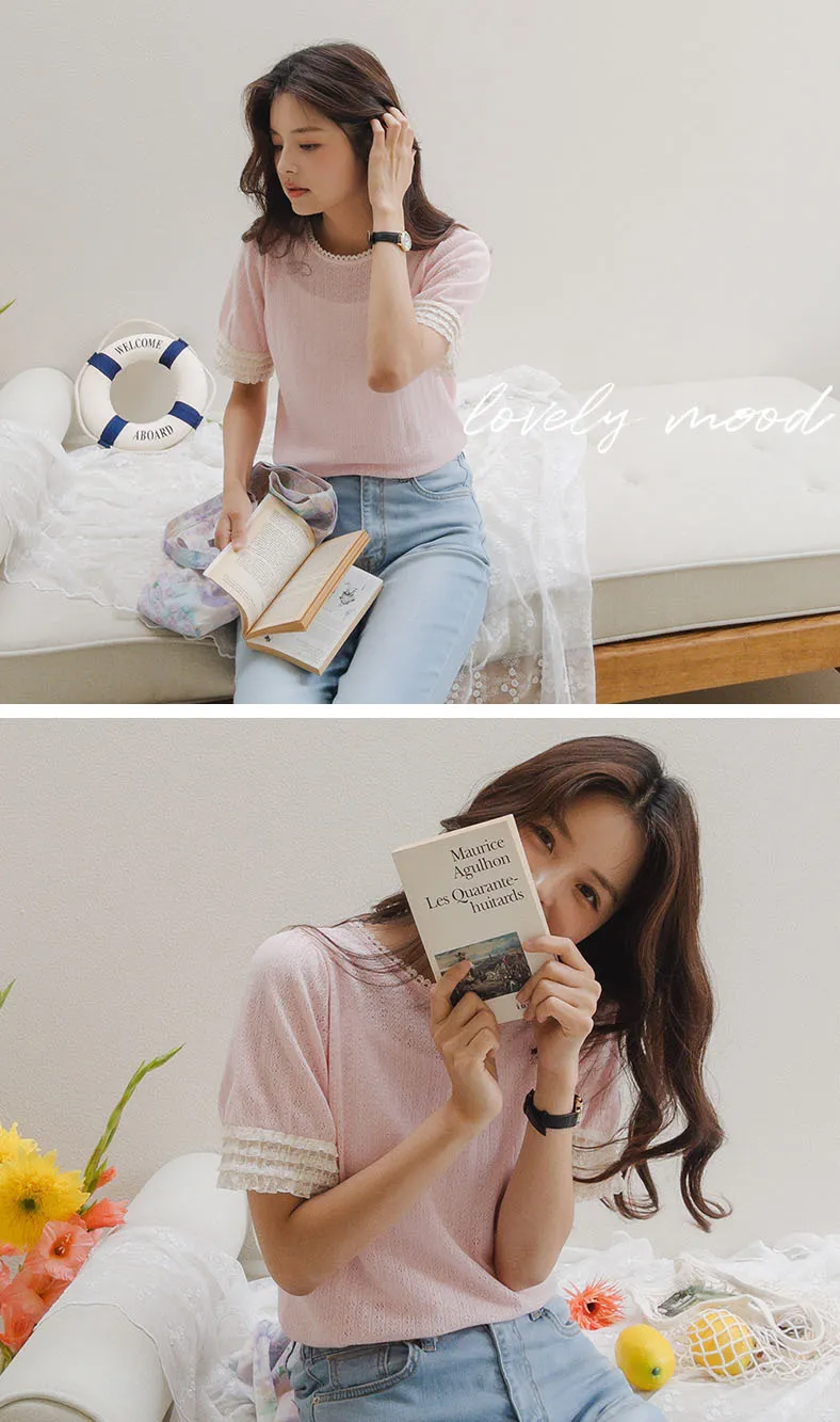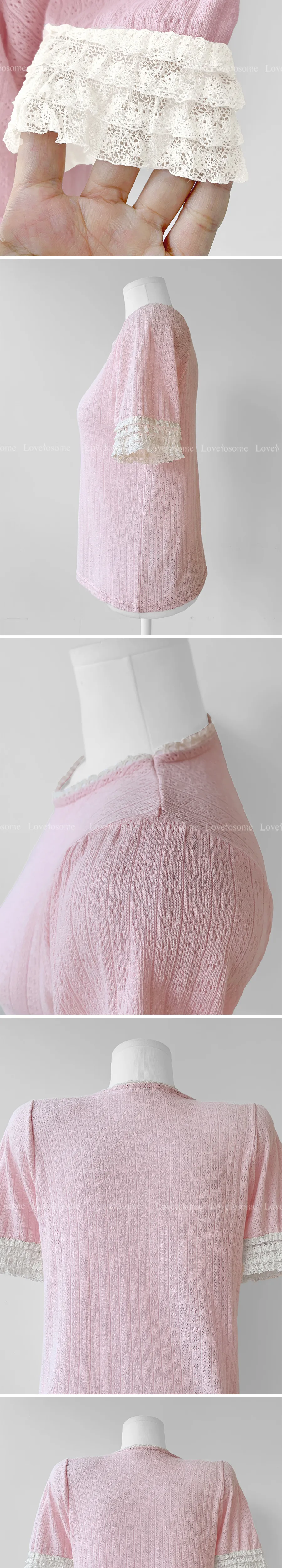 蕾絲領口袖邊鏤空孔洞短袖上衣