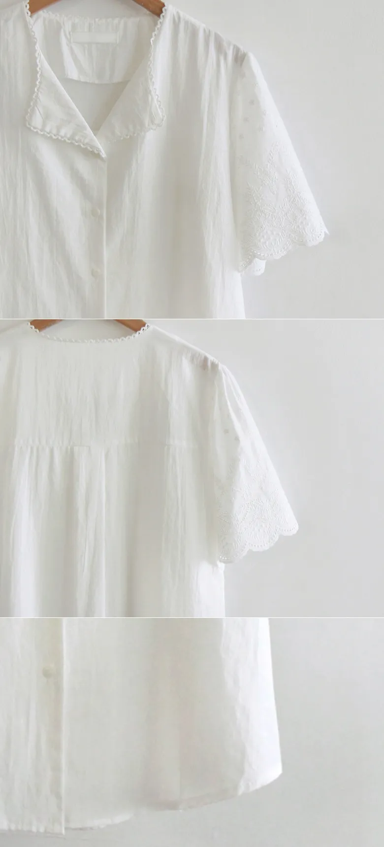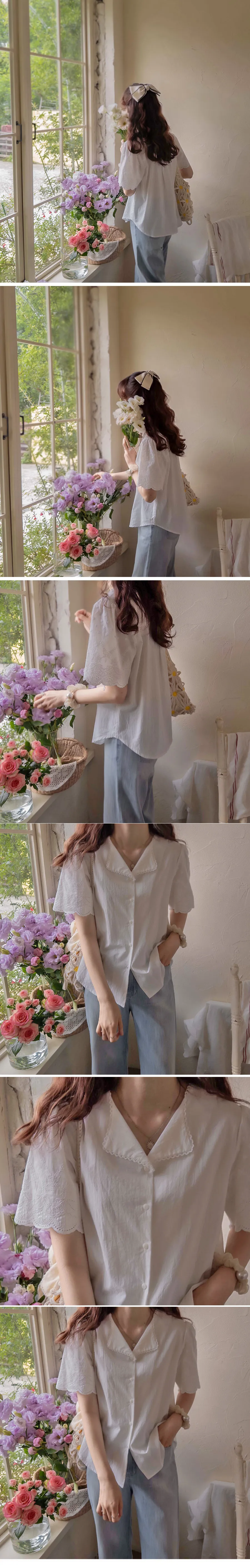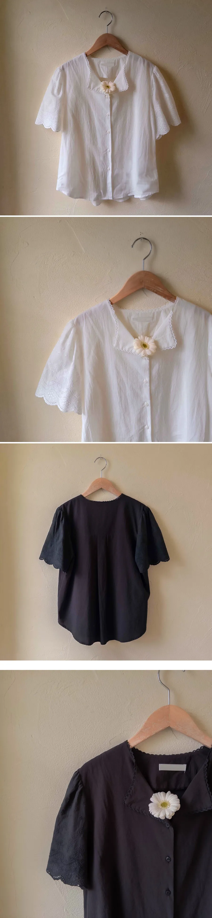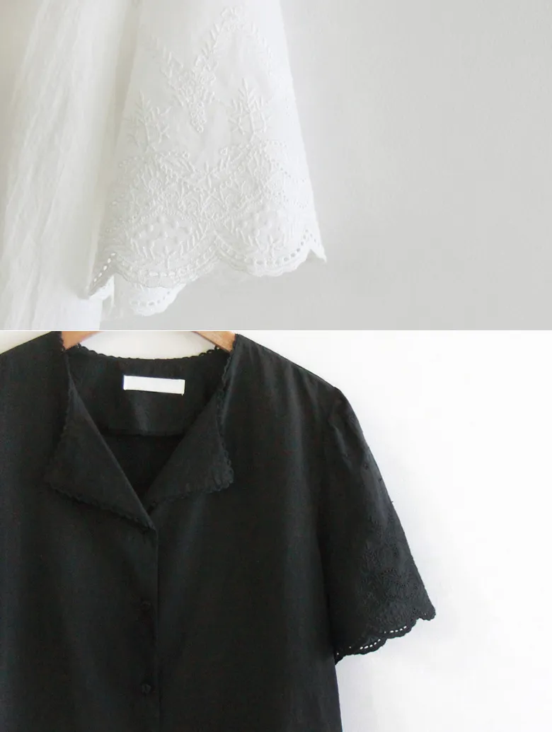 【薄款的夏季布料】【明亮精緻的顏色】【領口是迷你蕾絲,很漂亮】【袖子有花卉刺繡,末端有波浪刺繡,營造出可愛的心情】【微妙的剪裁很漂亮】[推薦作為優雅的夏季排扣上衣,設計可愛]