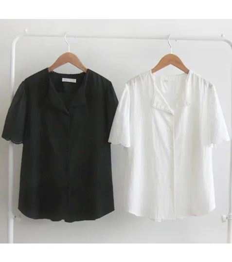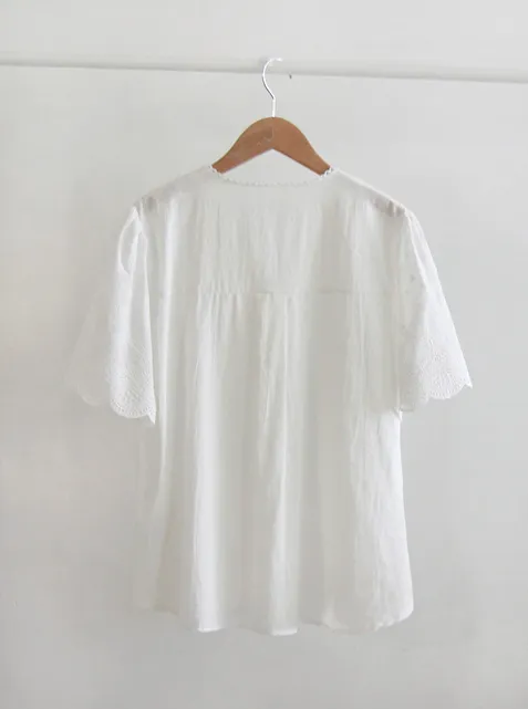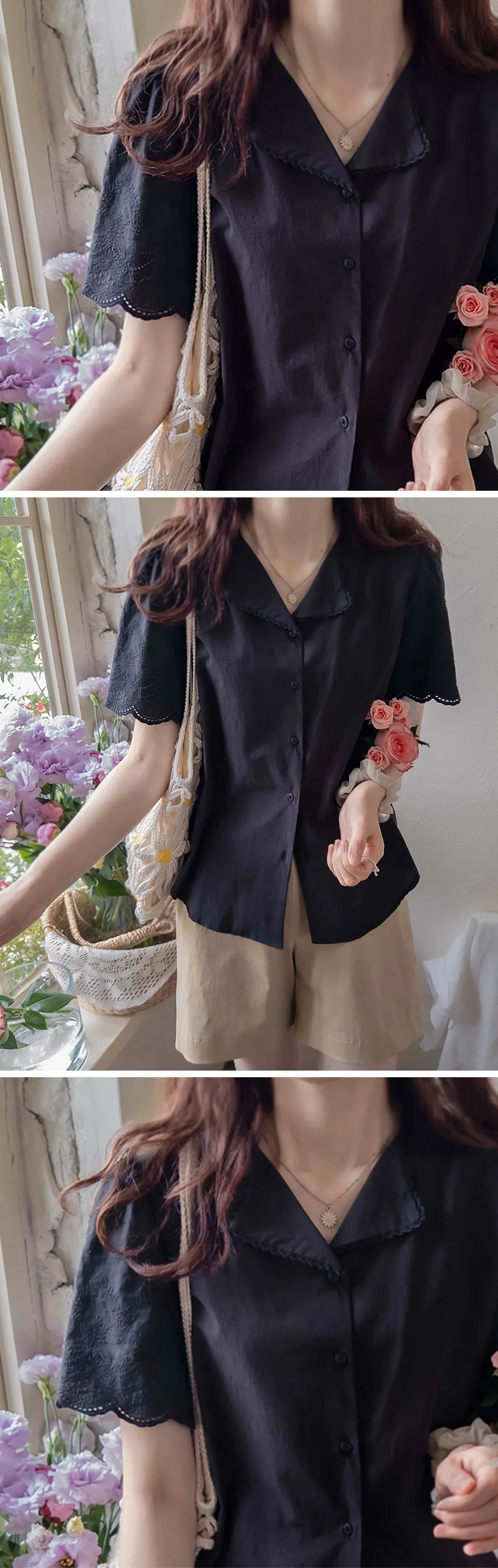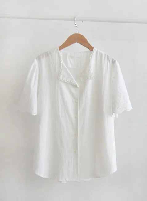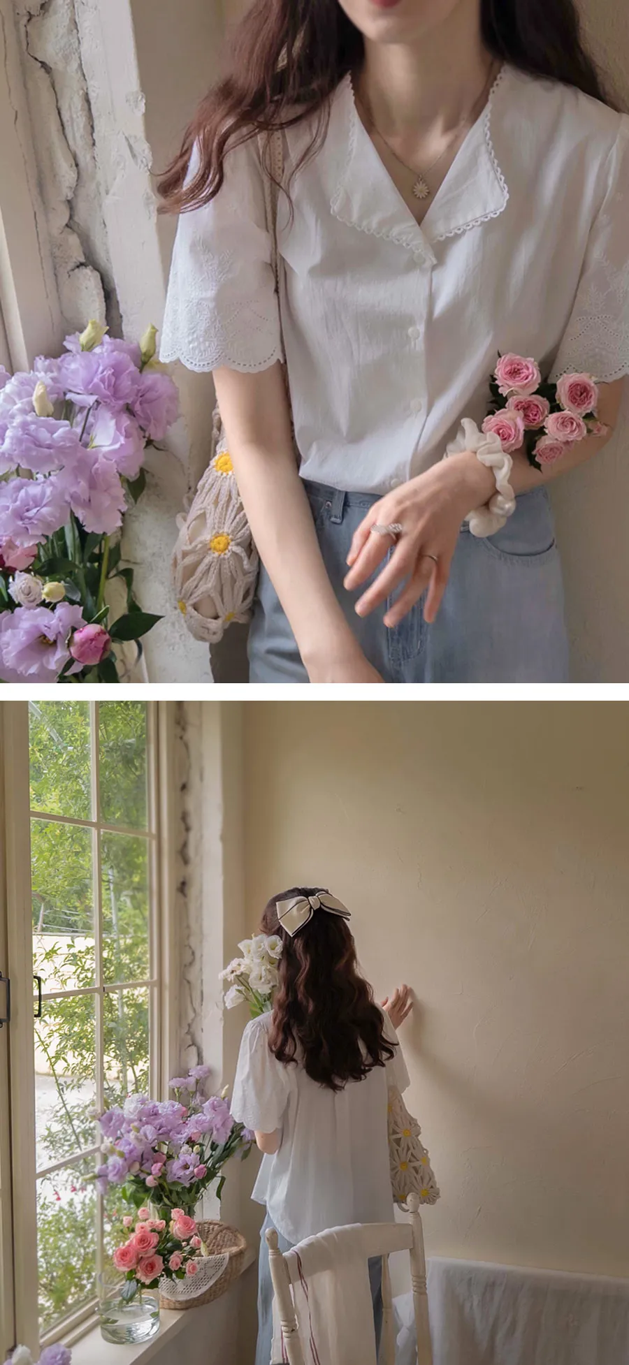 【薄款的夏季布料】【明亮精緻的顏色】【領口是迷你蕾絲,很漂亮】【袖子有花卉刺繡,末端有波浪刺繡,營造出可愛的心情】【微妙的剪裁很漂亮】[推薦作為優雅的夏季排扣上衣,設計可愛]