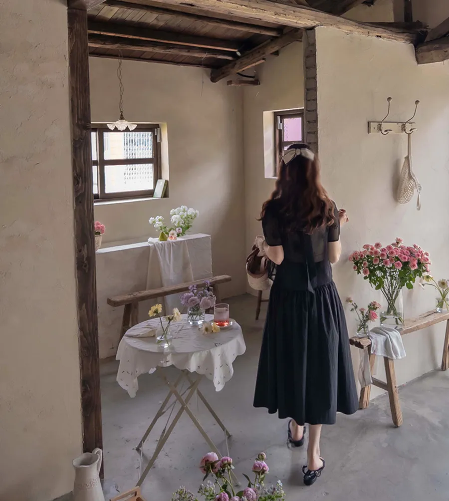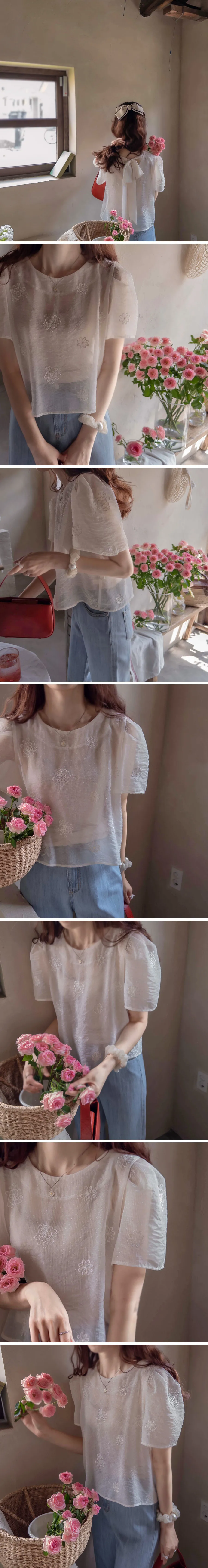 後領:繫絲綁帶穿著][適合夏季的明亮上衣][明亮或精緻的顏色][花朵刺繡,營造出可愛的心情][漂亮的泡泡袖,肩部有微妙的剪裁][適合夏季的涼爽上衣微妙純粹的細節]