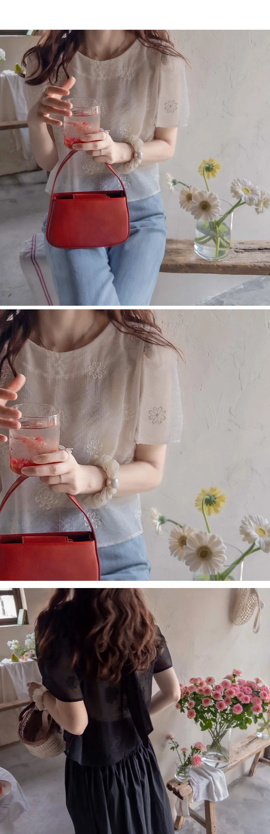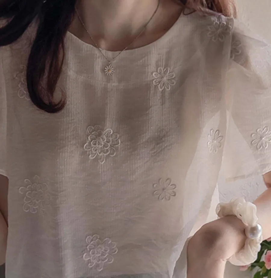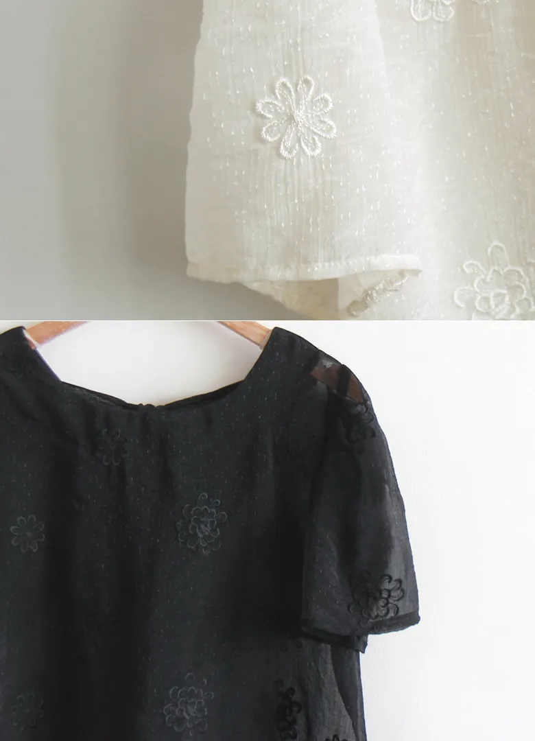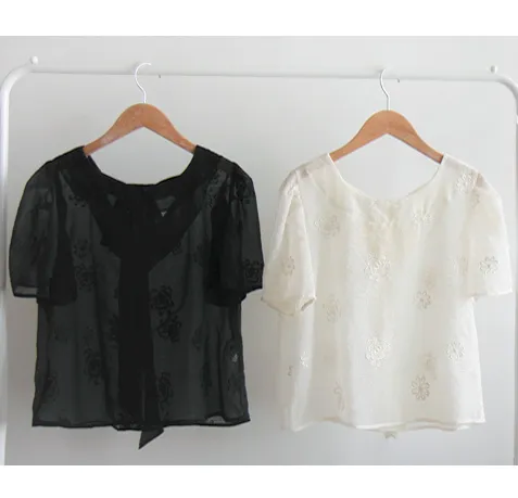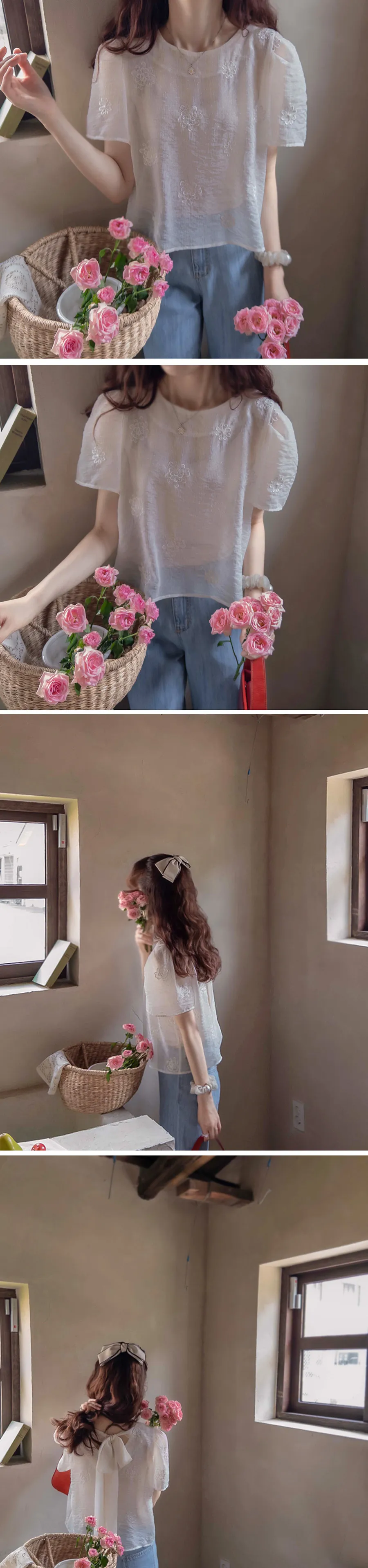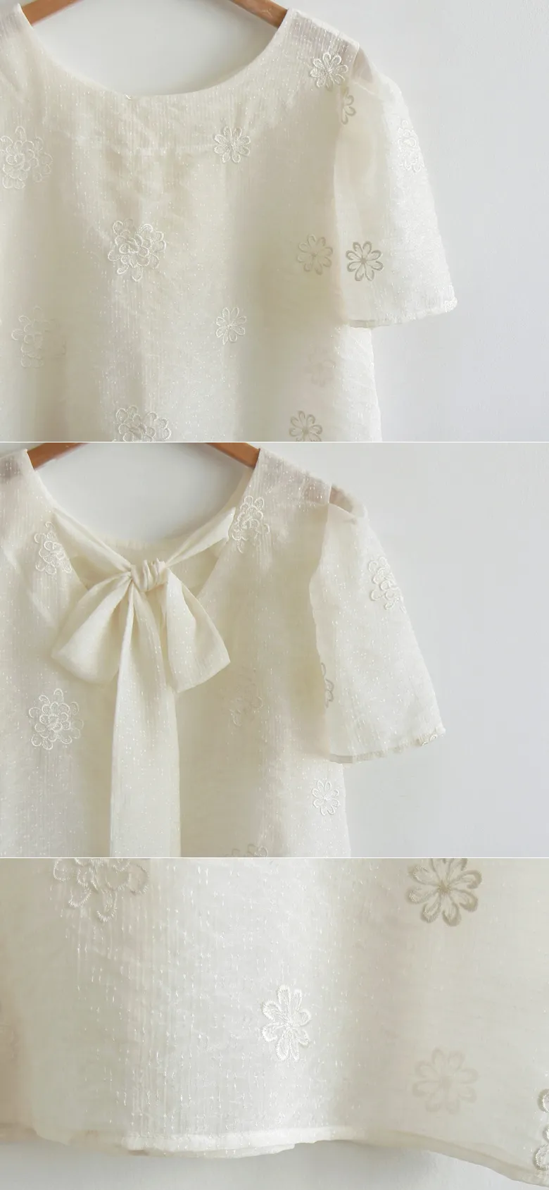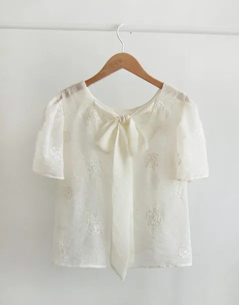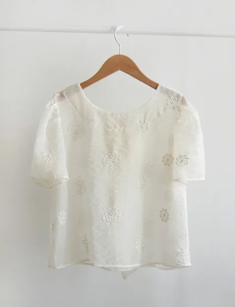 可愛後綁帶肩線剪裁花朵刺繡上衣