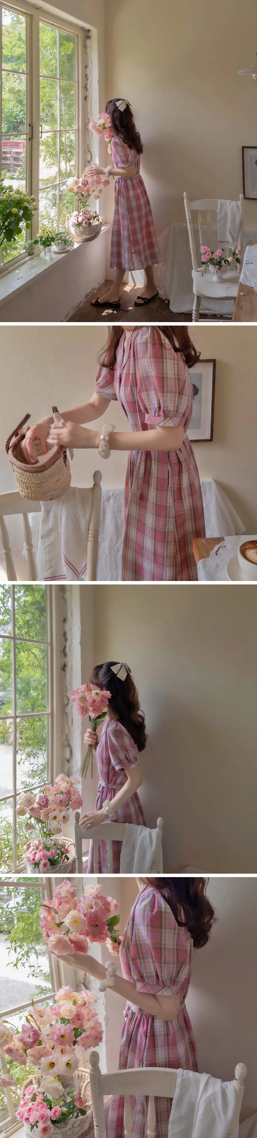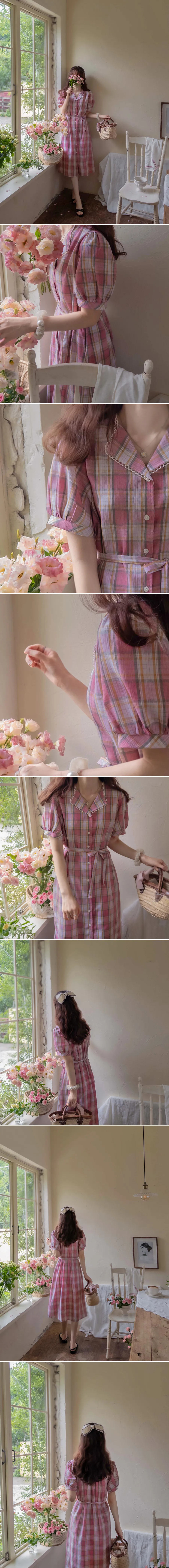 輕盈可愛領口波浪蕾絲附綁帶格紋連身裙