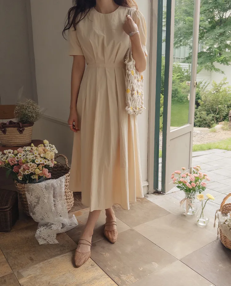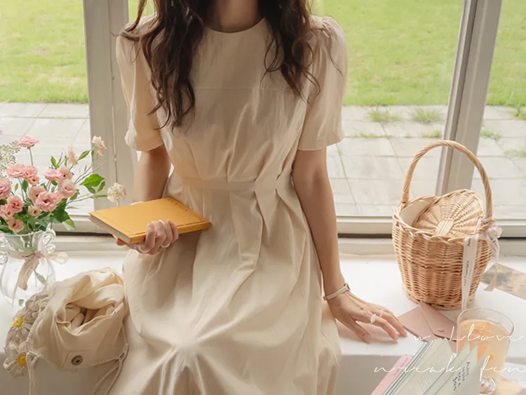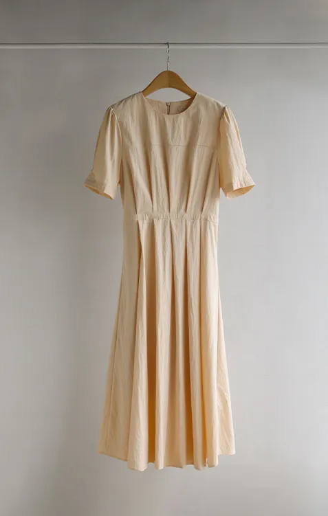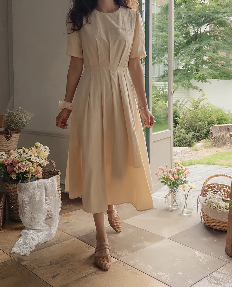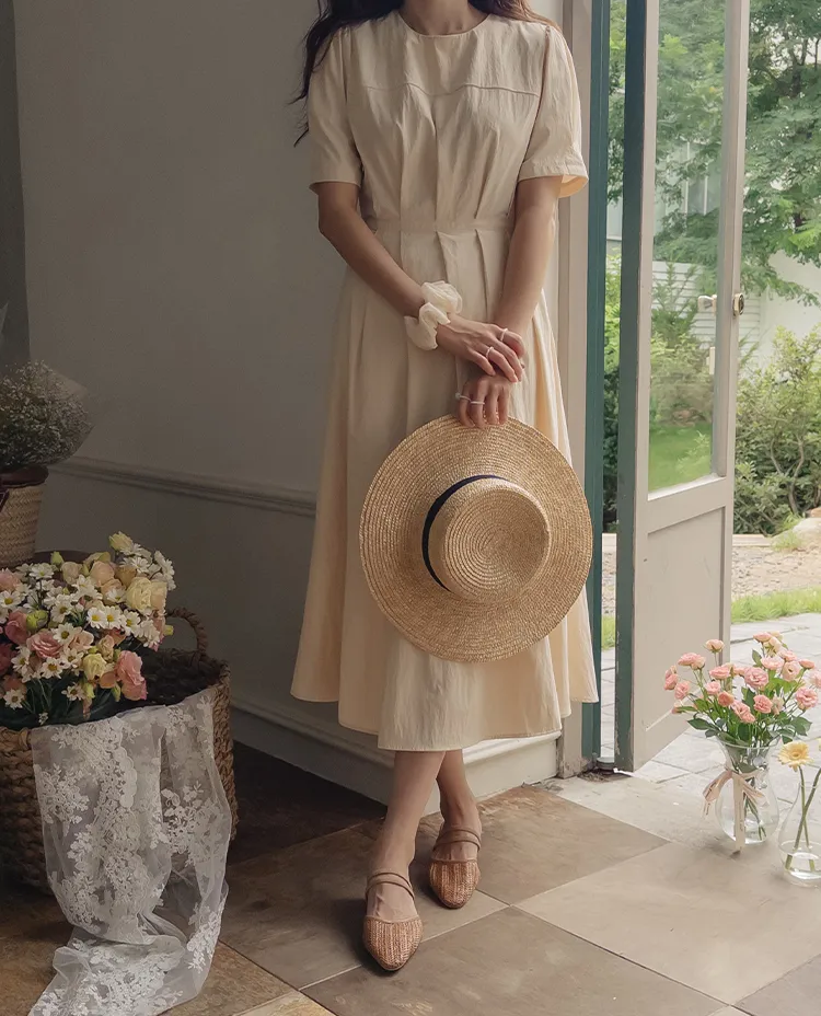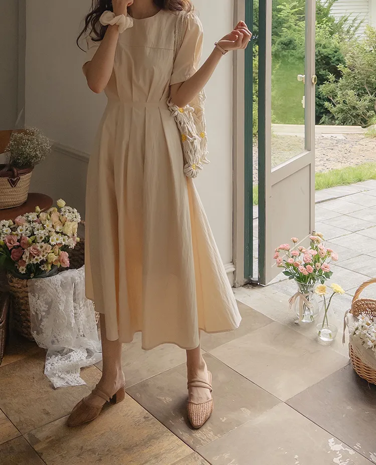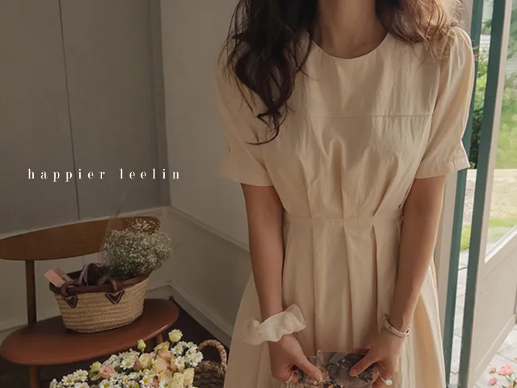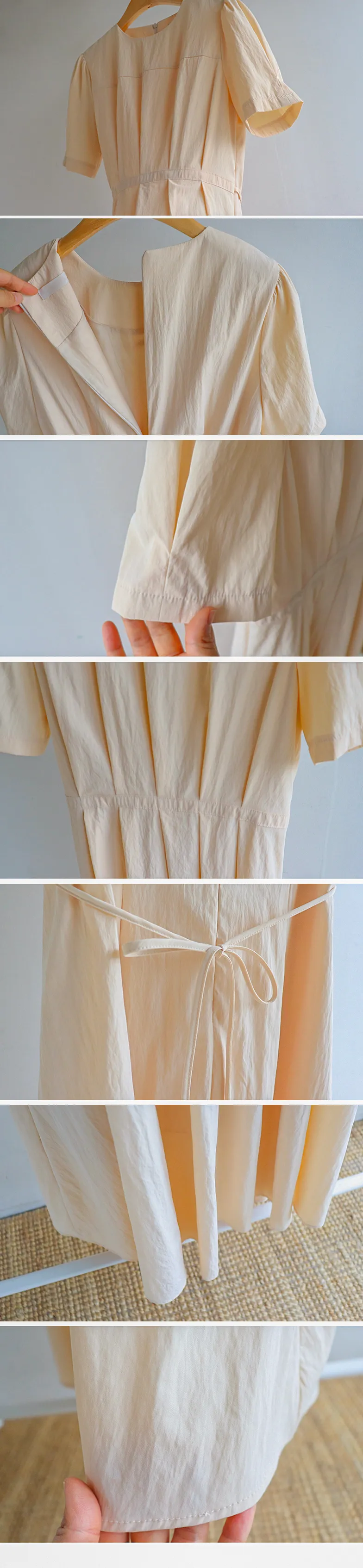 【鬆脆的材質,清新舒適~針褶連身裙♥】【針褶真的很漂亮~】【傘擺A字輪廓有遮蓋身形的效果】【抗皺的連身裙】 【細繩綁帶打造纖細腰線】
