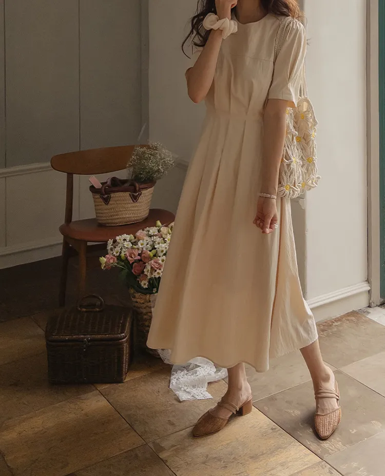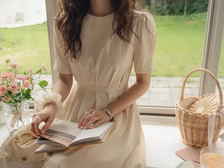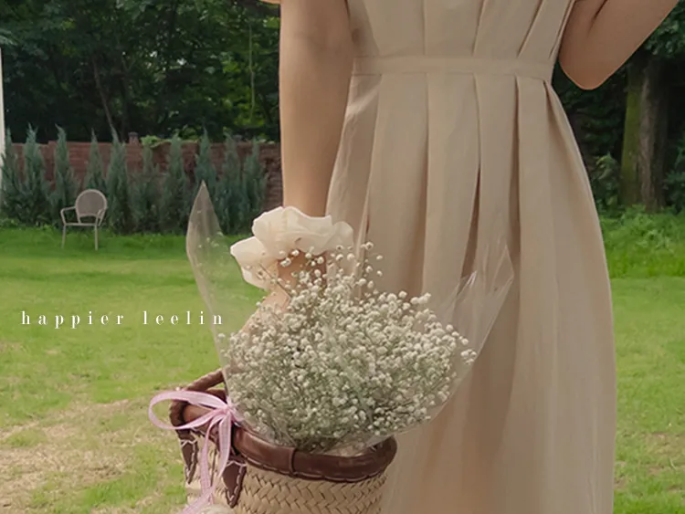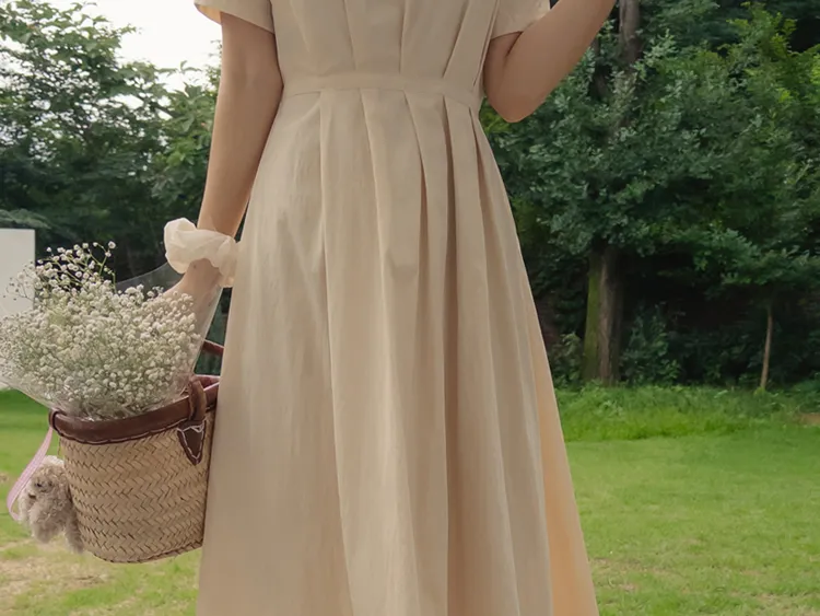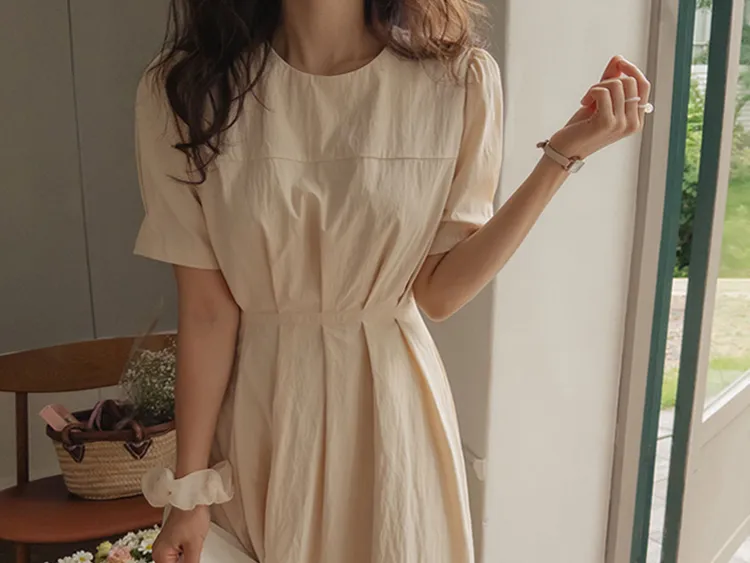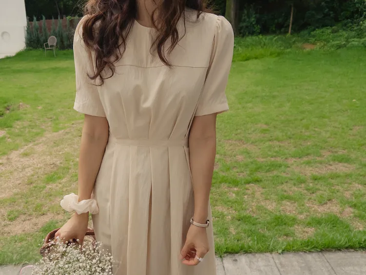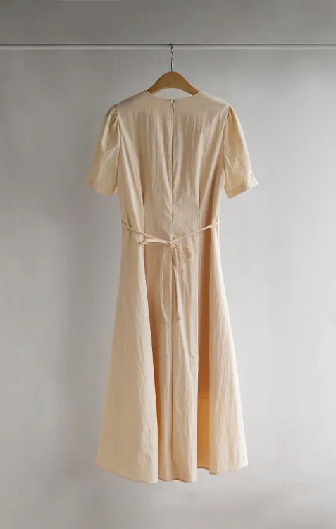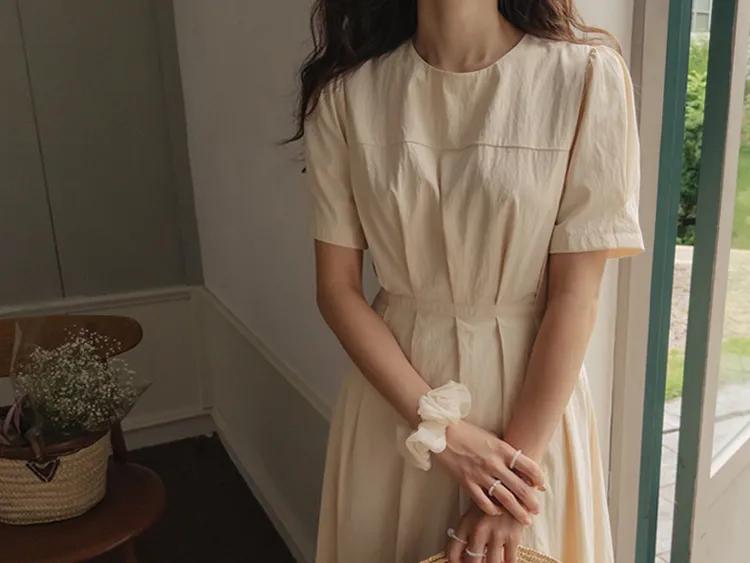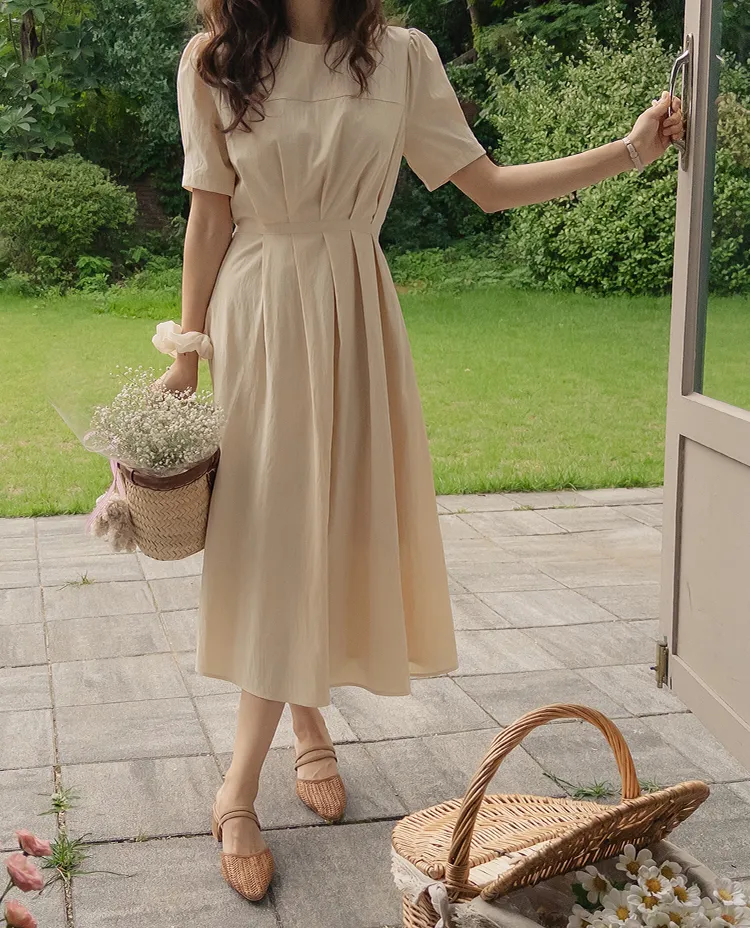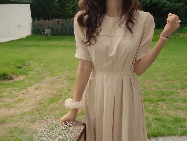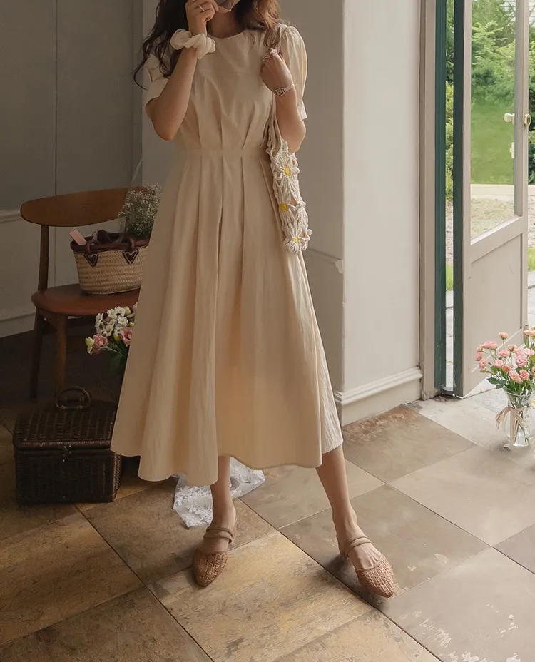 【鬆脆的材質,清新舒適~針褶連身裙♥】【針褶真的很漂亮~】【傘擺A字輪廓有遮蓋身形的效果】【抗皺的連身裙】 【細繩綁帶打造纖細腰線】