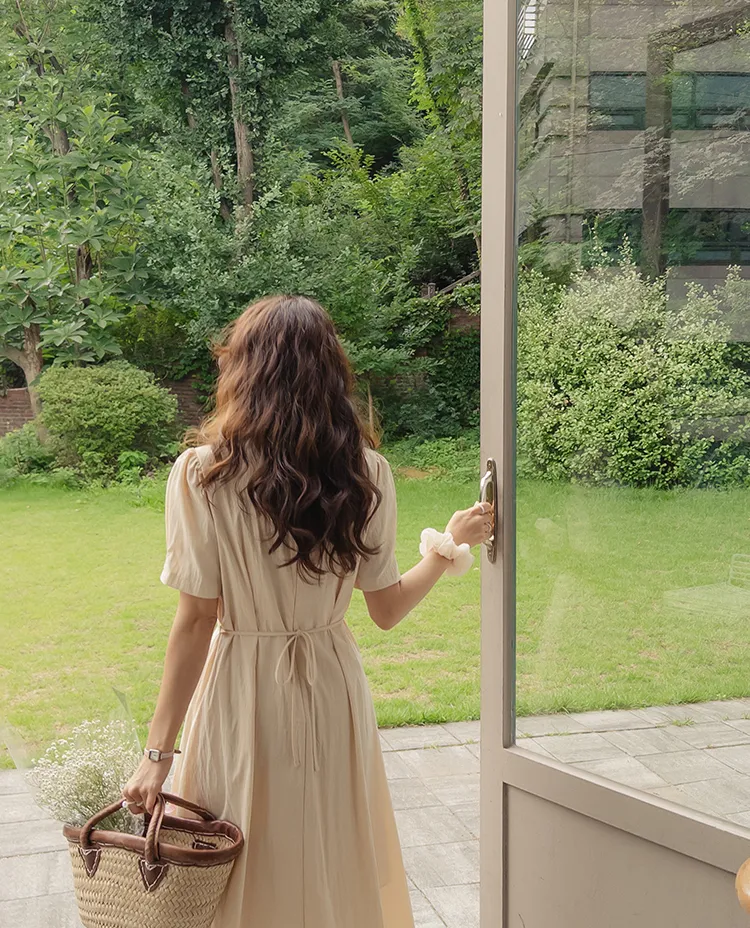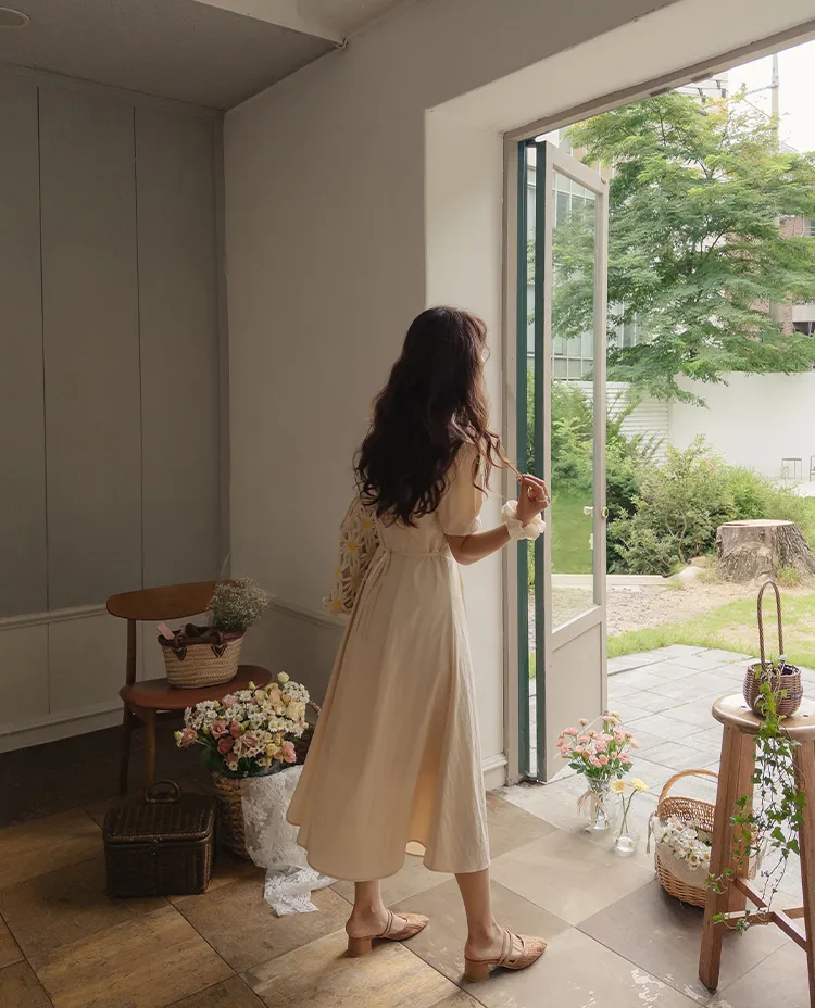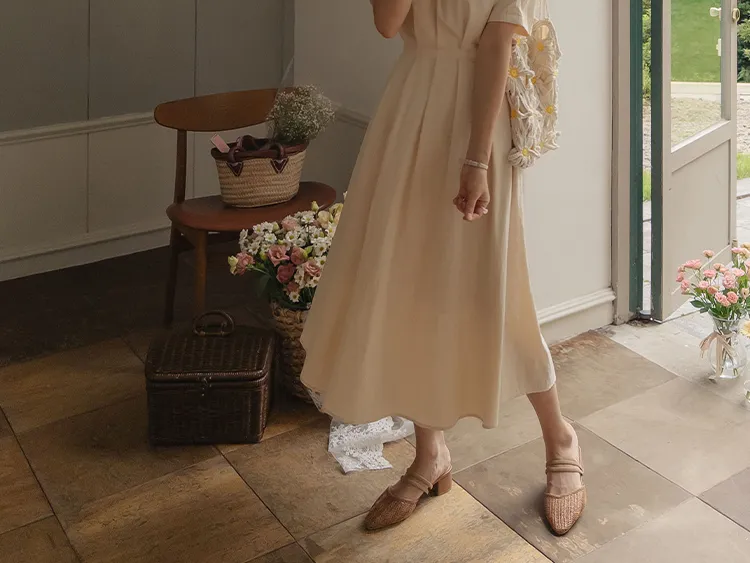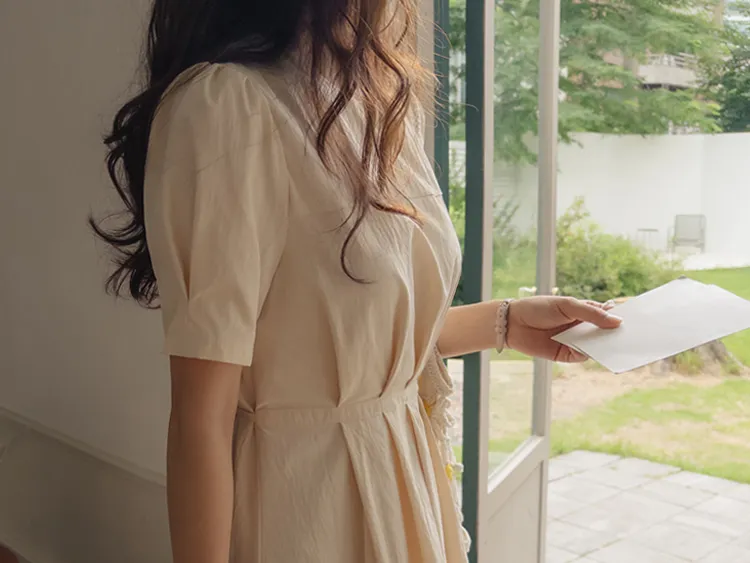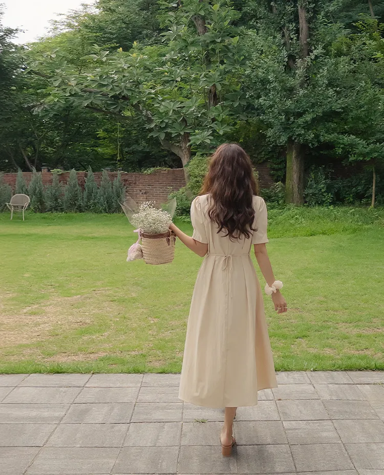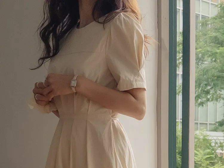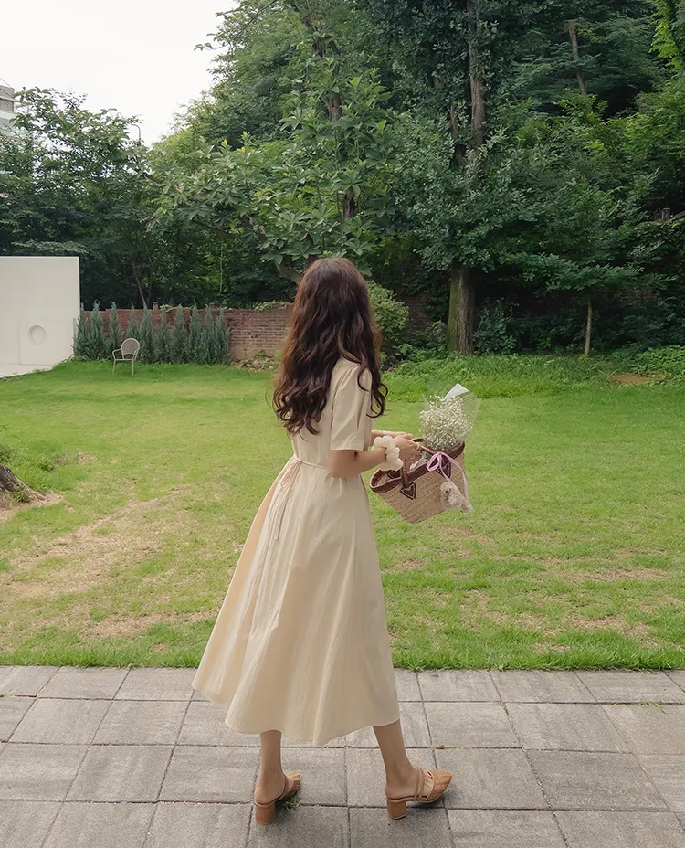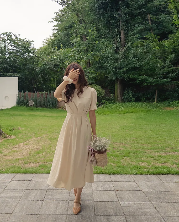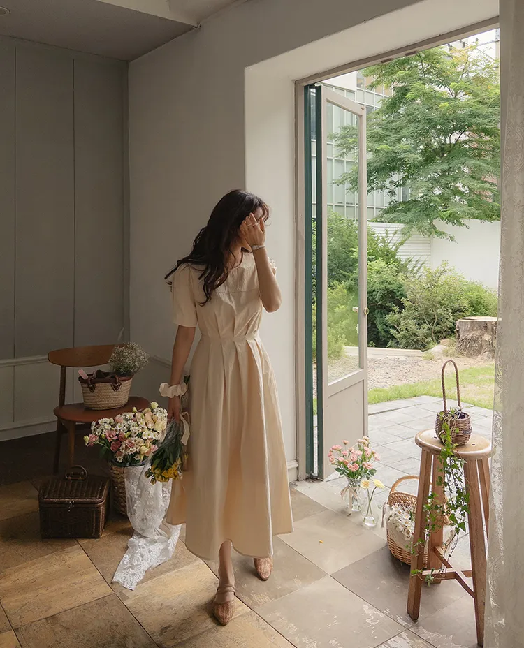 【鬆脆的材質,清新舒適~針褶連身裙♥】【針褶真的很漂亮~】【傘擺A字輪廓有遮蓋身形的效果】【抗皺的連身裙】 【細繩綁帶打造纖細腰線】