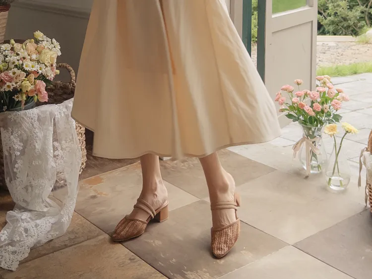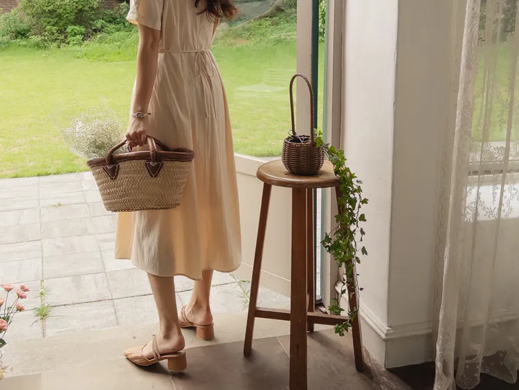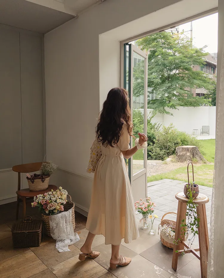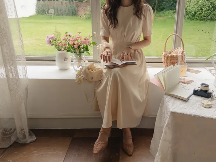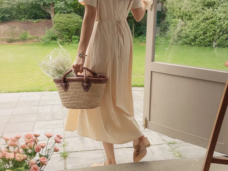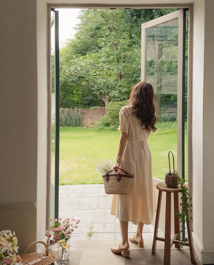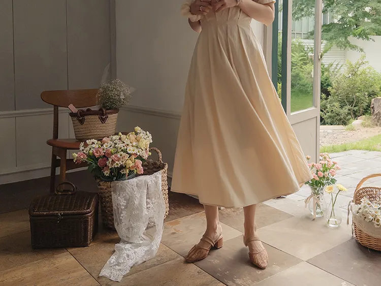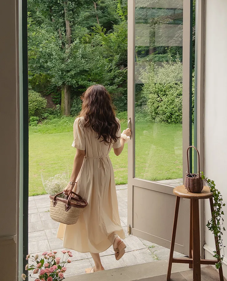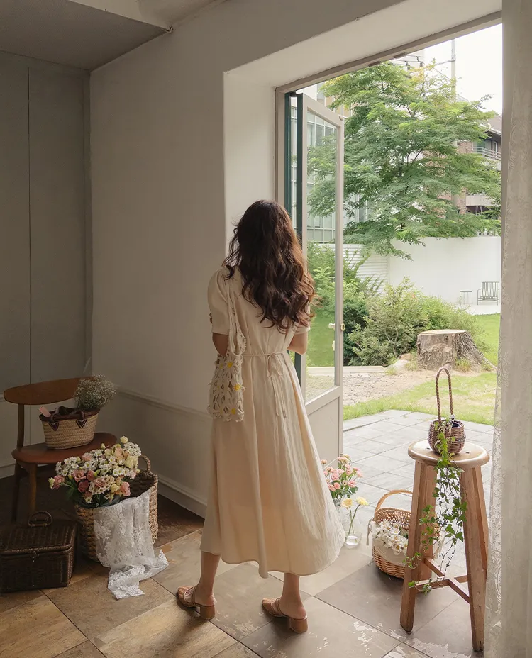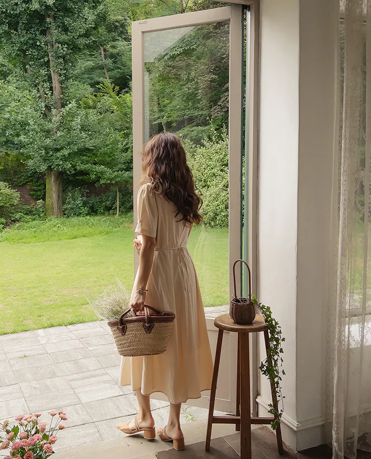 【鬆脆的材質,清新舒適~針褶連身裙♥】【針褶真的很漂亮~】【傘擺A字輪廓有遮蓋身形的效果】【抗皺的連身裙】 【細繩綁帶打造纖細腰線】