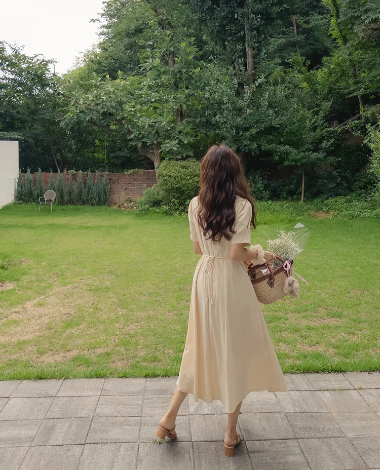 優雅腰線針摺A字輪廓修身後綁帶連身裙