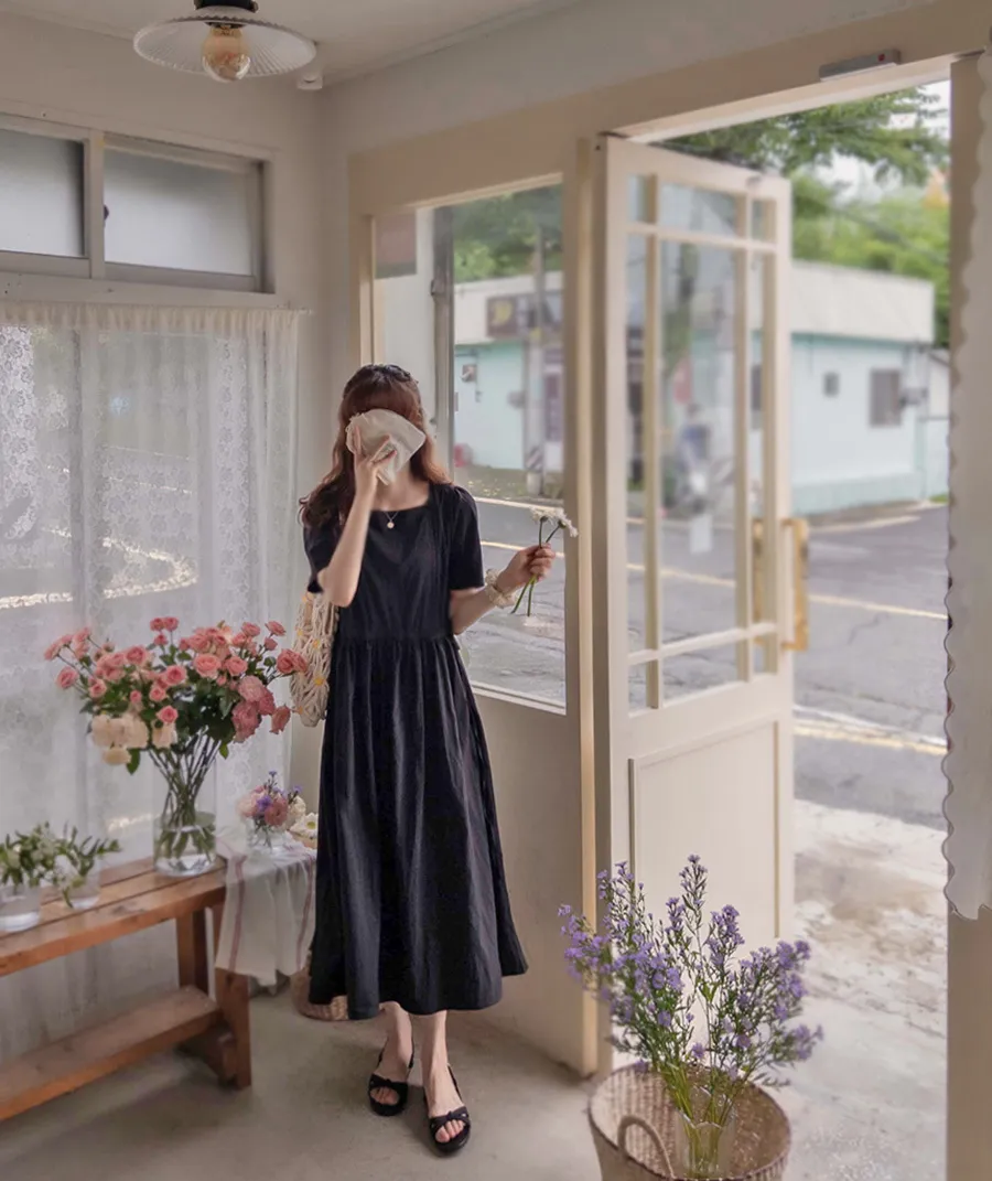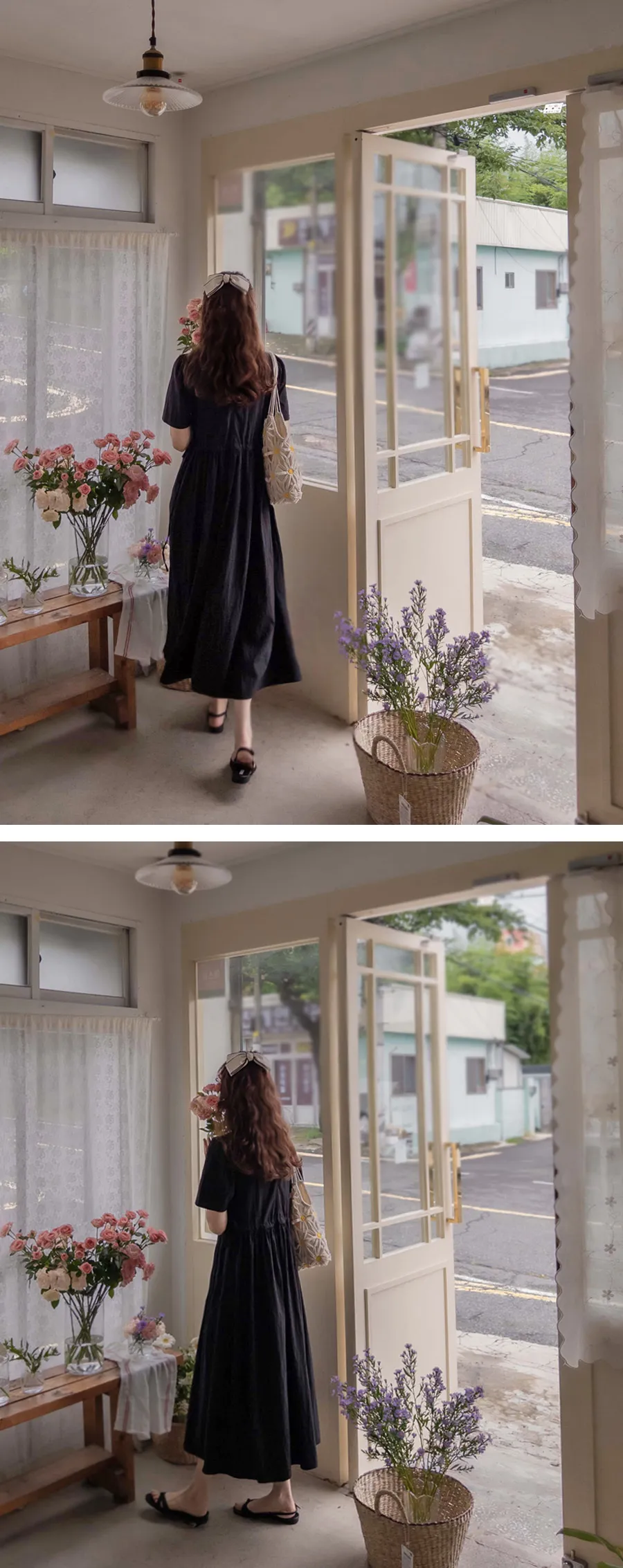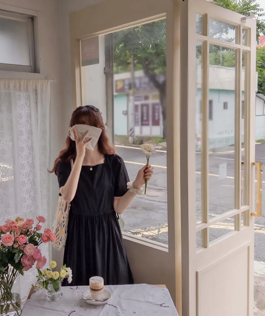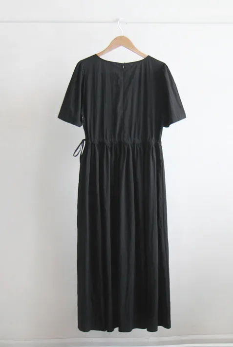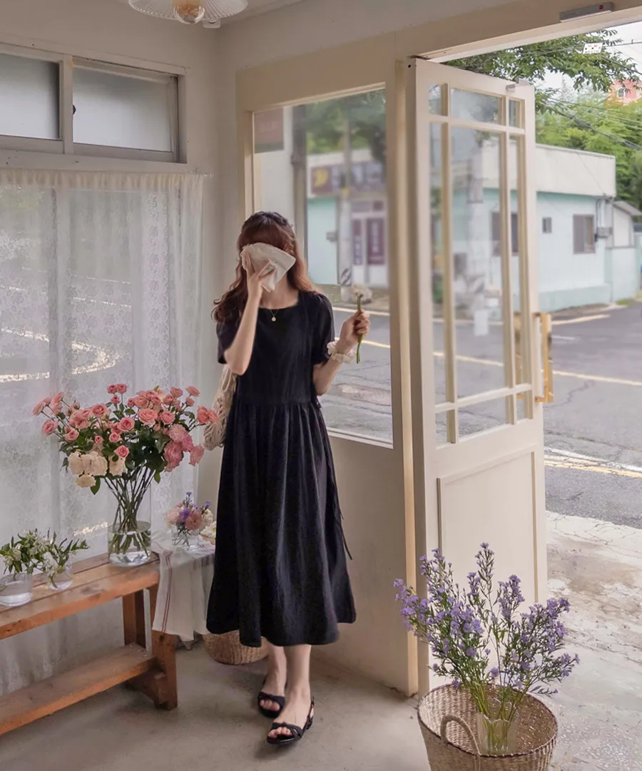 [可綁帶收腰調整身形:連接] [有吸引力的方領] [透過針摺設計營造出歡快的心情] [含有尼龍人造絲的沙沙涼爽夏季面料] [靈活,優雅的合身][由柔韌的夏季材質製成] [用綁帶繫腰部,打造修身邊緣]