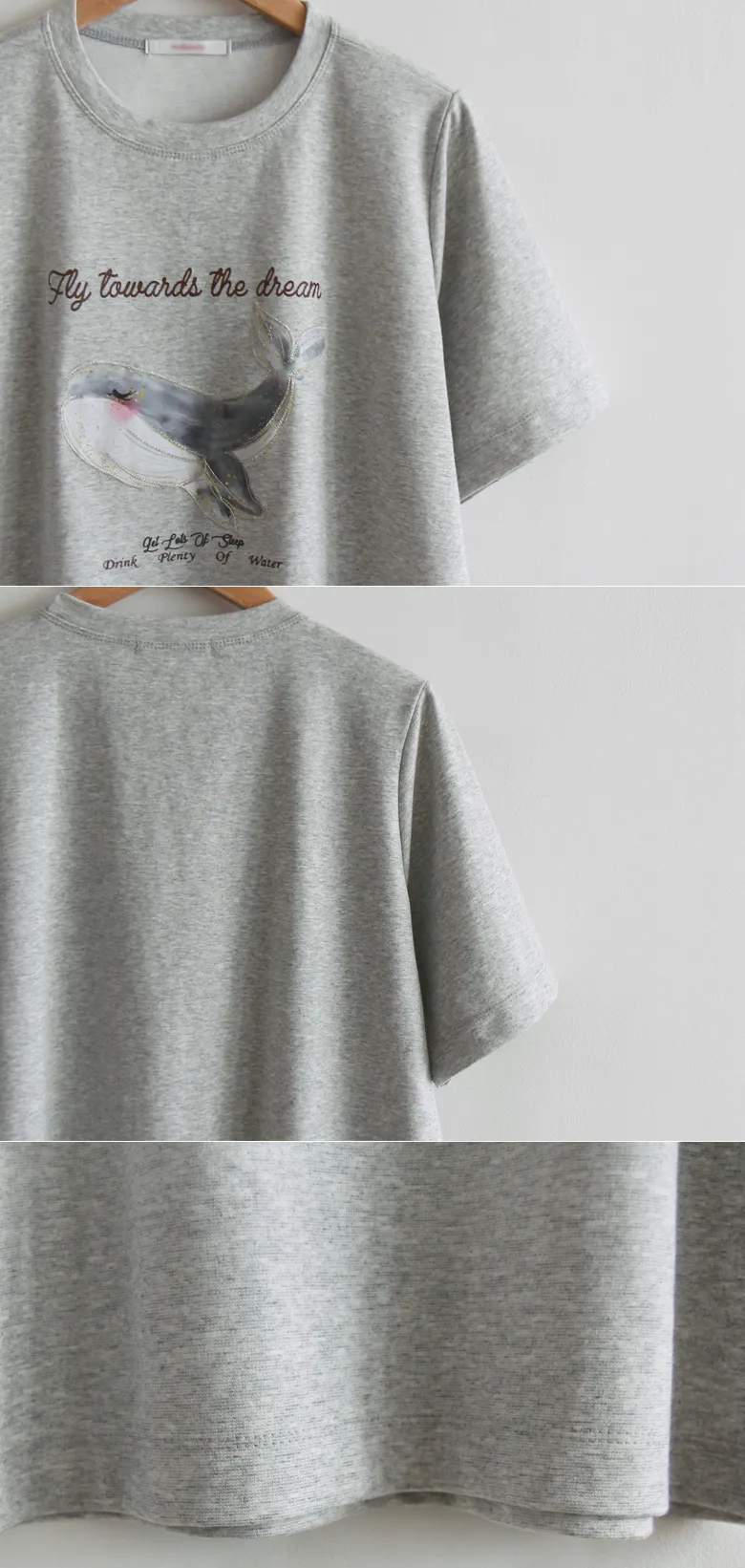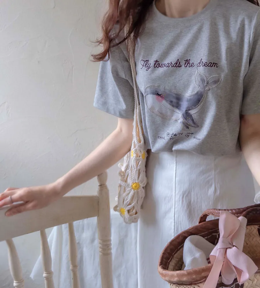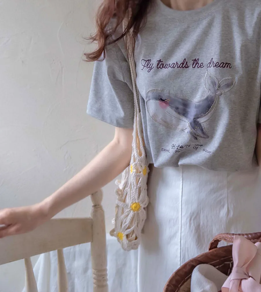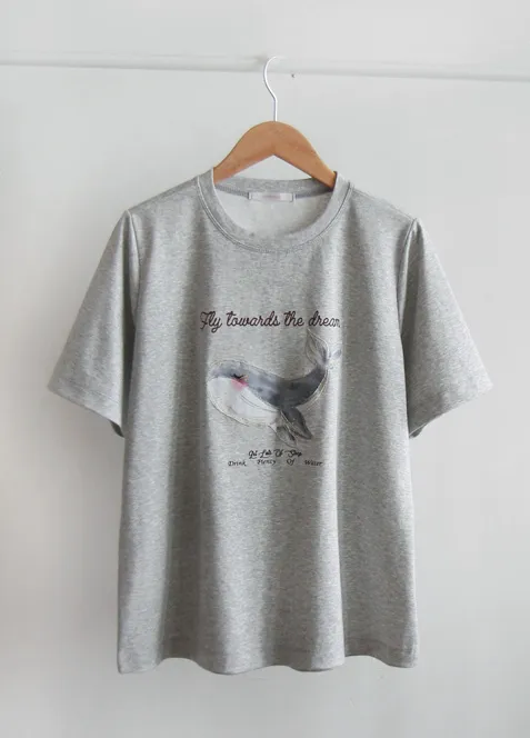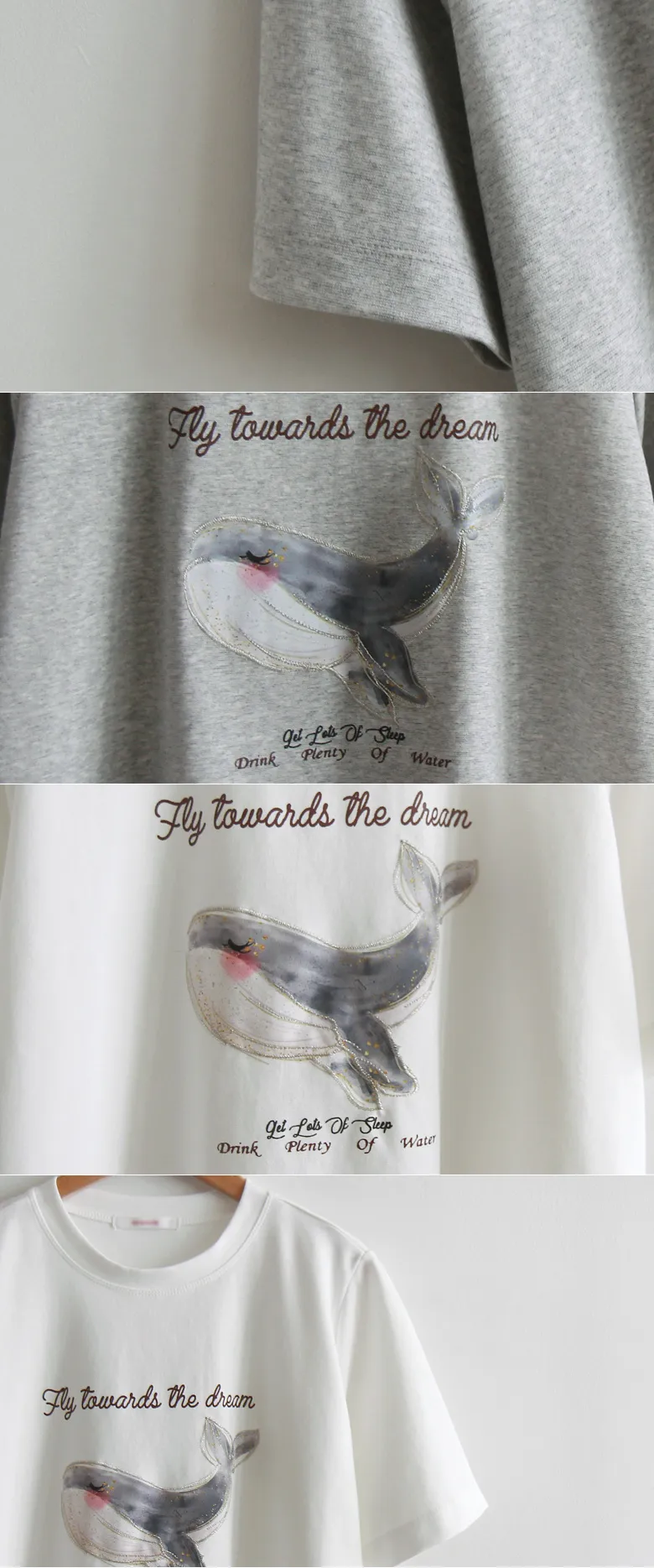 漂亮珍珠感線條可愛鯨魚印花彈性短袖上衣
