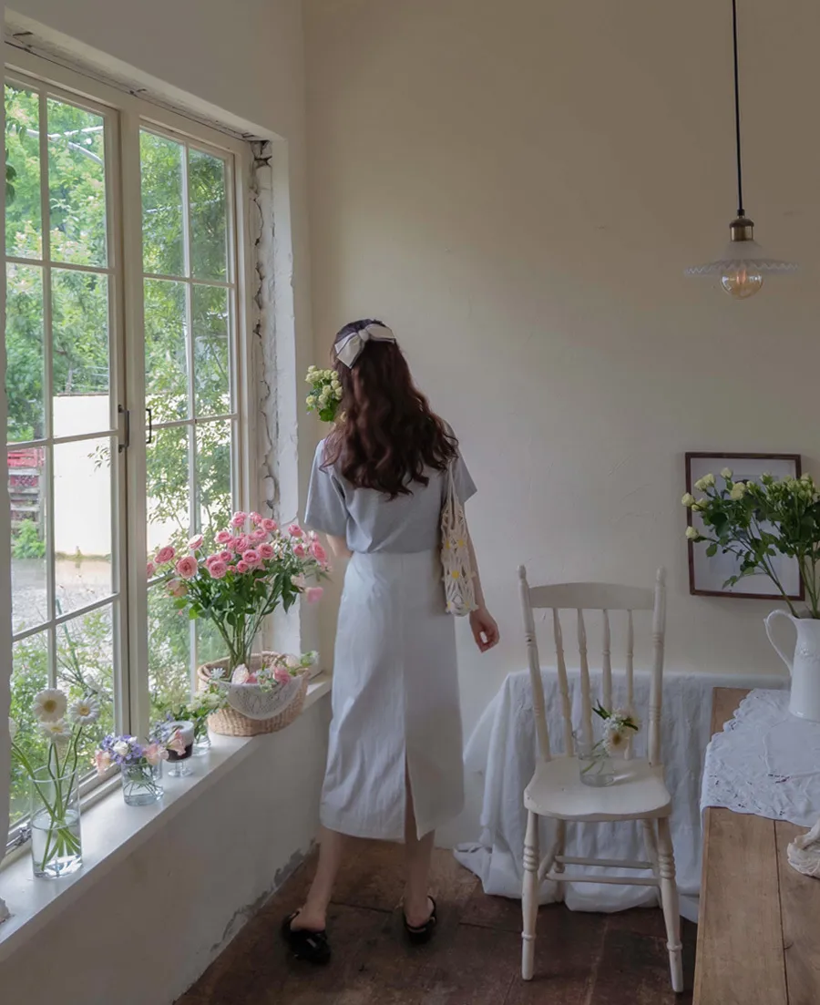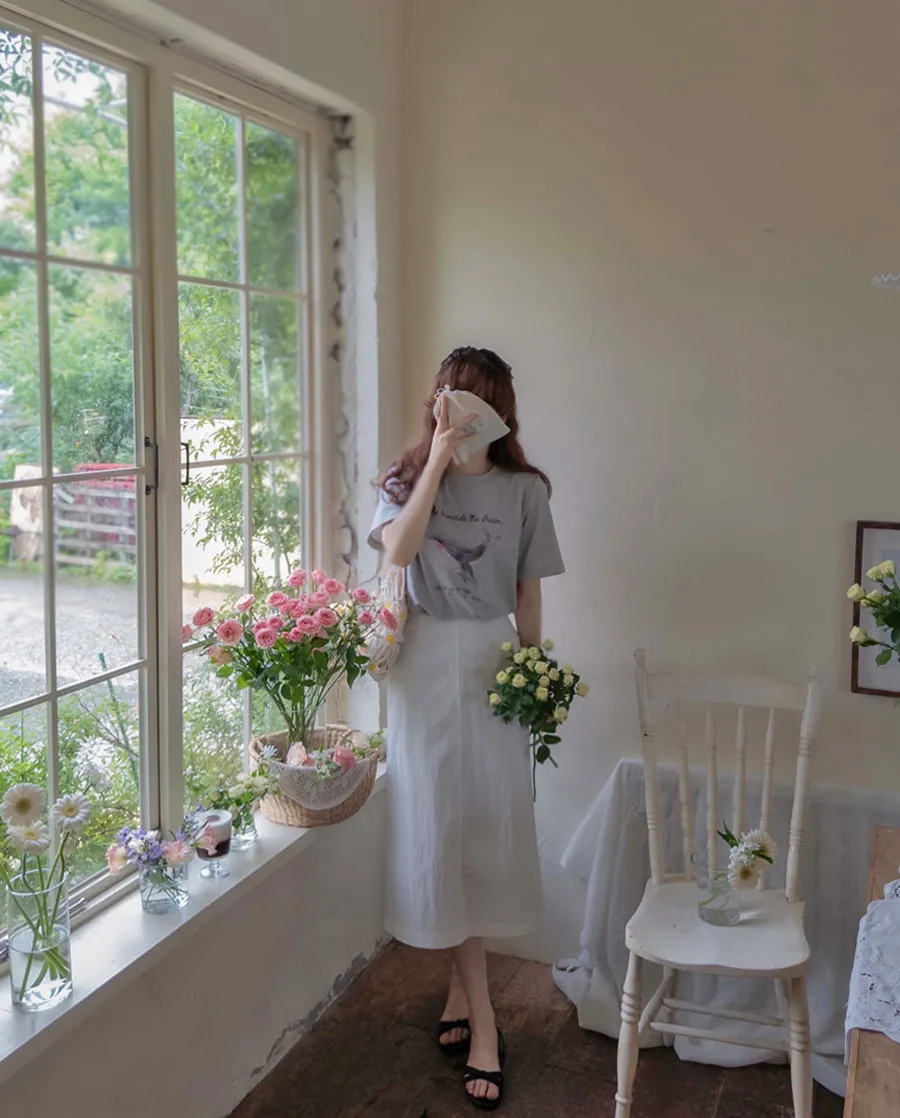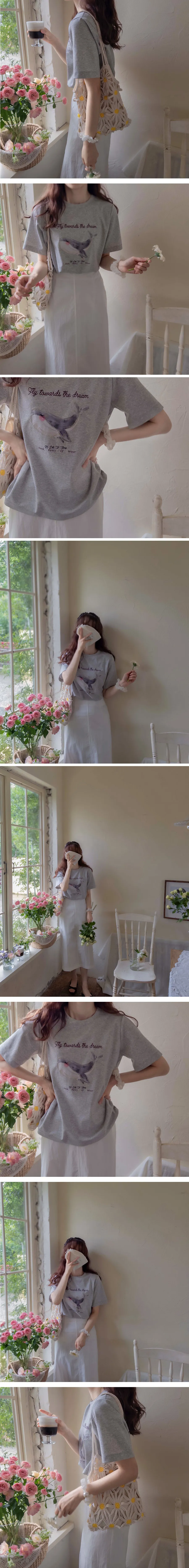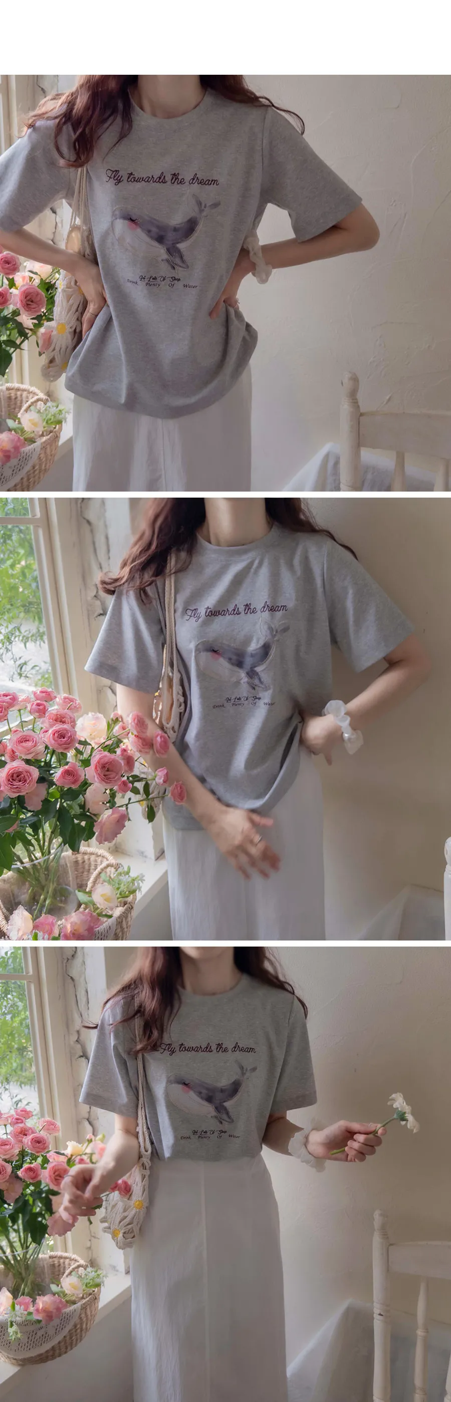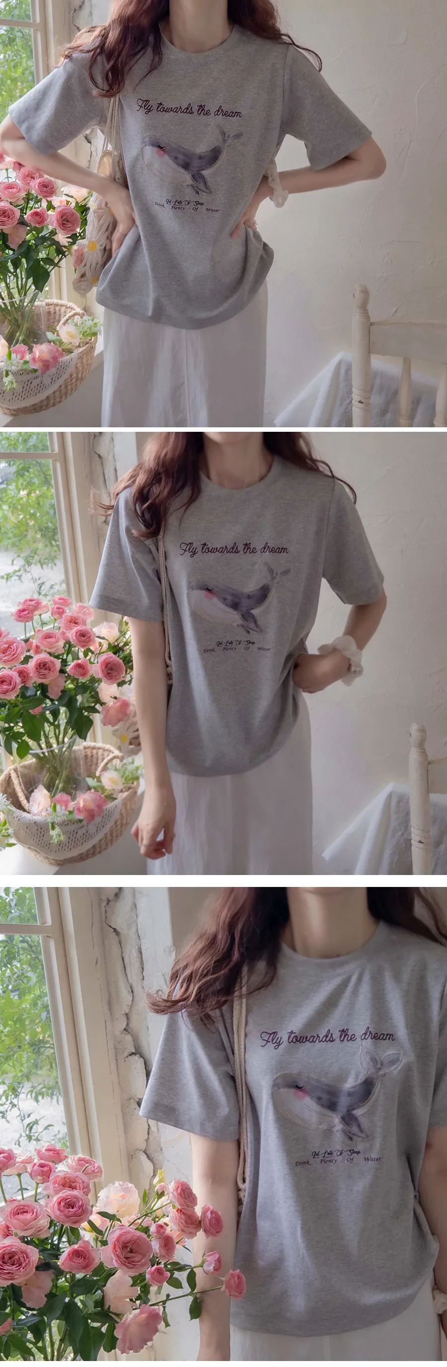 漂亮珍珠感線條可愛鯨魚印花彈性短袖上衣