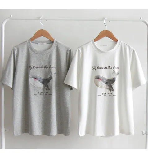[舒適貼合,含有5% 氨綸有彈性的上衣] [品牌品質] [可愛的鯨魚和刻字是重點] [夏季T 卹,具有良好的彈性