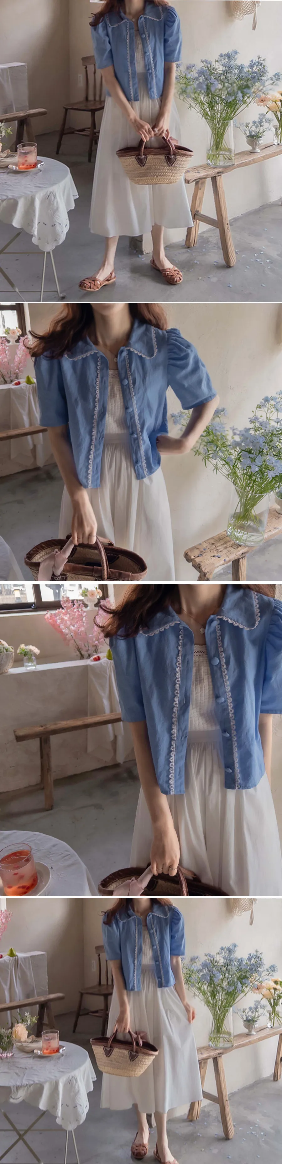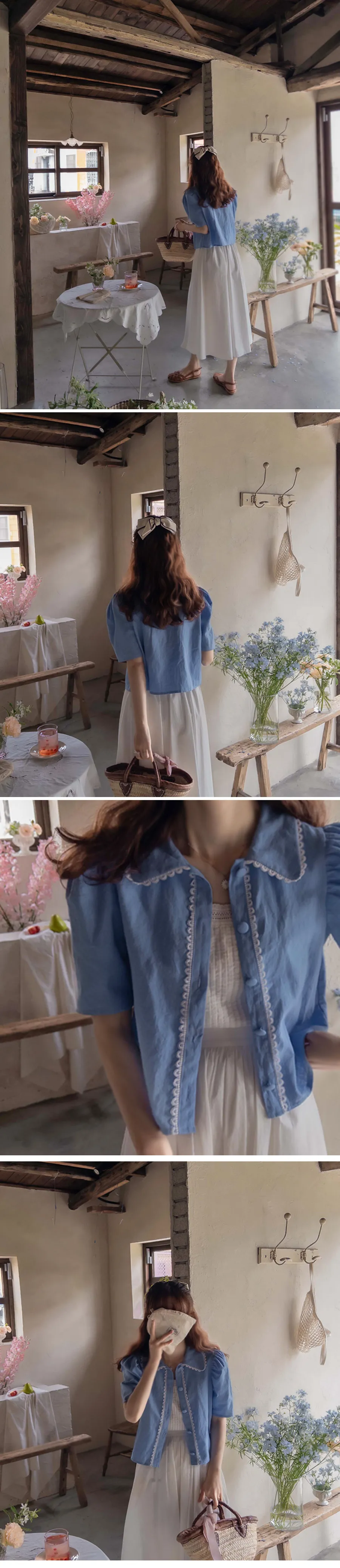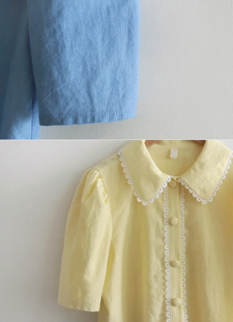 [含有亞麻夏季材質] [既可以用作外衣,也可以用作上衣穿搭] [含有 85% 亞麻的夏季材質] [領子和鈕扣上有花邊的排扣] [共肩泡泡袖.與袖子形成漂亮的線條]【給人清新優雅的感覺】