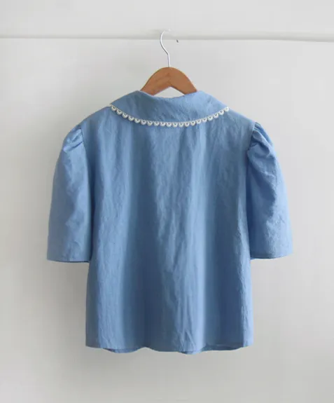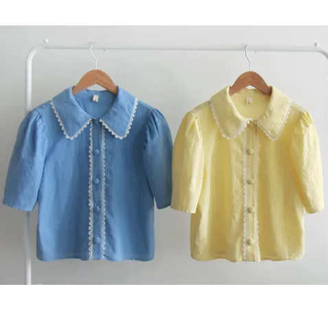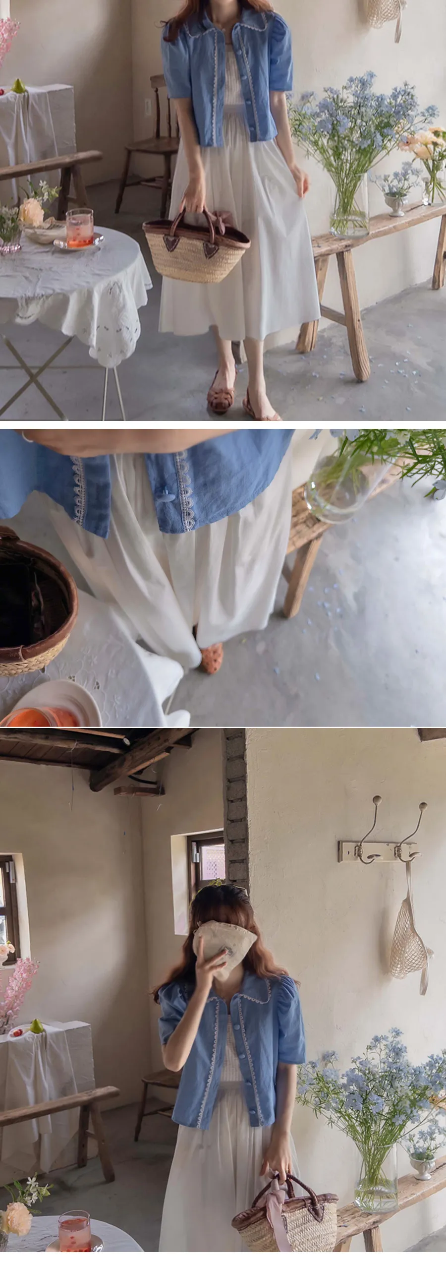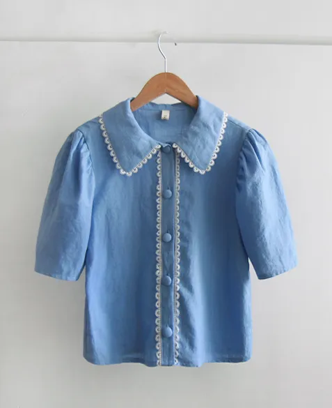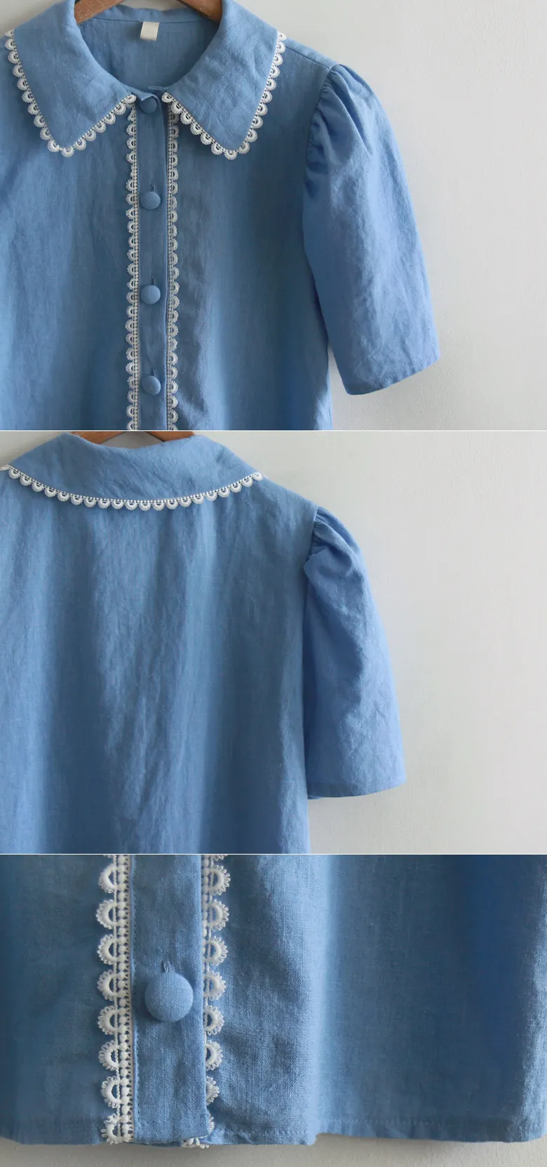 [含有亞麻夏季材質] [既可以用作外衣,也可以用作上衣穿搭] [含有 85% 亞麻的夏季材質] [領子和鈕扣上有花邊的排扣] [共肩泡泡袖.與袖子形成漂亮的線條]【給人清新優雅的感覺】