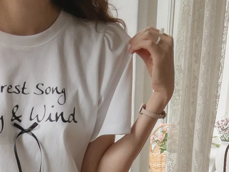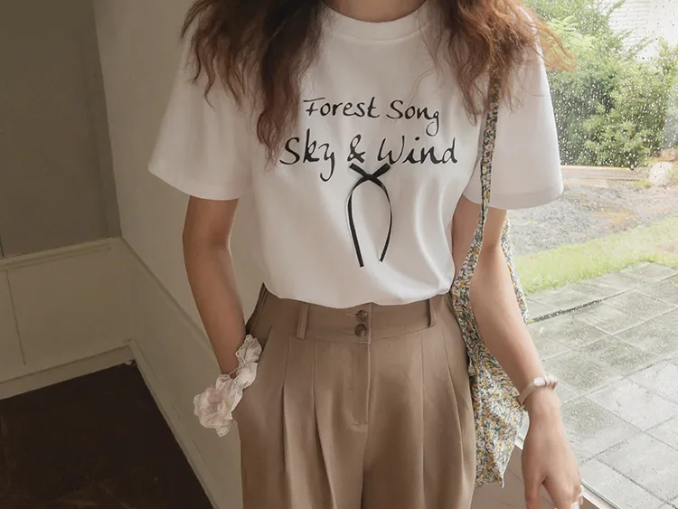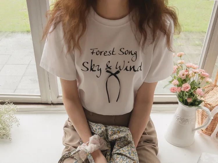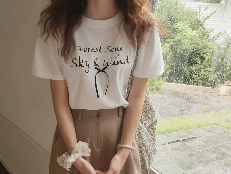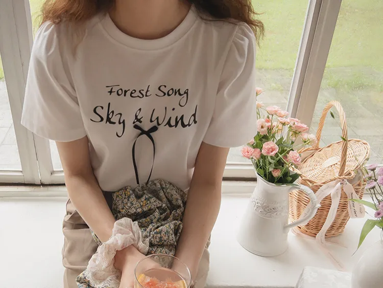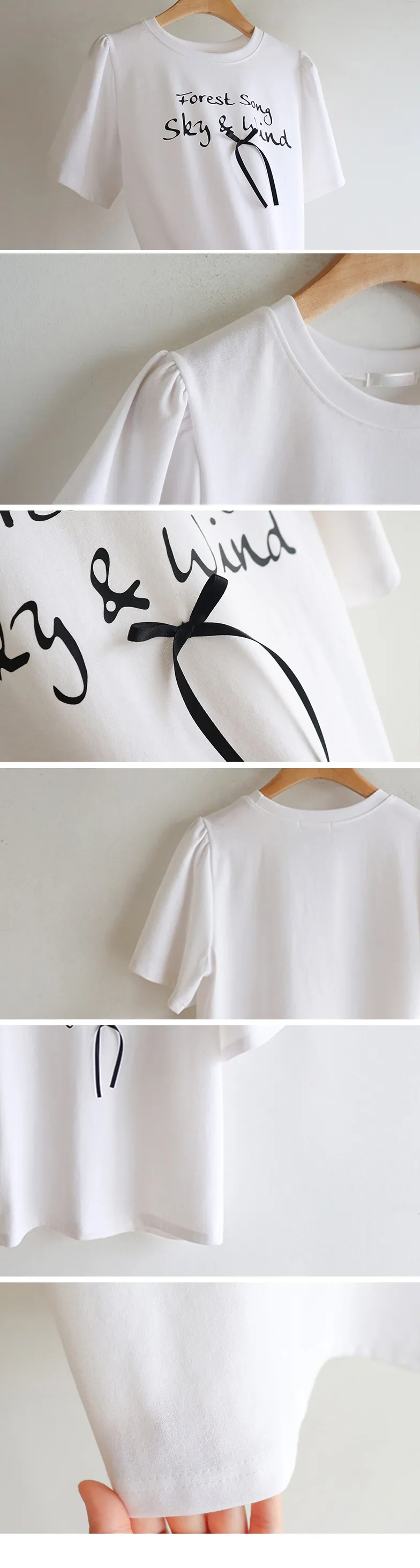 可愛氛圍字母印花點綴立體蝴蝶結肩線剪裁短袖上衣