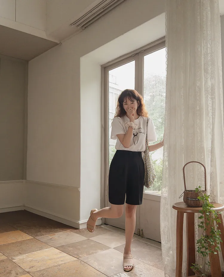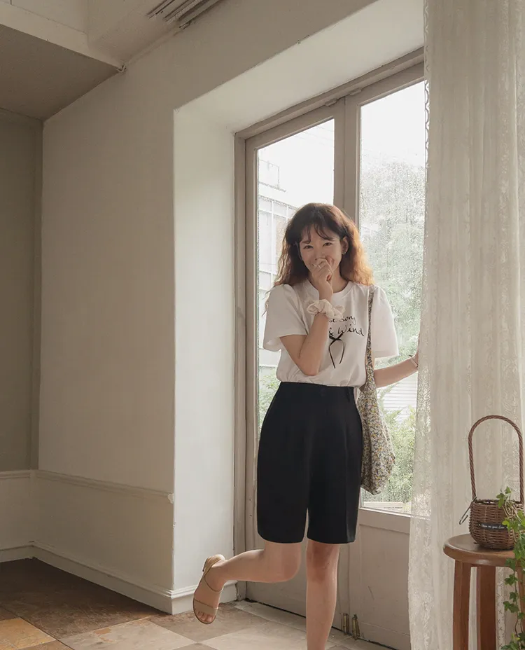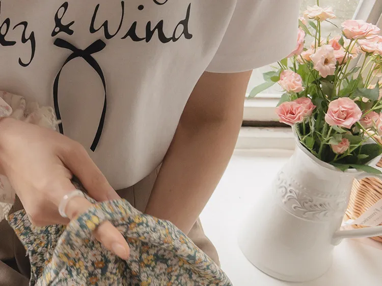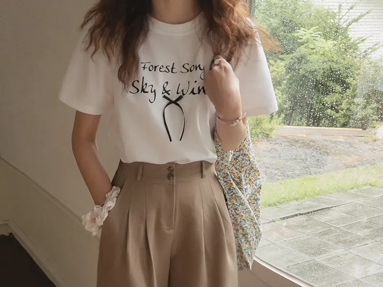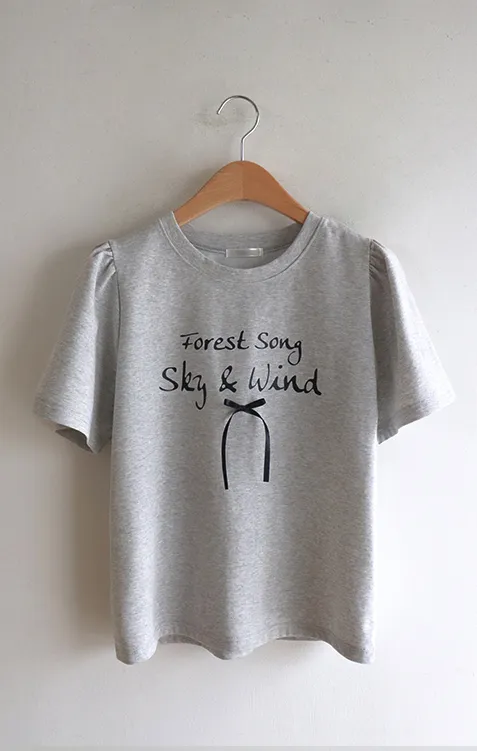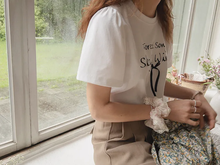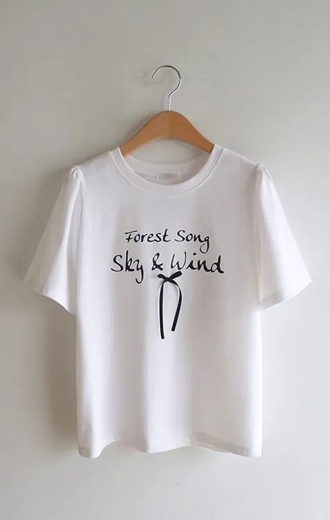 可愛氛圍字母印花點綴立體蝴蝶結肩線剪裁短袖上衣