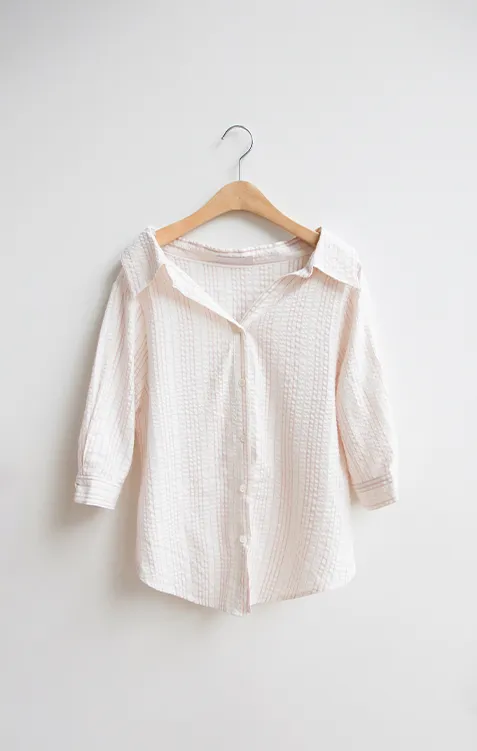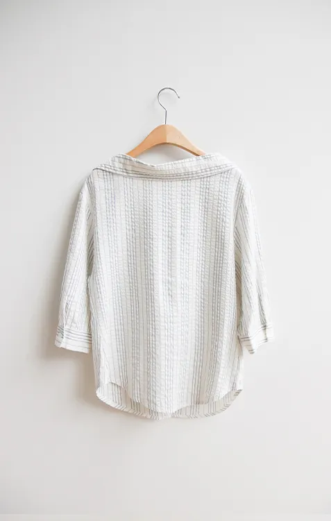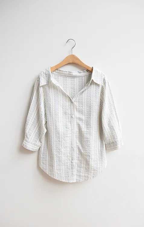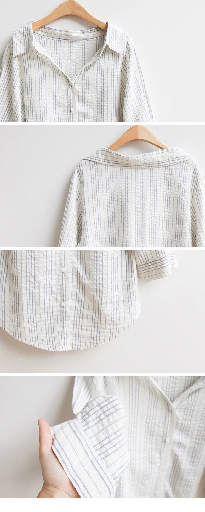 【條紋圖案與褶皺材質充滿酷感的襯衫】【褶皺材質涼爽舒適】【開領增添時尚感,條紋圖案減少沉悶:)】