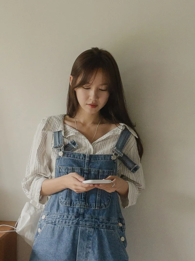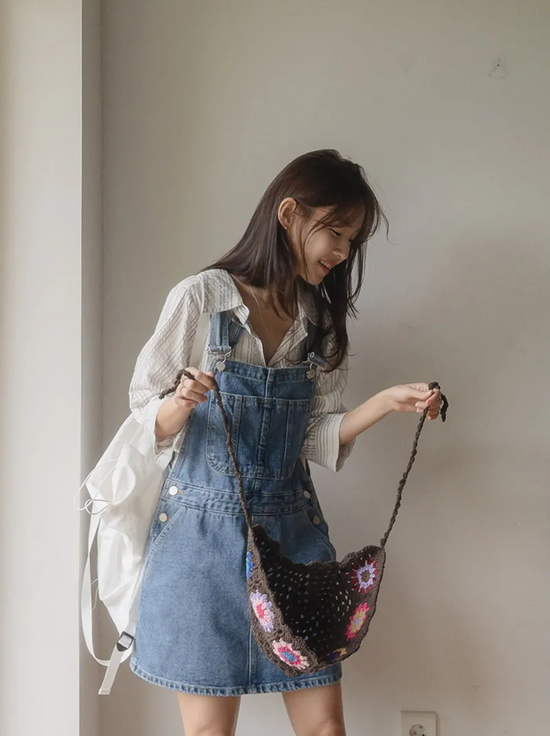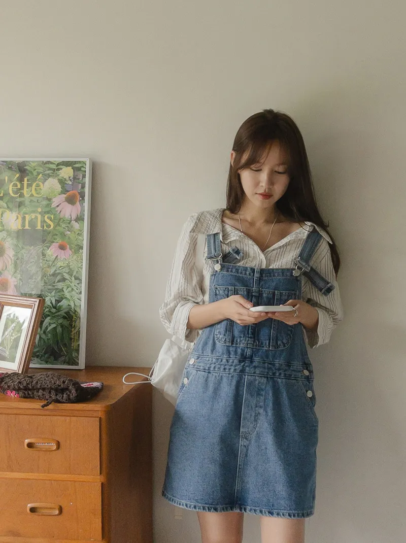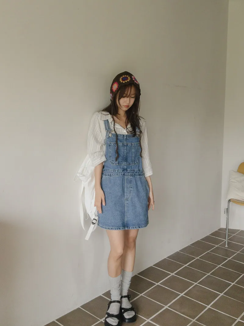 可愛口袋設計肩帶可條吊帶牛仔連身裙