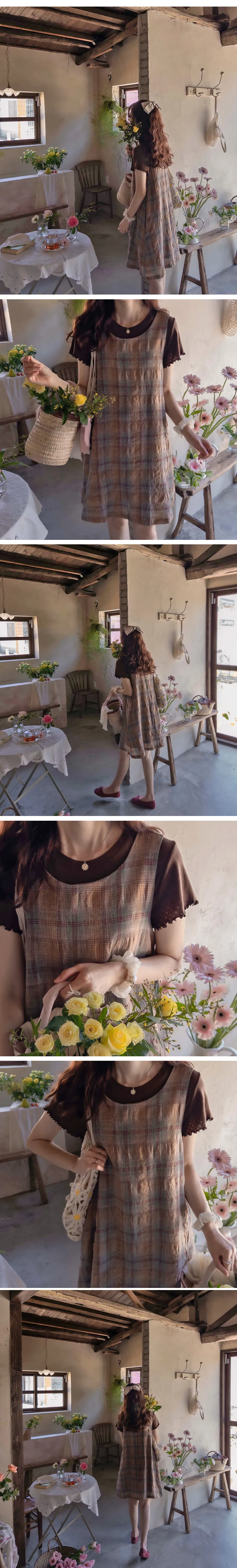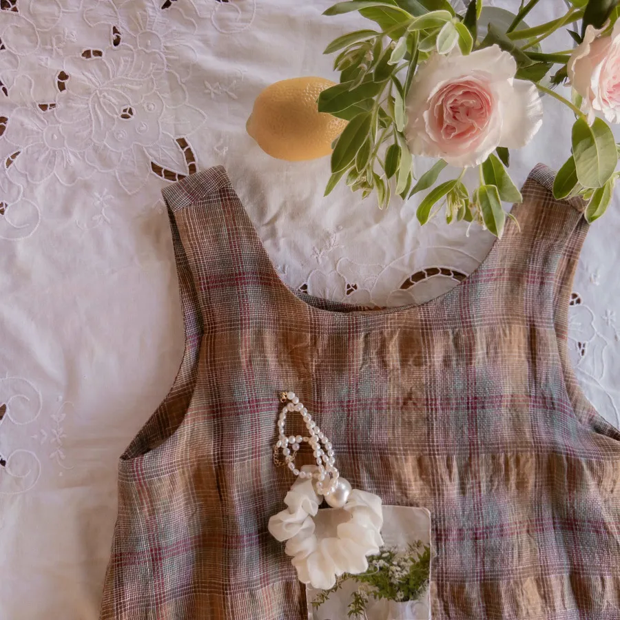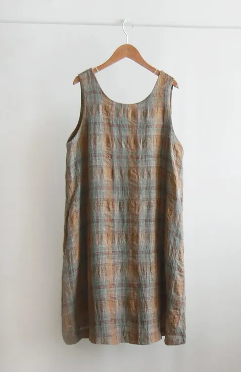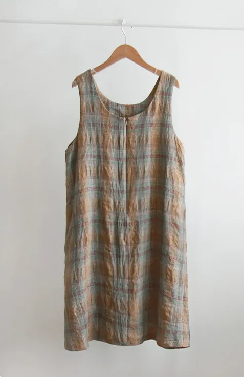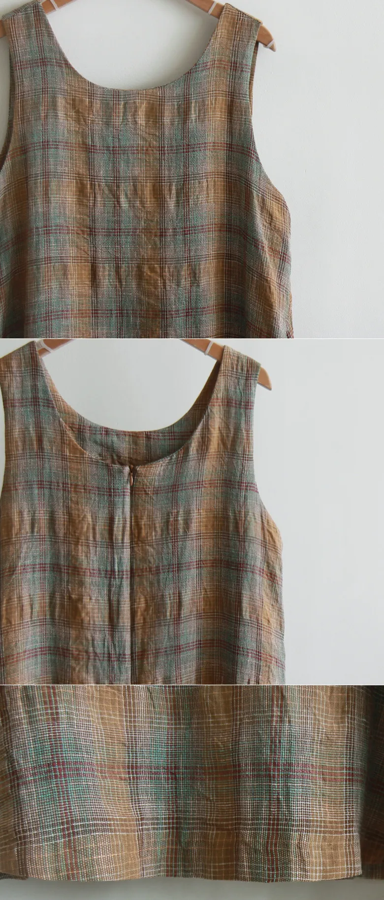 [聚酯襯裡] [背面拉鍊結構] [精緻的格子圖案] [採用涼爽亞麻製成的時尚邊緣合身連身裙] [適合夏季日常穿著] [亞麻格紋連身裙